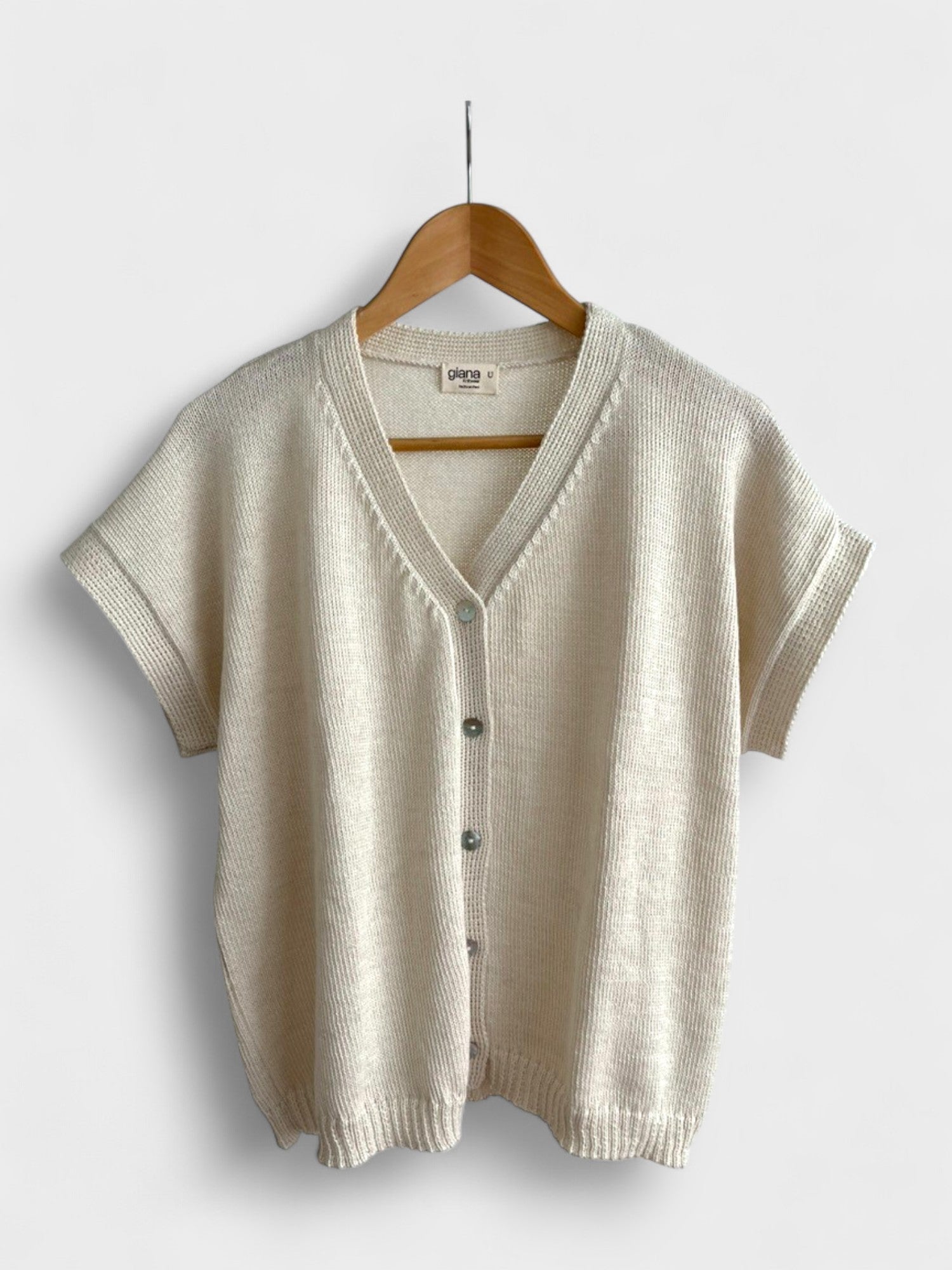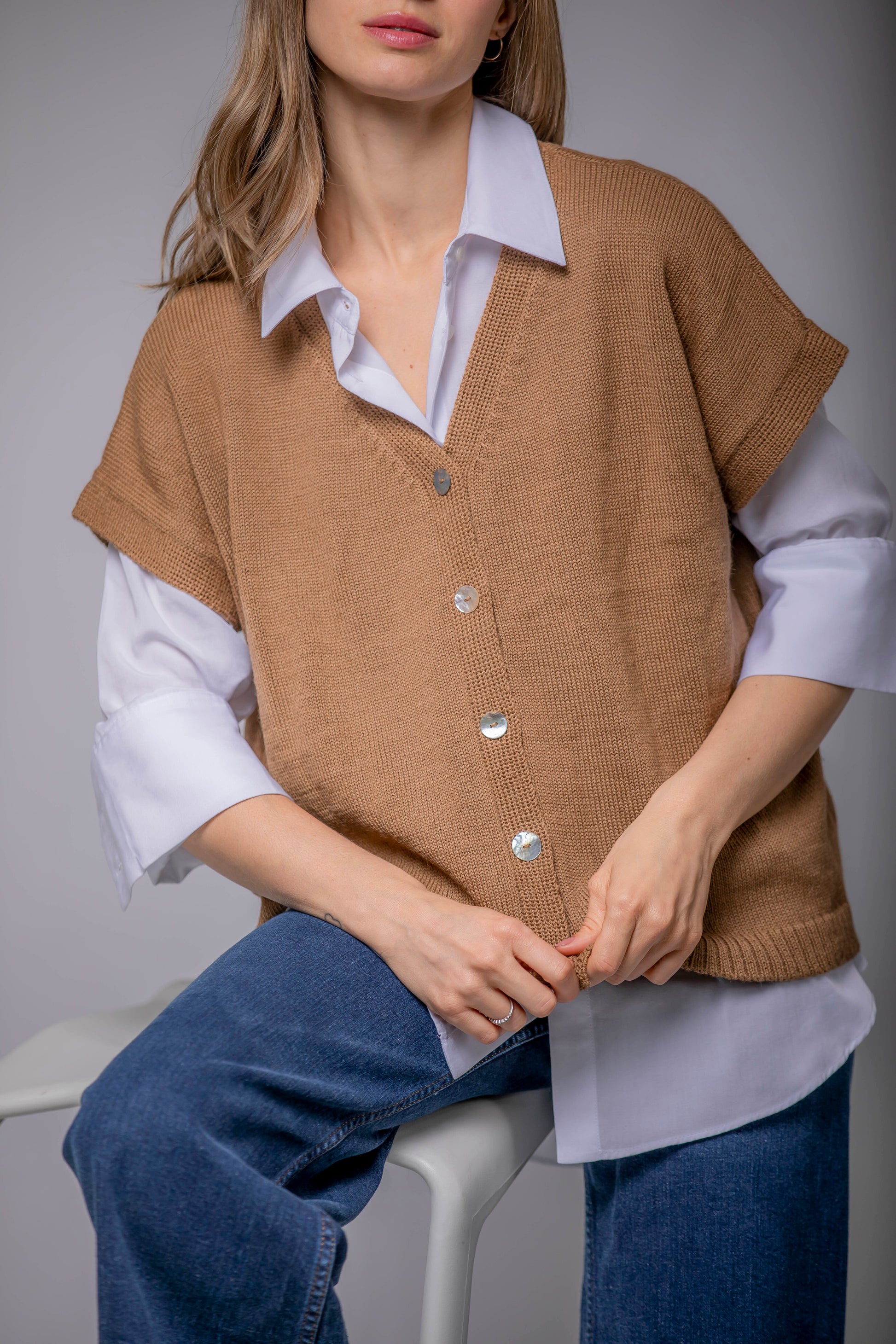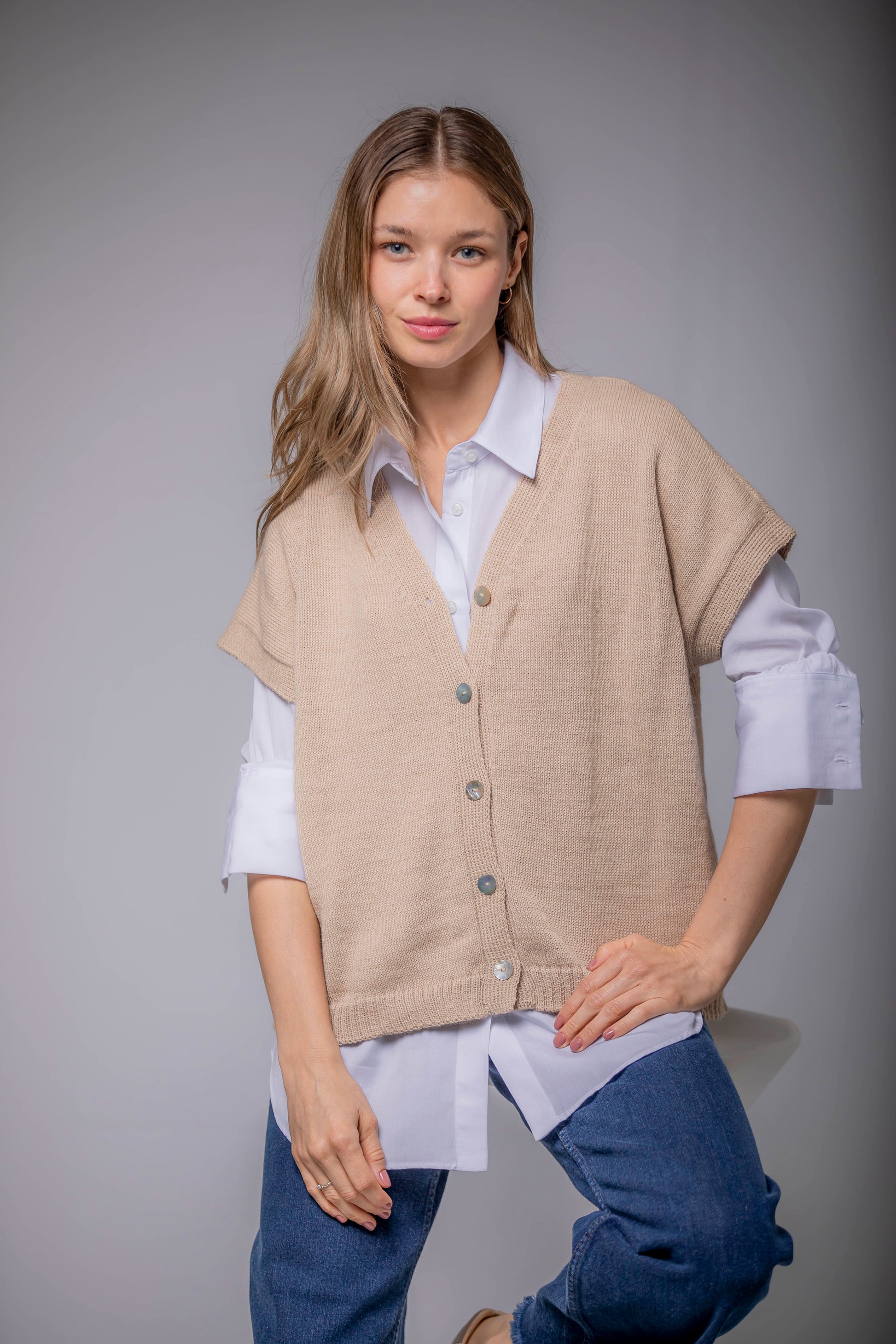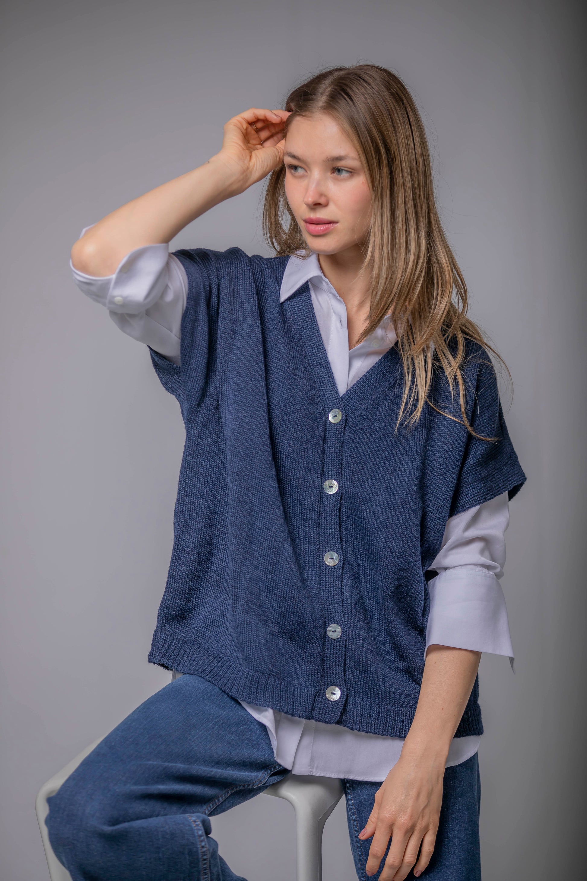Un clásico reeditado con el sello GIANA. El chaleco Atria está tejido en Baby Alpaca pura, con una caída suave y un tacto ligero. Su escote en V y botones de nácar aportan un aire atemporal, mientras que su silueta amplia permite múltiples formas de uso: solo, como top, o sobre una blusa como en la imagen.