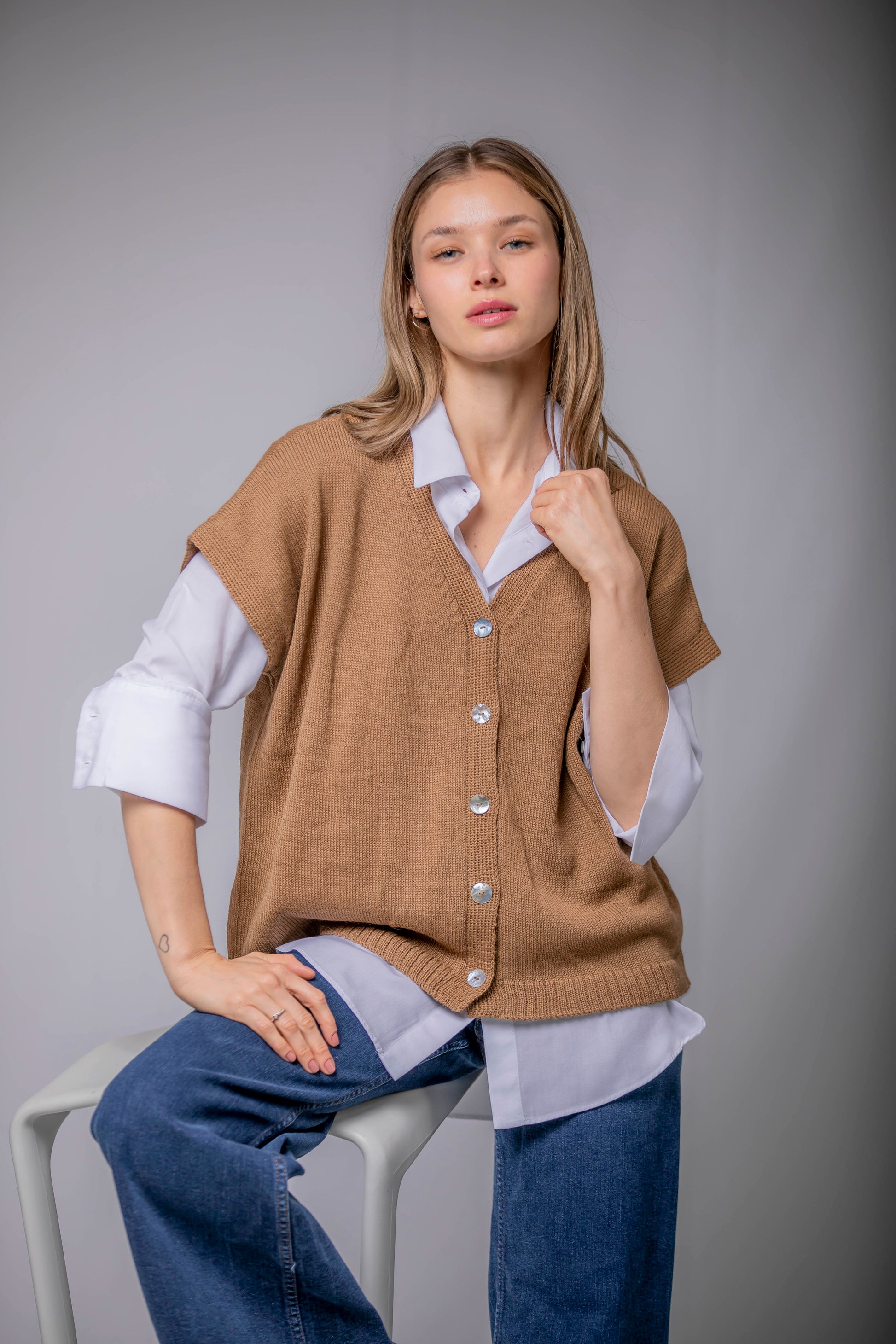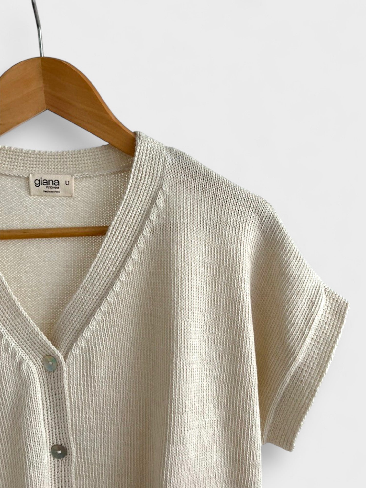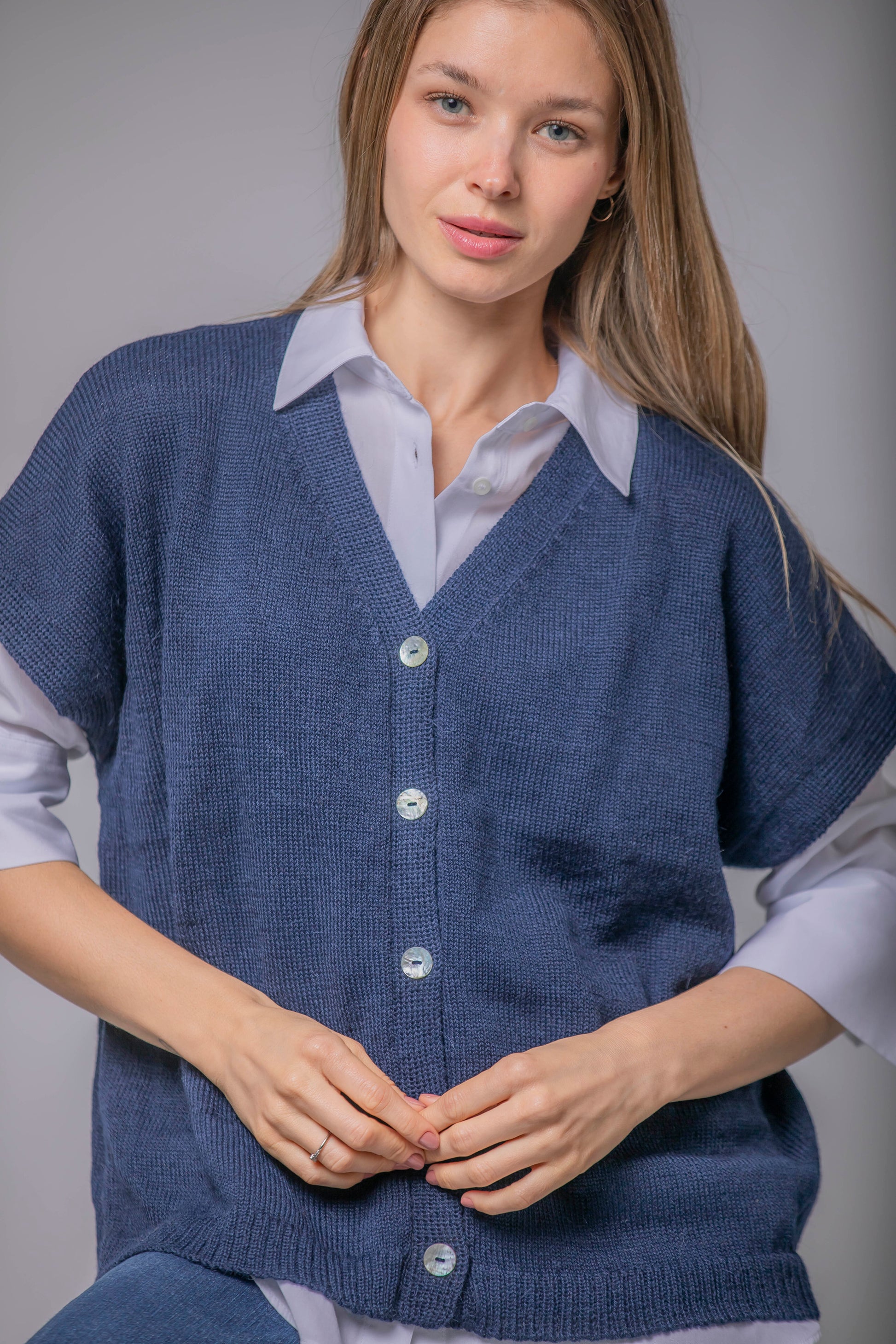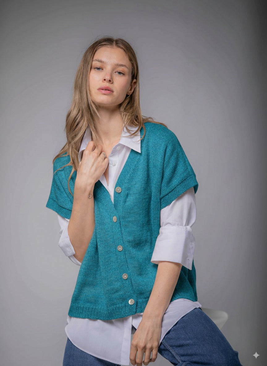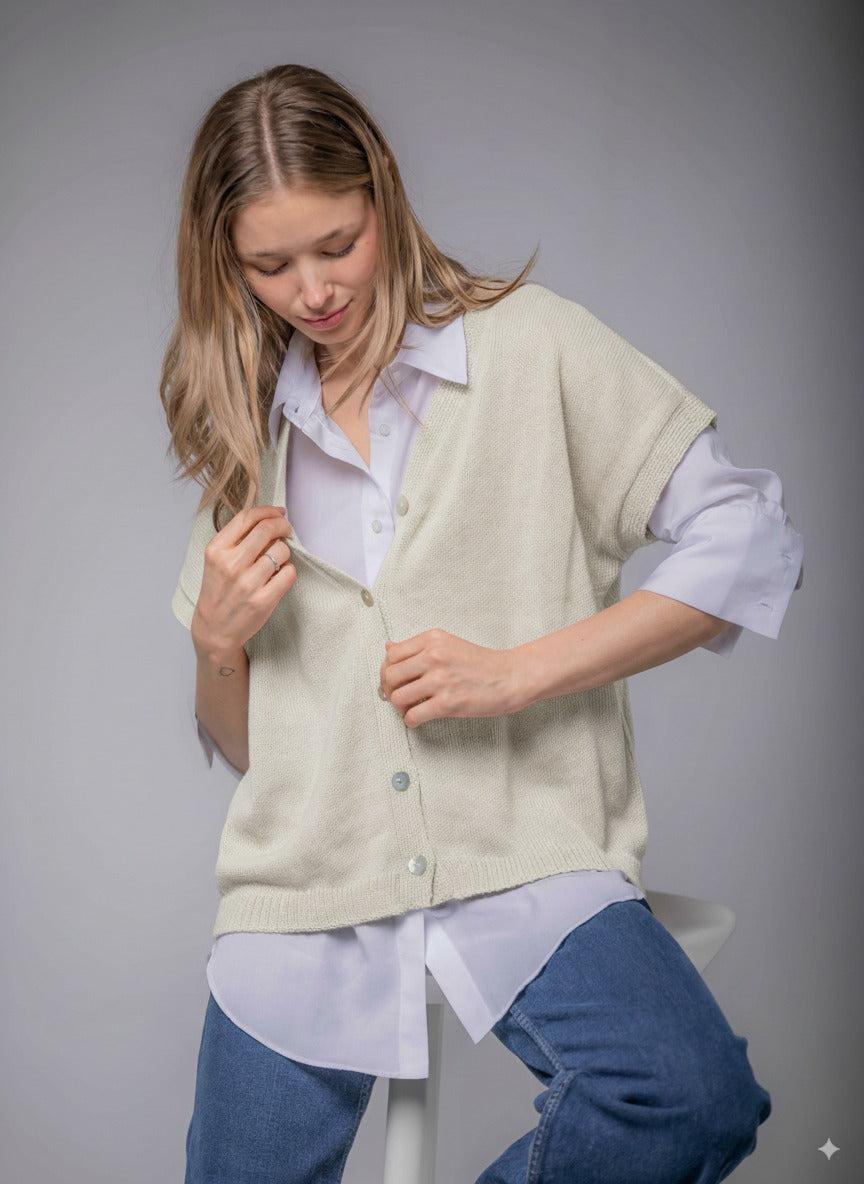 Un clásico reeditado con el sello GIANA. El chaleco Atria está tejido en Baby Alpaca pura, con una caída suave y un tacto ligero. Su escote en V y botones de nácar aportan un aire atemporal, mientras que su silueta amplia permite múltiples formas de uso: solo, como top, o sobre una blusa como en la imagen.