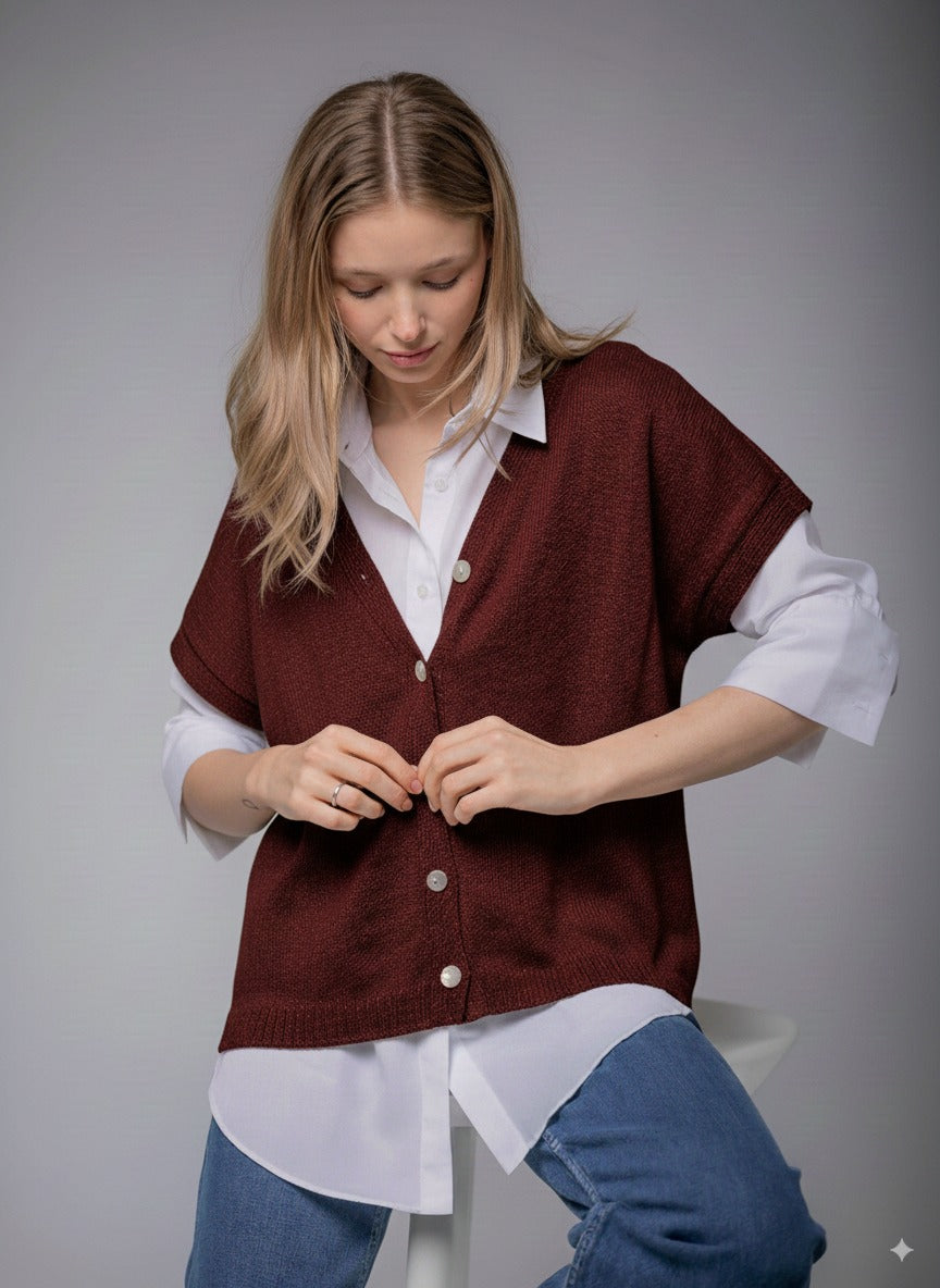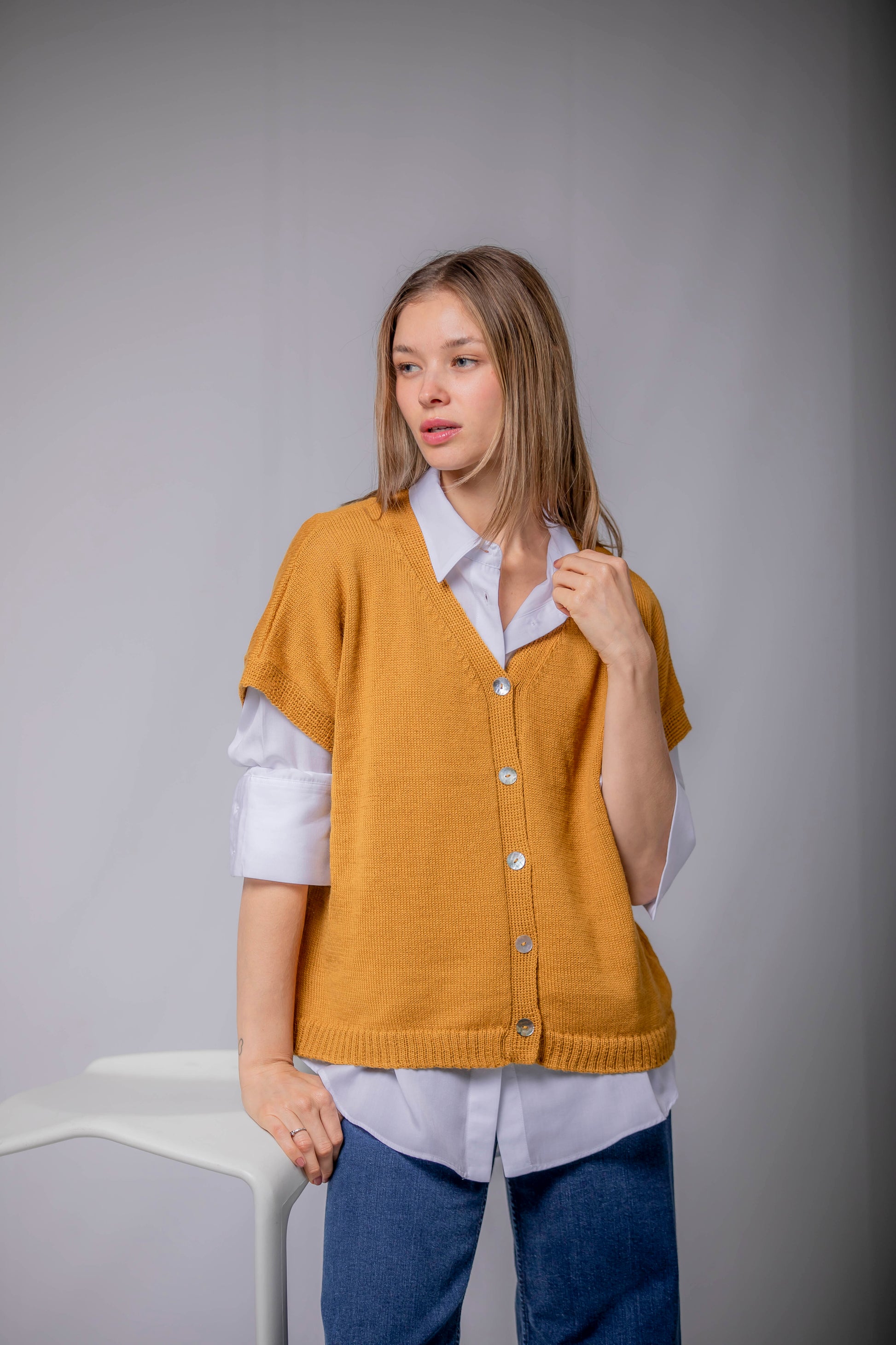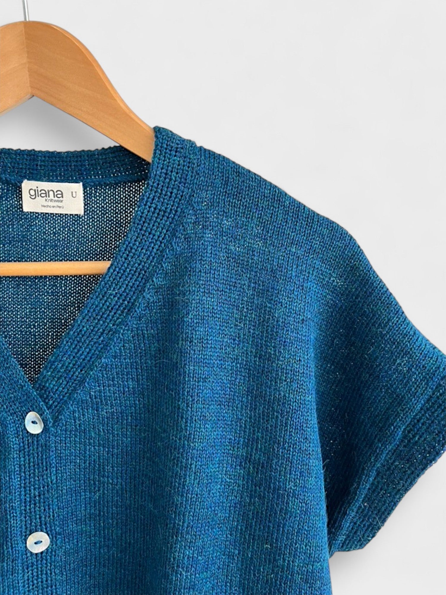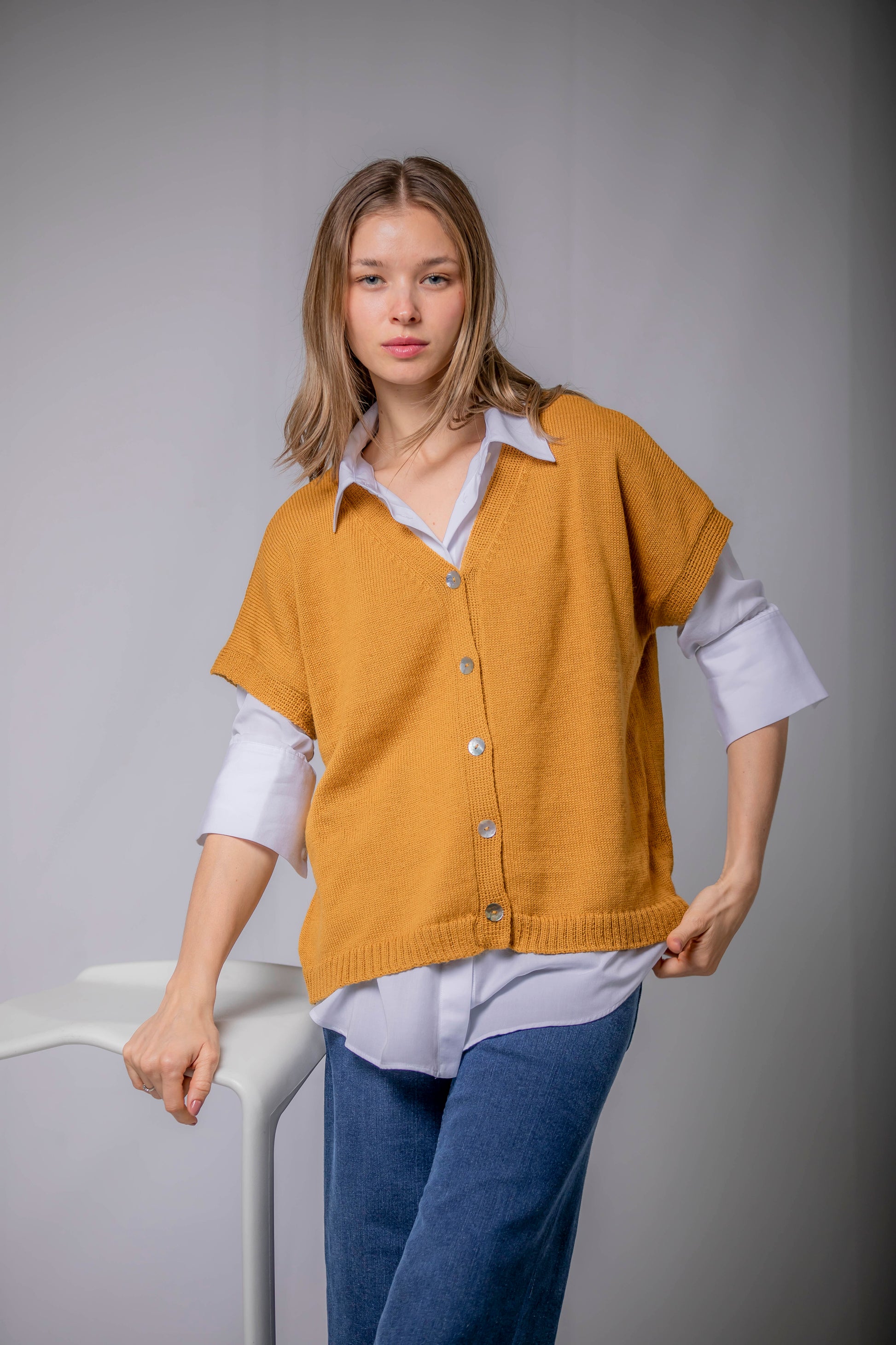 Un clásico reeditado con el sello GIANA. El chaleco Atria está tejido en Baby Alpaca pura, con una caída suave y un tacto ligero. Su escote en V y botones de nácar aportan un aire atemporal, mientras que su silueta amplia permite múltiples formas de uso: solo, como top, o sobre una blusa como en la imagen.
