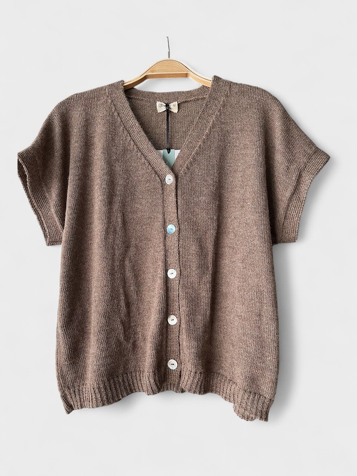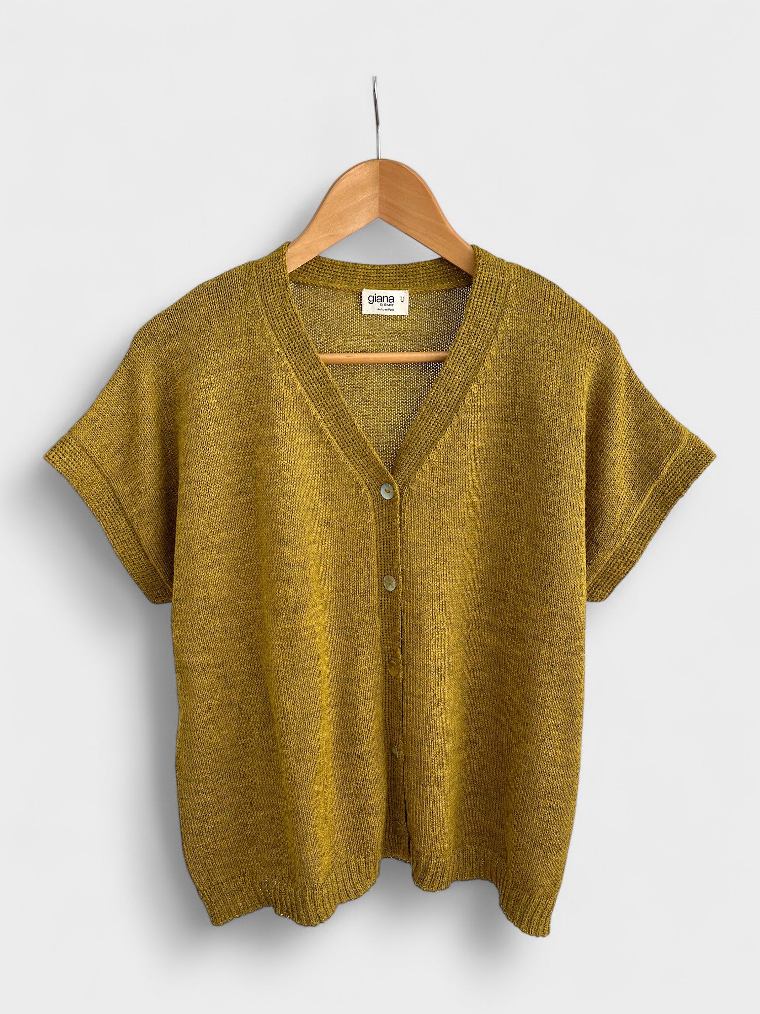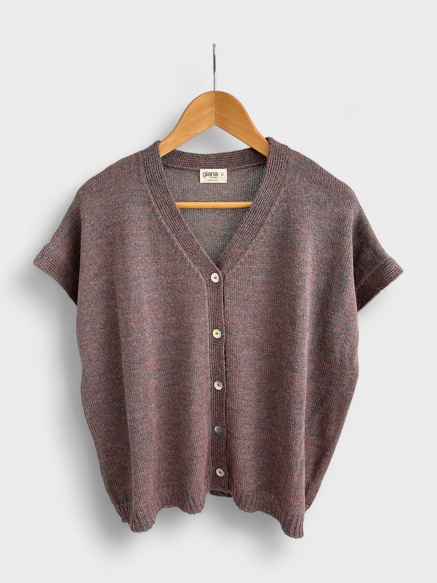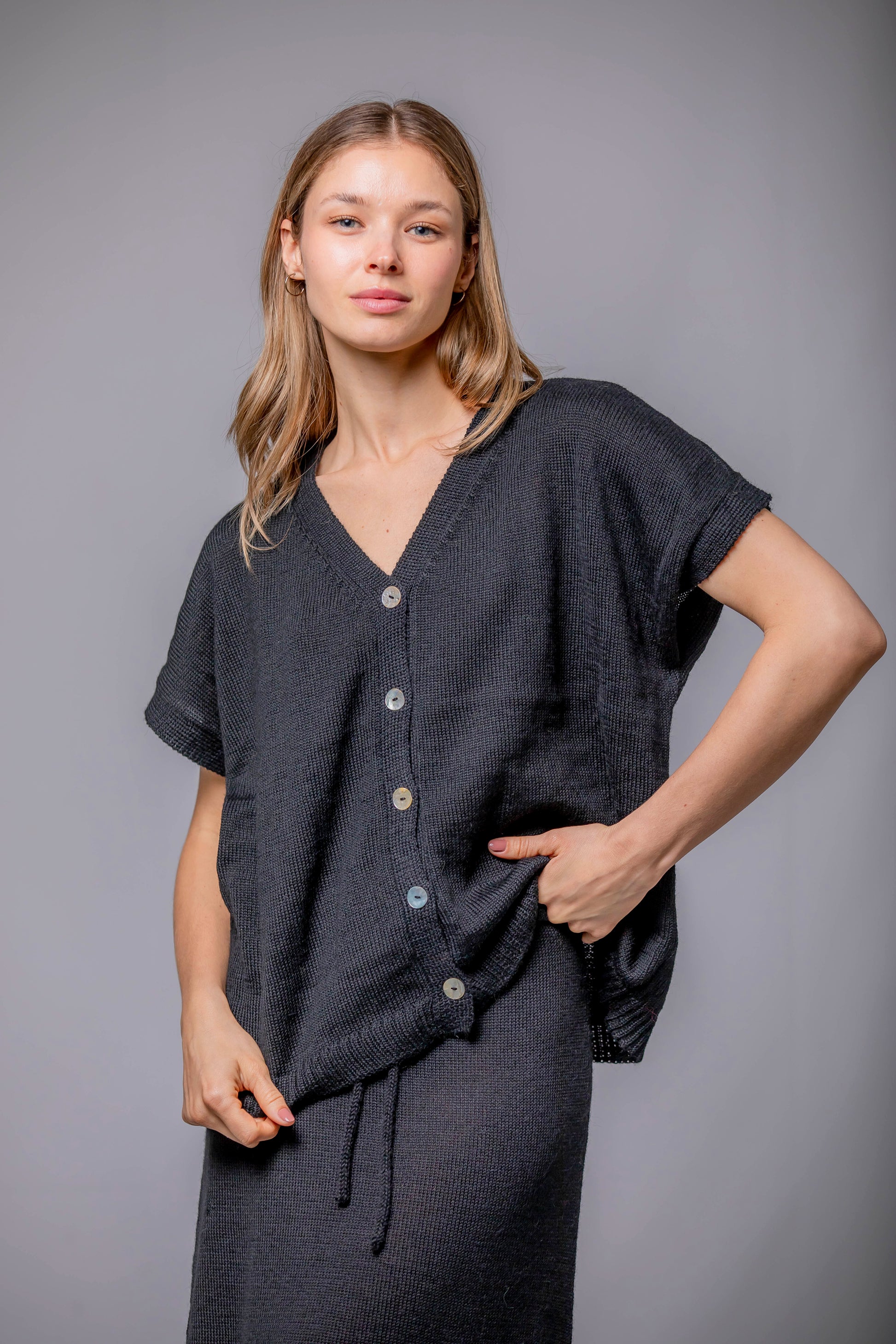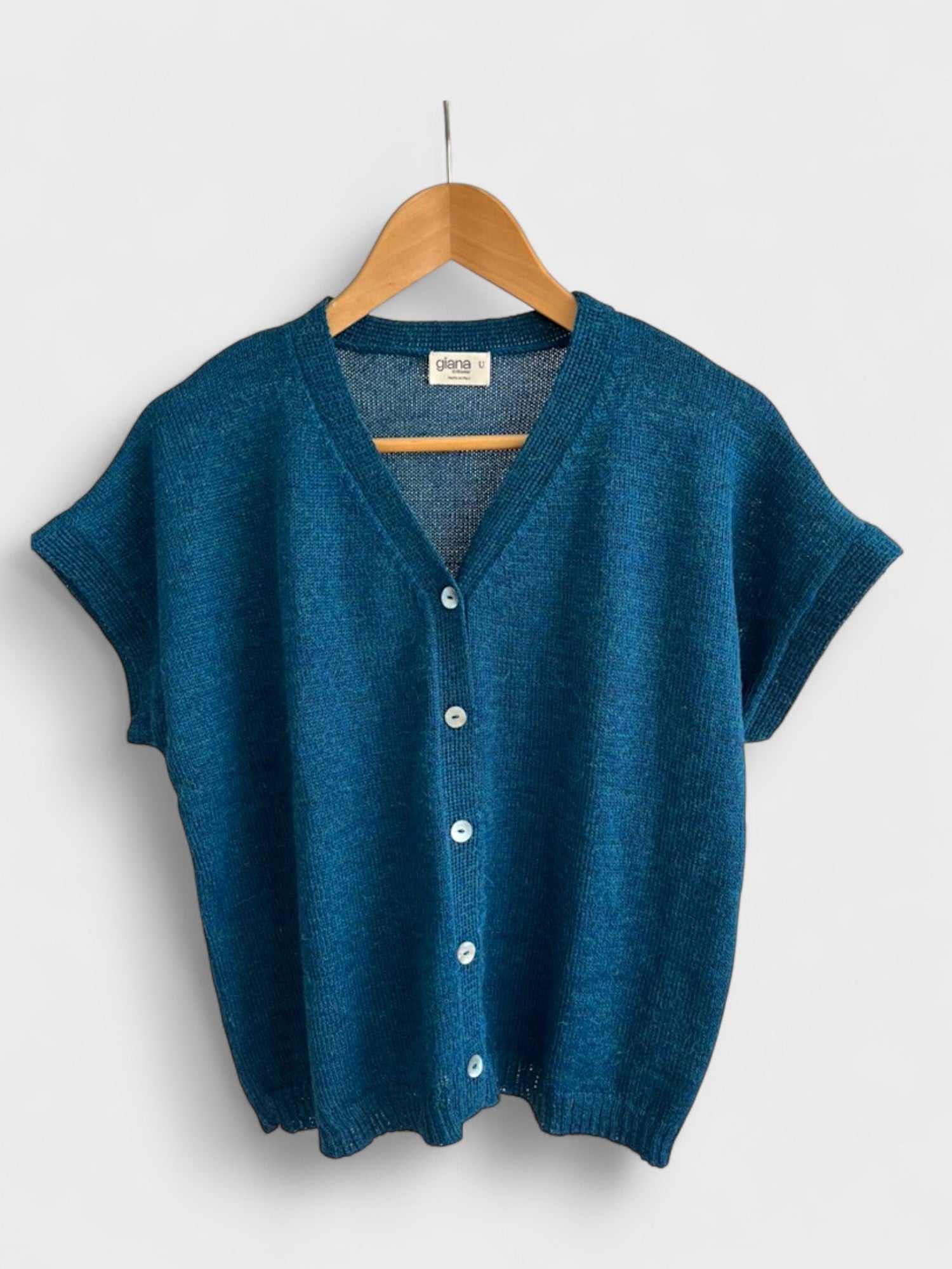 Un clásico reeditado con el sello GIANA. El chaleco Atria está tejido en Baby Alpaca pura, con una caída suave y un tacto ligero. Su escote en V y botones de nácar aportan un aire atemporal, mientras que su silueta amplia permite múltiples formas de uso: solo, como top, o sobre una blusa como en la imagen.