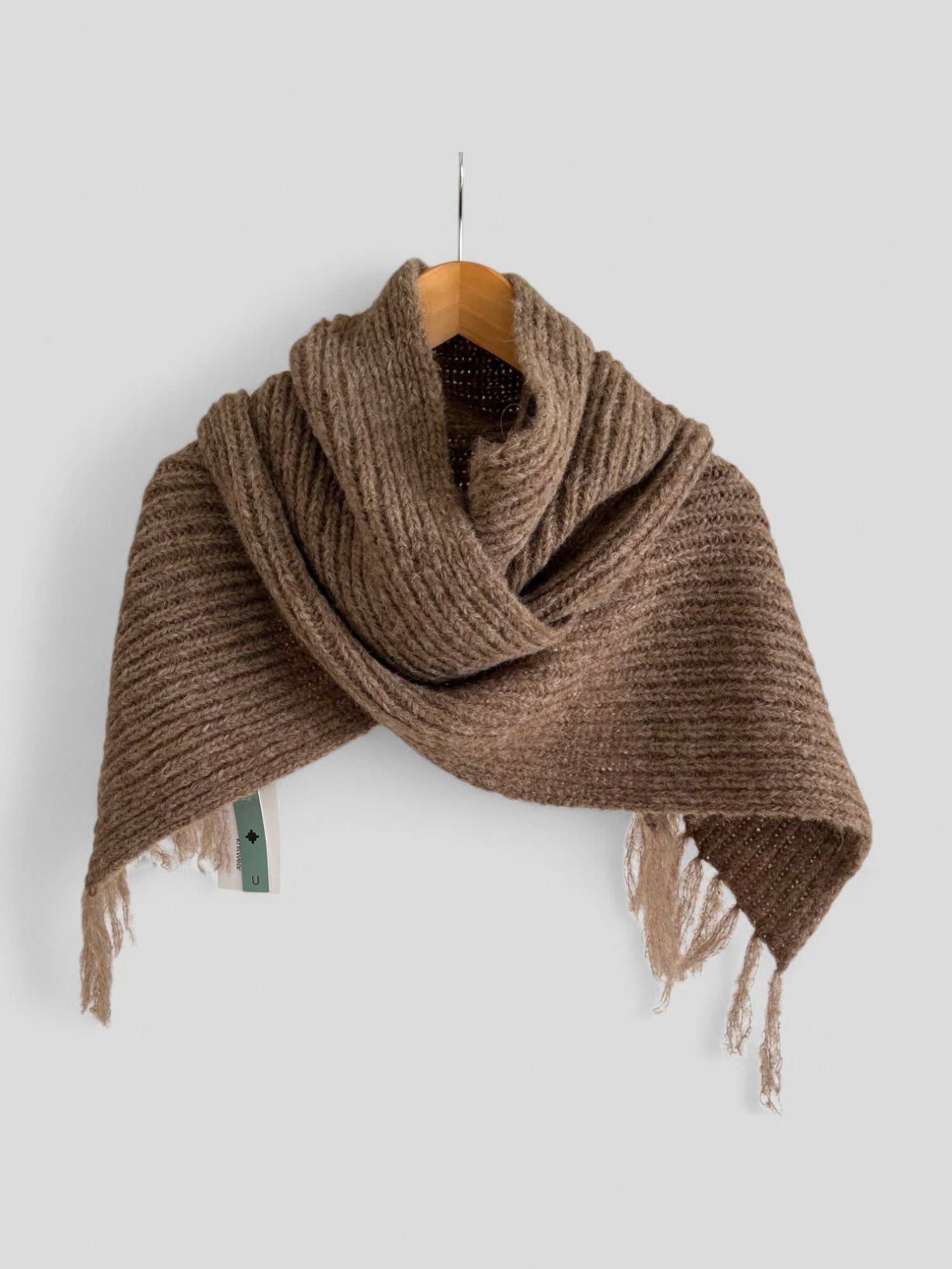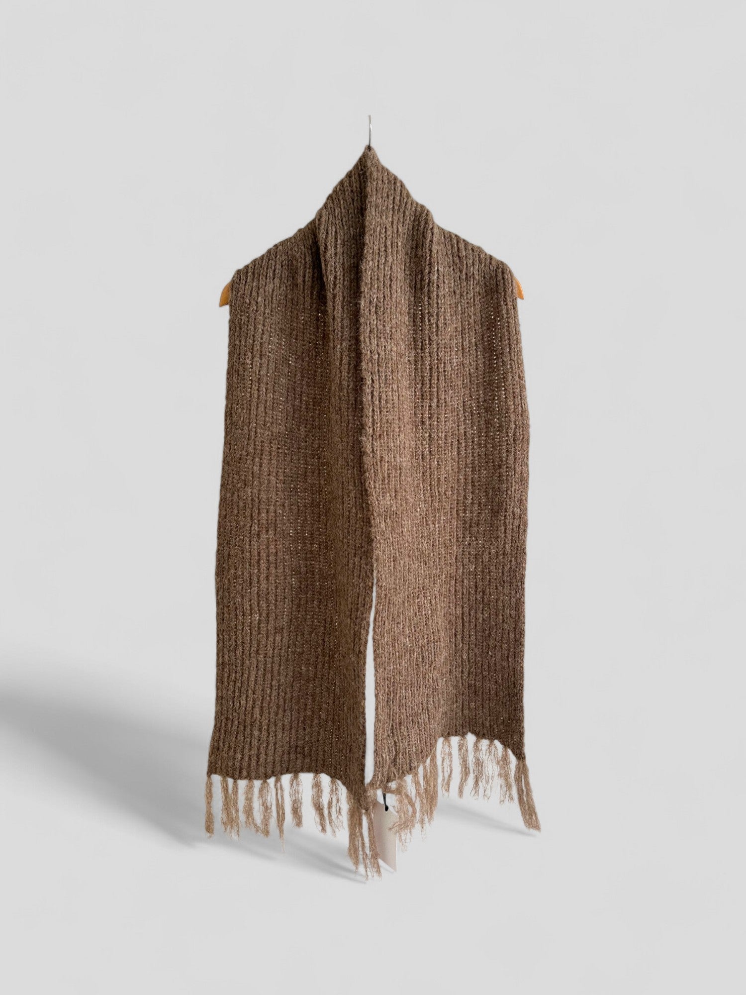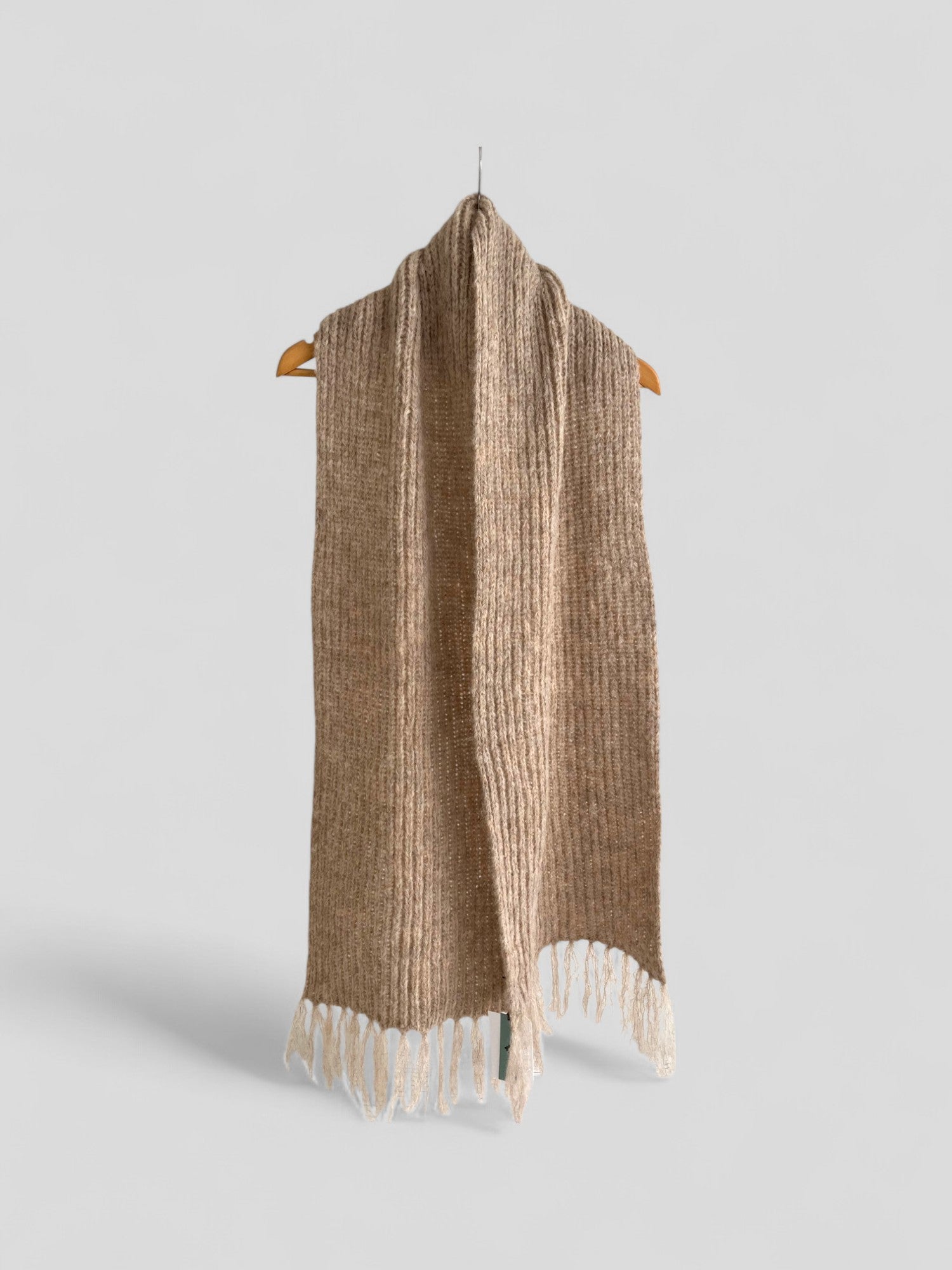 Su tejido acanalado da cuerpo sin rigidez, mientras que los flecos largos le añaden movimiento y una esencia nostálgica.