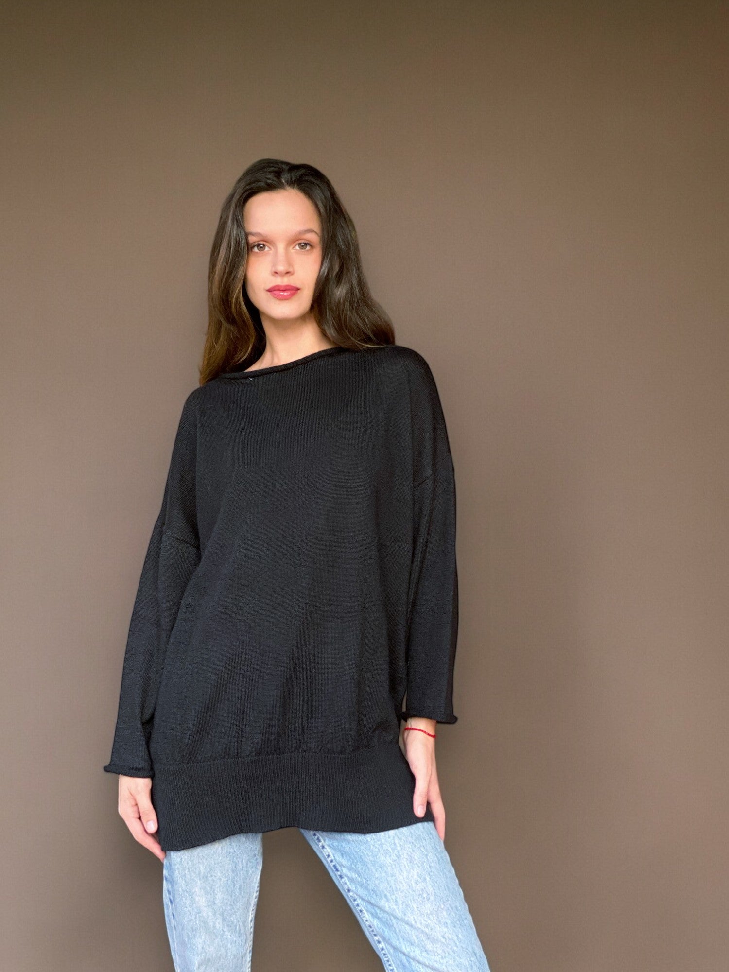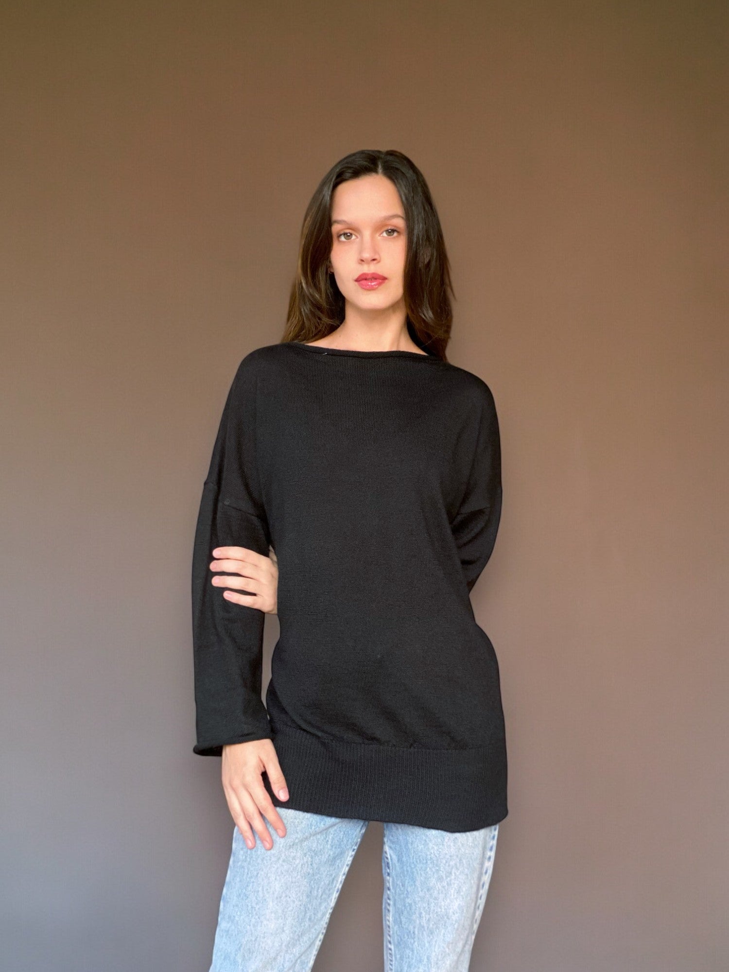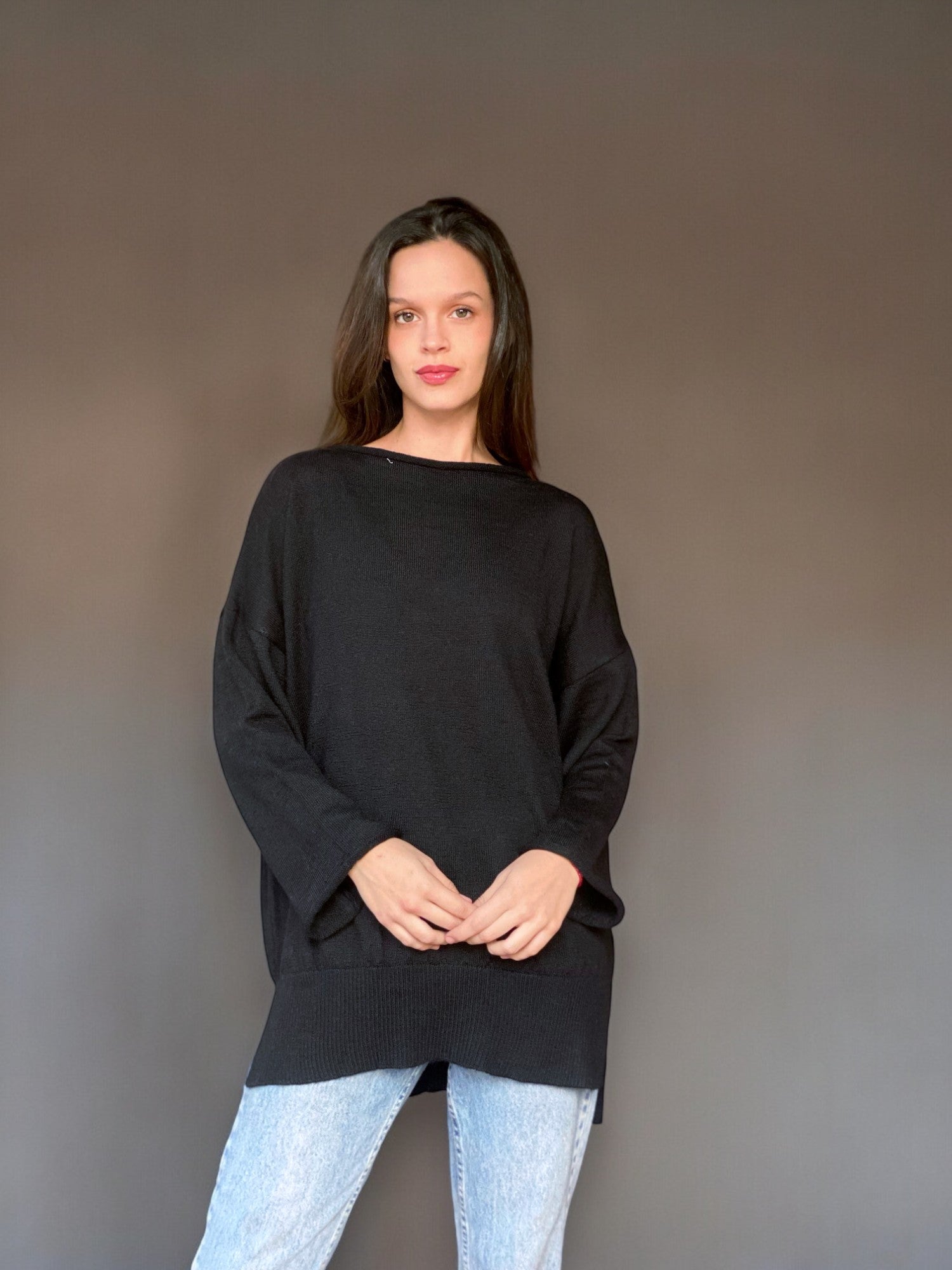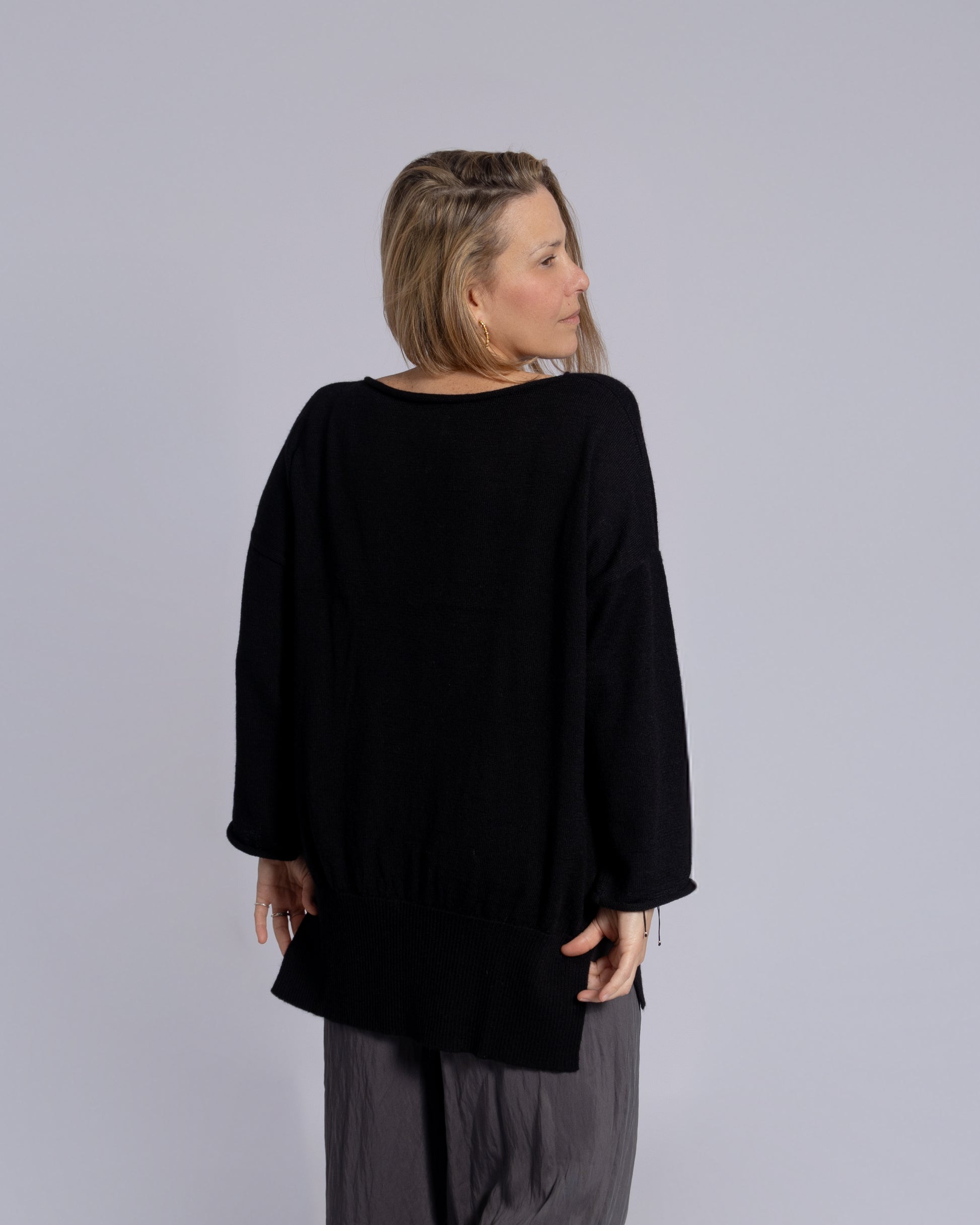 Esta chompa se caracteriza por su color negro profundo que aporta un toque de sofisticación y versatilidad, permitiendo que se combine fácilmente con una variedad de estilos y colores. Su diseño presenta un corte relajado que favorece a distintos tipos de cuerpo, y la longitud asimétrica en el dobladillo añade un detalle moderno y estilizado, ideal para un look contemporáneo.