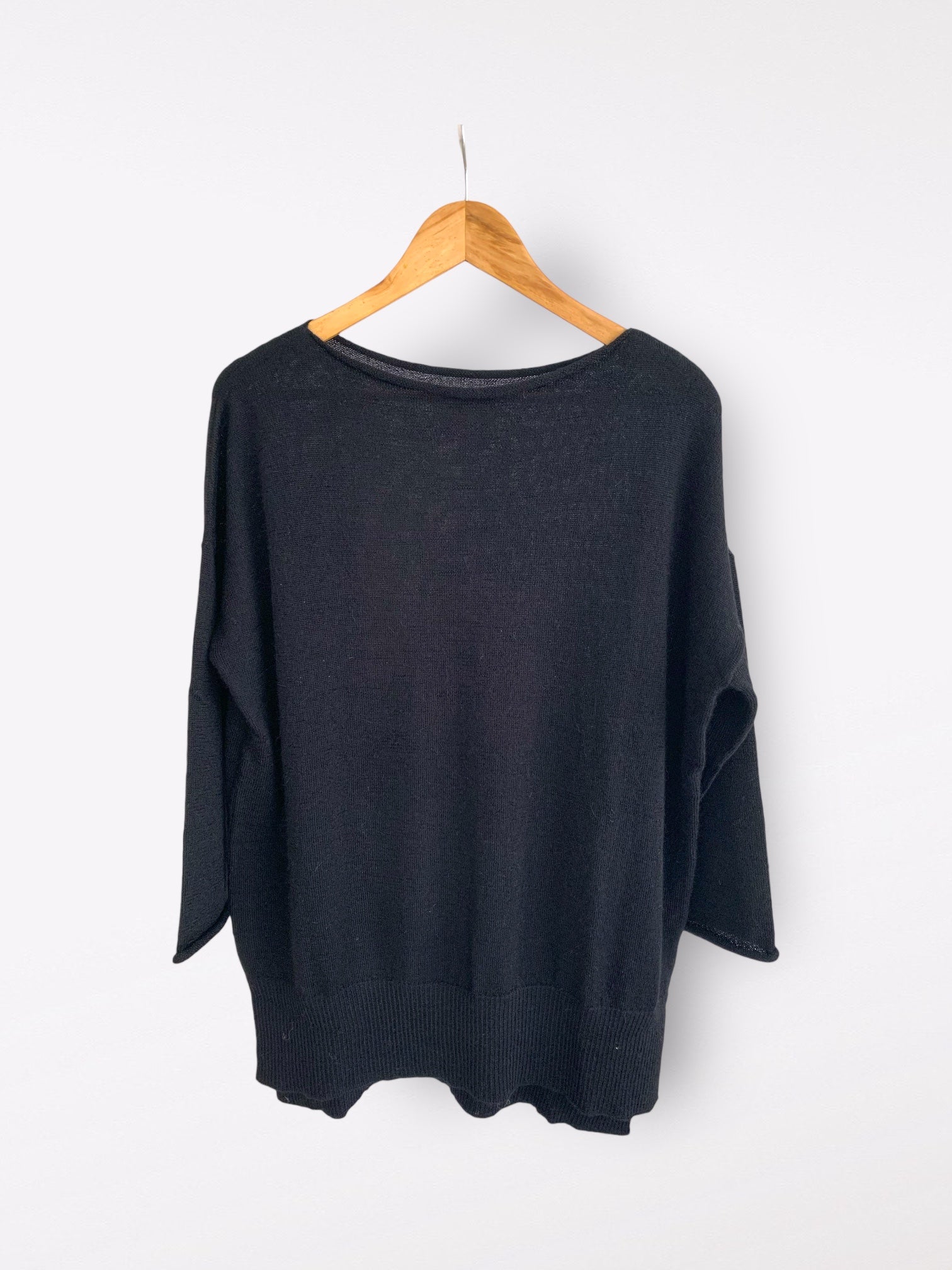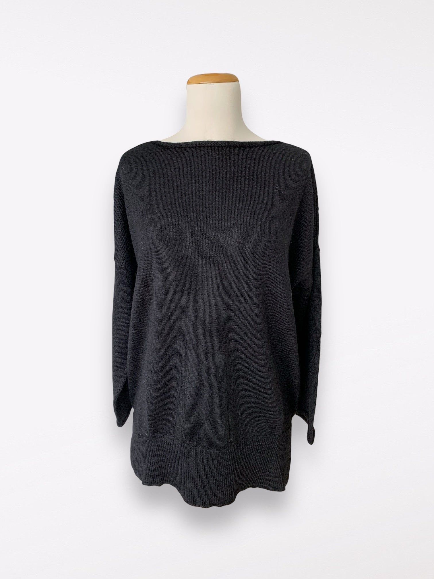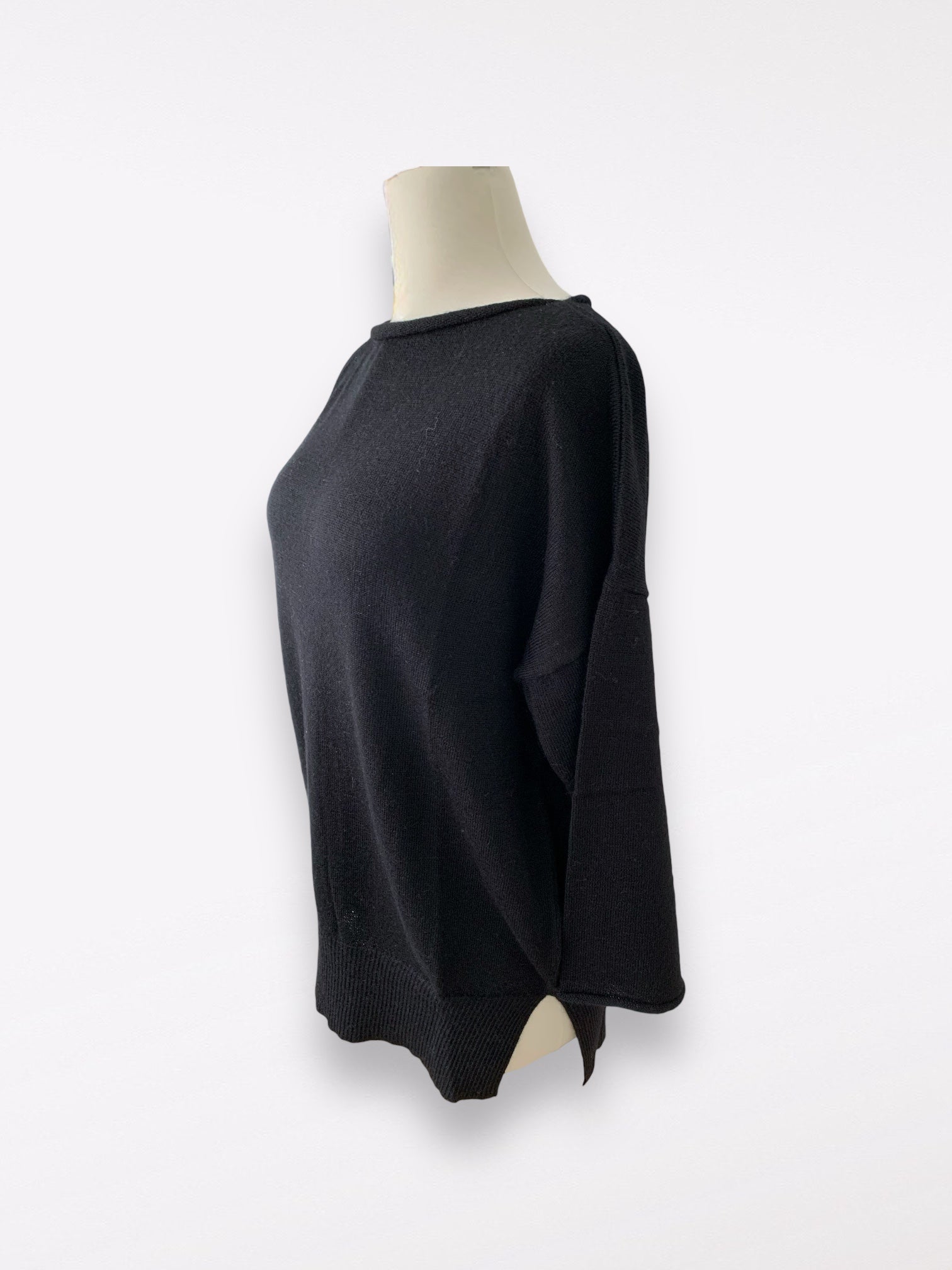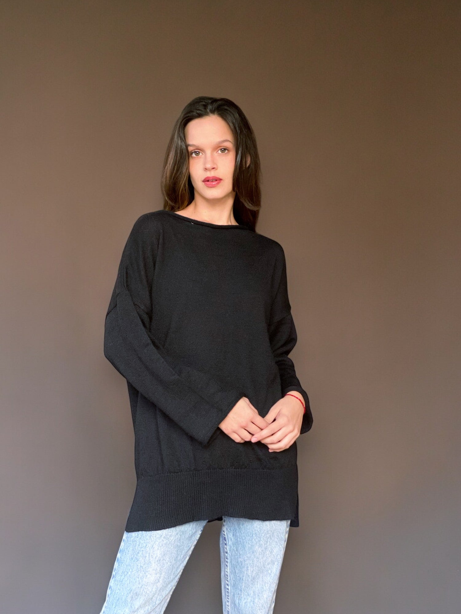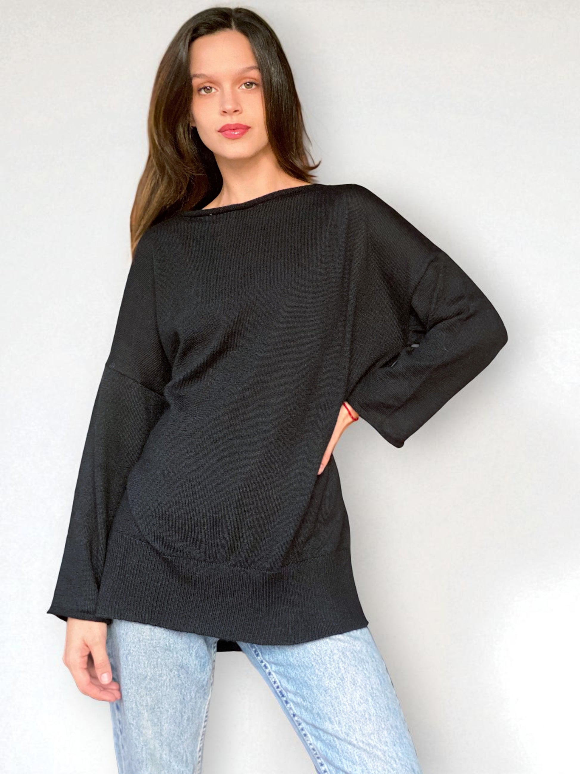 Esta chompa se caracteriza por su color negro profundo que aporta un toque de sofisticación y versatilidad, permitiendo que se combine fácilmente con una variedad de estilos y colores. Su diseño presenta un corte relajado que favorece a distintos tipos de cuerpo, y la longitud asimétrica en el dobladillo añade un detalle moderno y estilizado, ideal para un look contemporáneo.