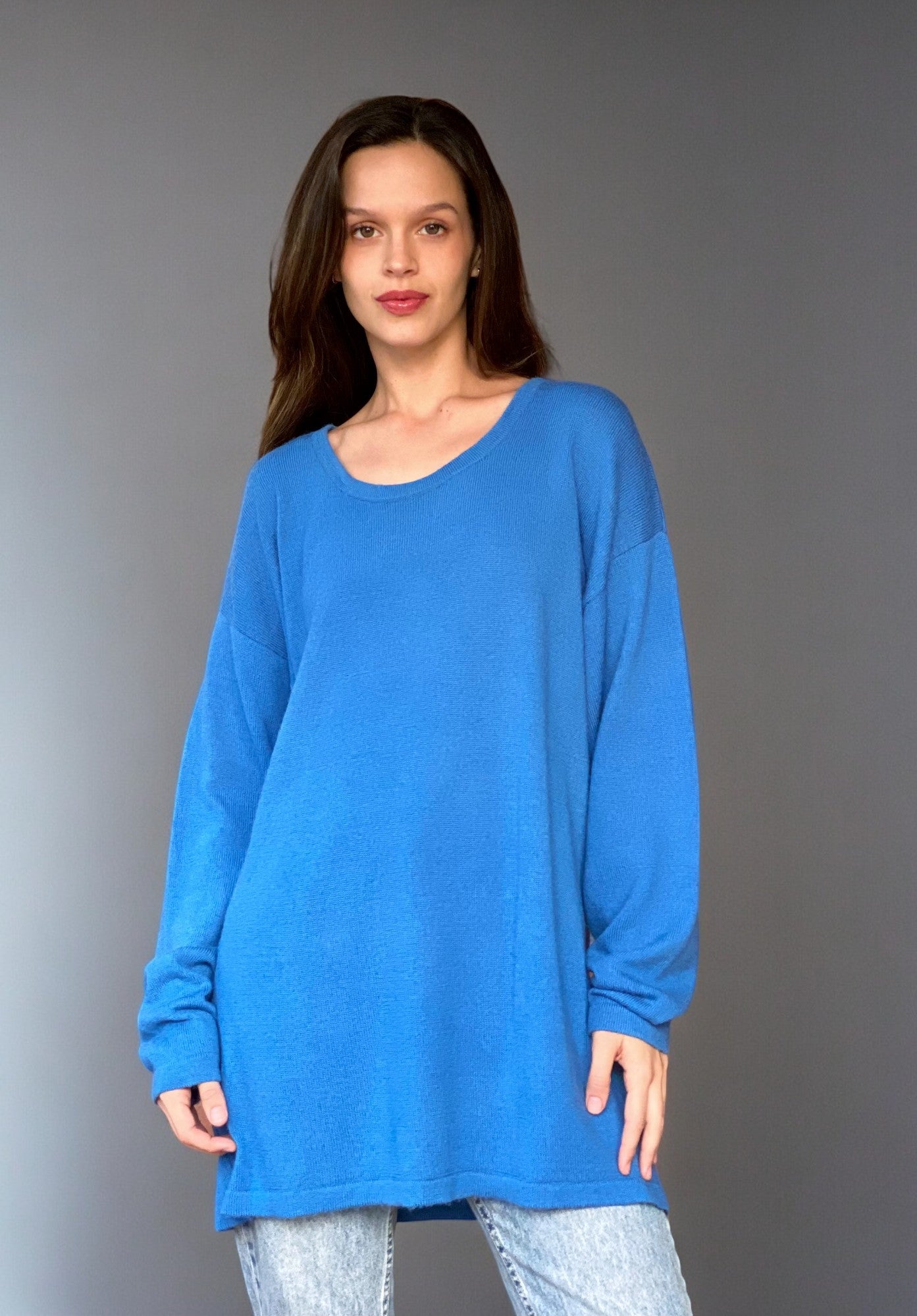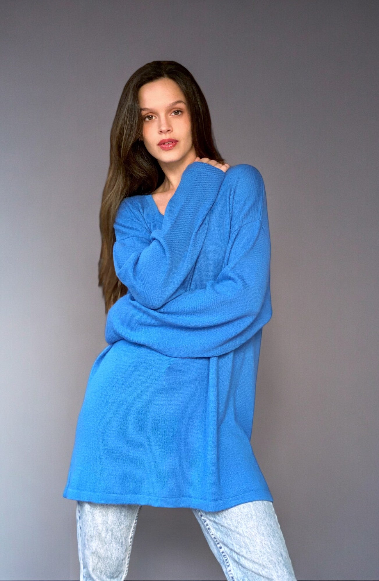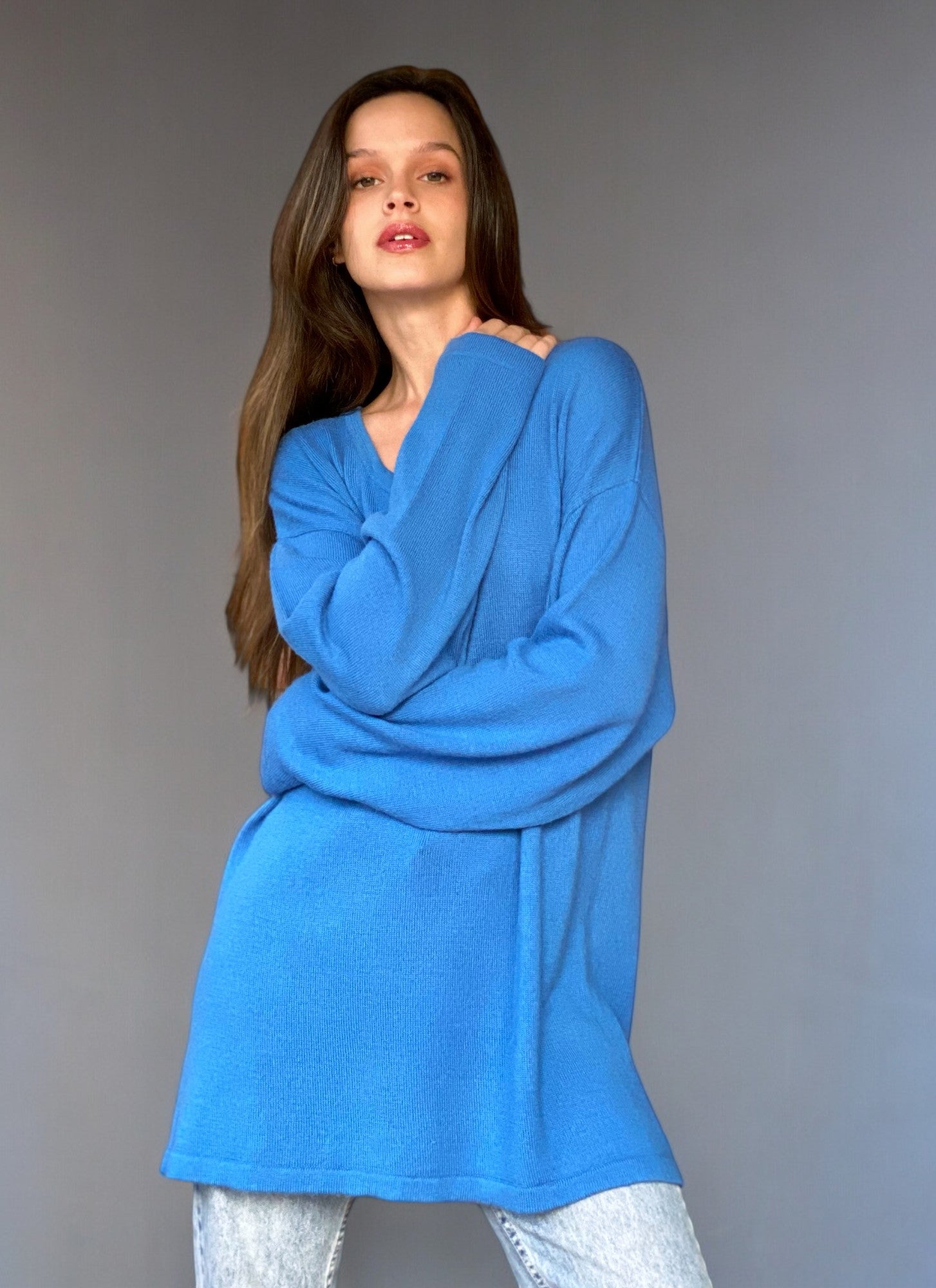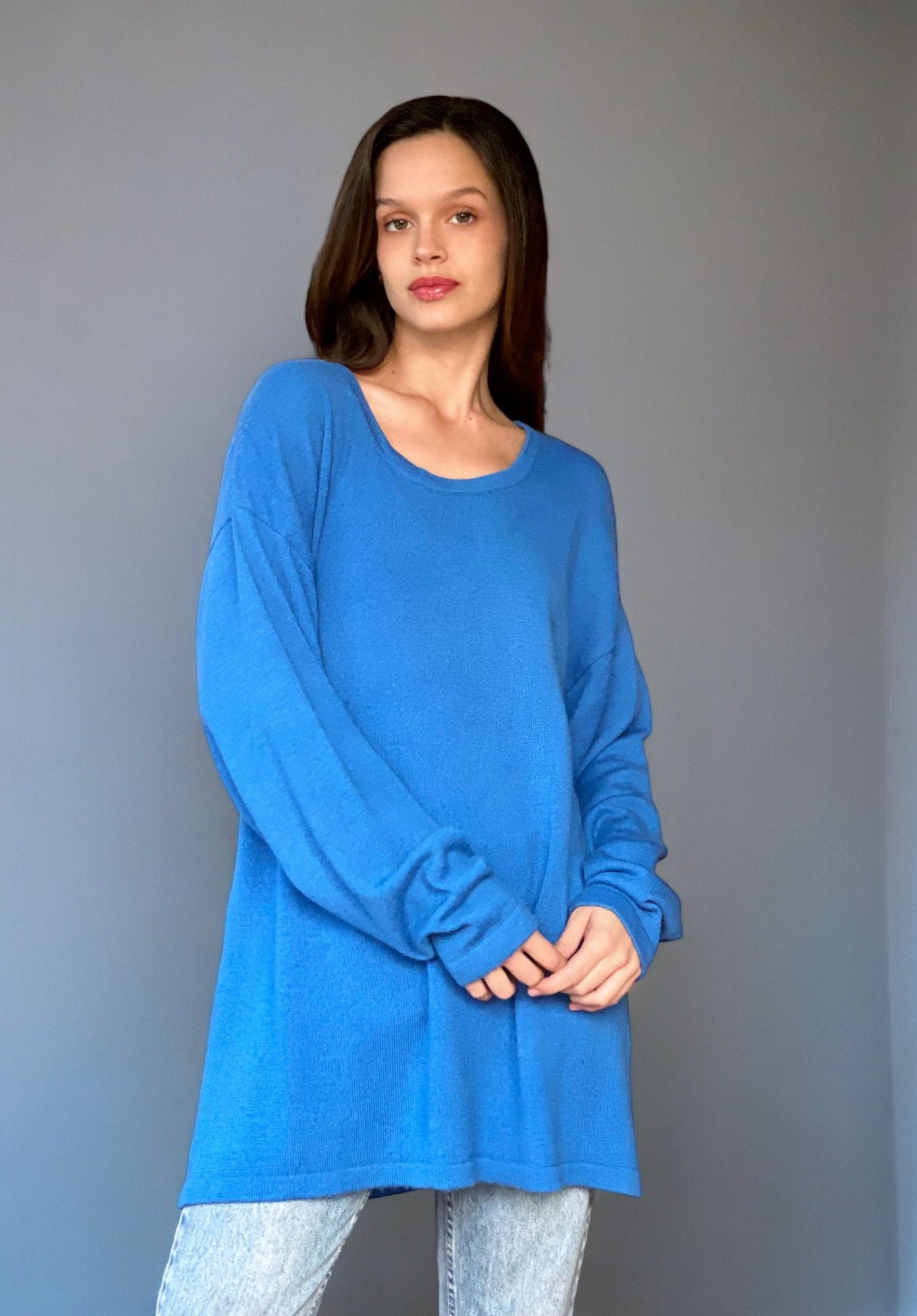 El diseño de la chompa Hydra presenta un corte relajado y un elegante color azul que captura la esencia de la modernidad y la elegancia atemporal. Su cuello redondo y las mangas largas ofrecen una silueta clásica y versátil, perfecta para una variedad de ocasiones. Además, los bordes ondulados en el dobladillo añaden un toque distintivo y dinámico al diseño general de la prenda.