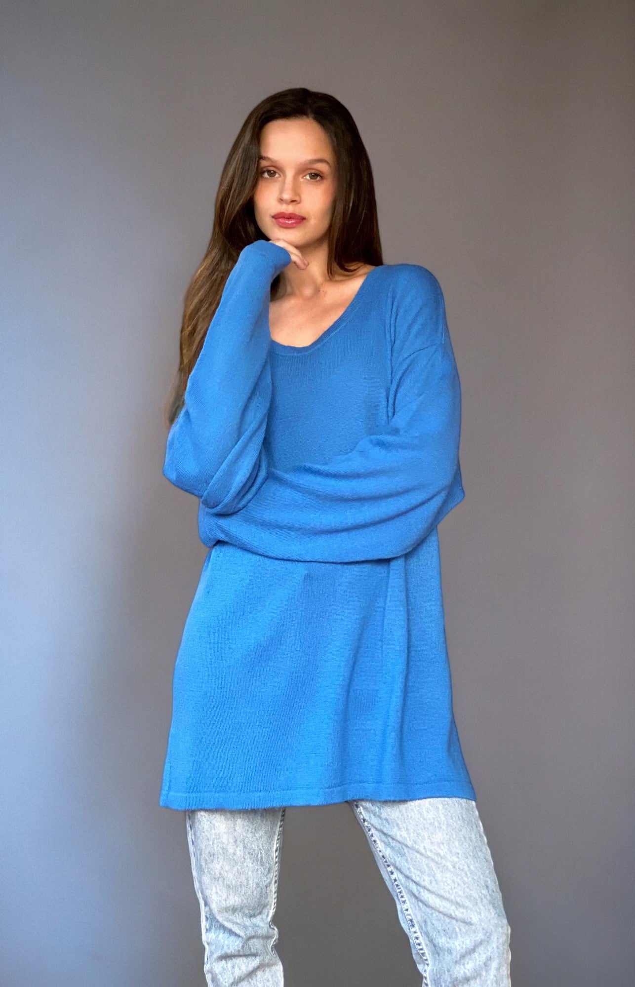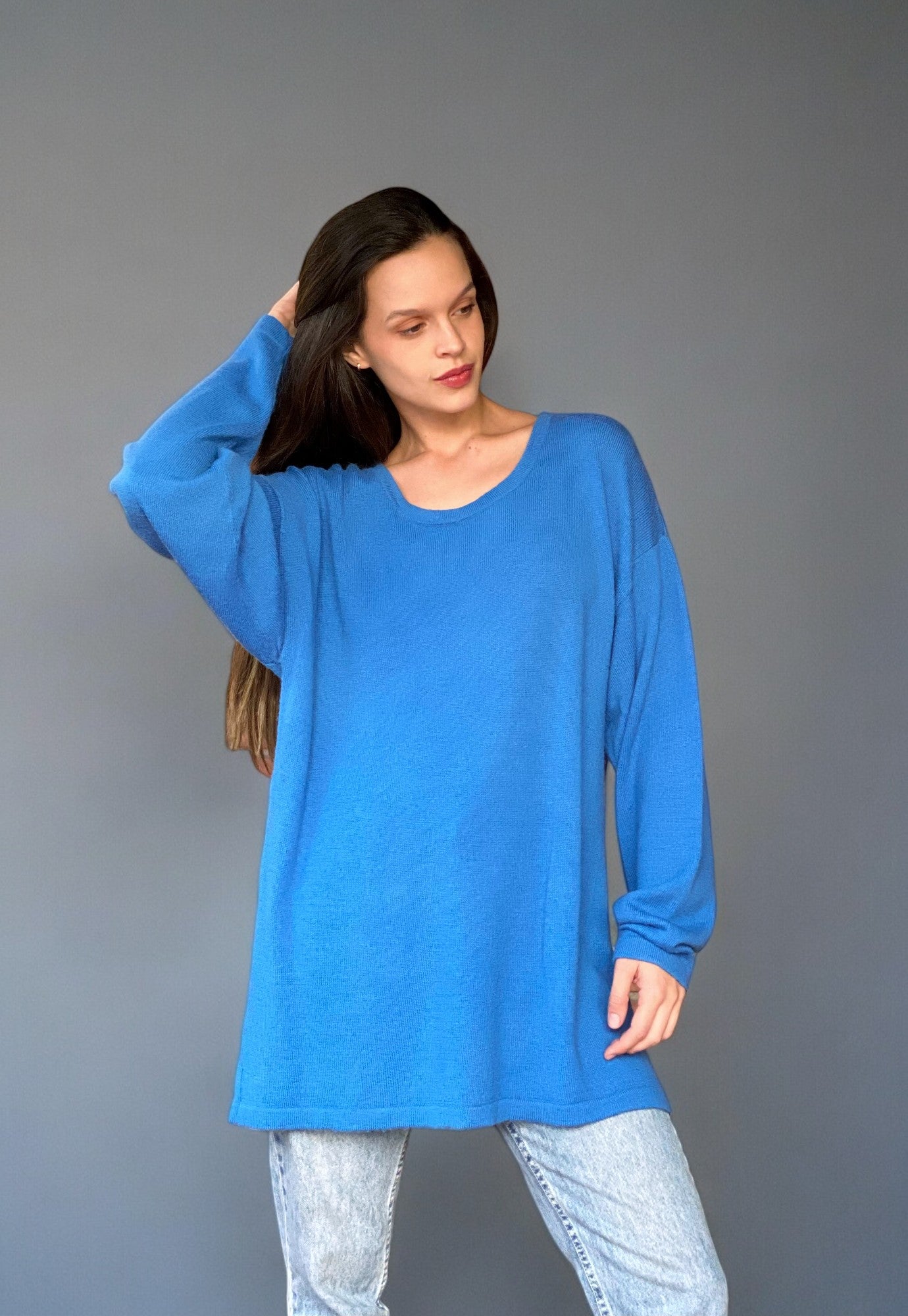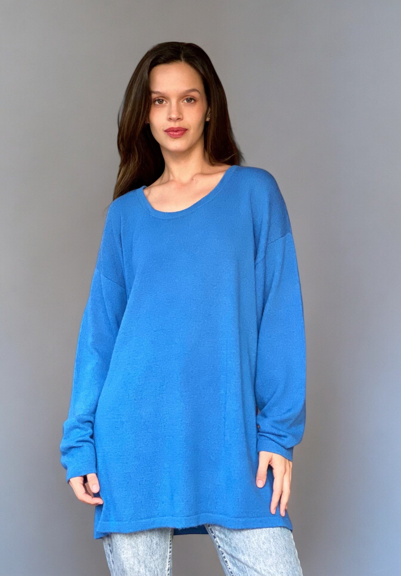 El diseño de la chompa Hydra presenta un corte relajado y un elegante color azul que captura la esencia de la modernidad y la elegancia atemporal. Su cuello redondo y las mangas largas ofrecen una silueta clásica y versátil, perfecta para una variedad de ocasiones. Además, los bordes ondulados en el dobladillo añaden un toque distintivo y dinámico al diseño general de la prenda.