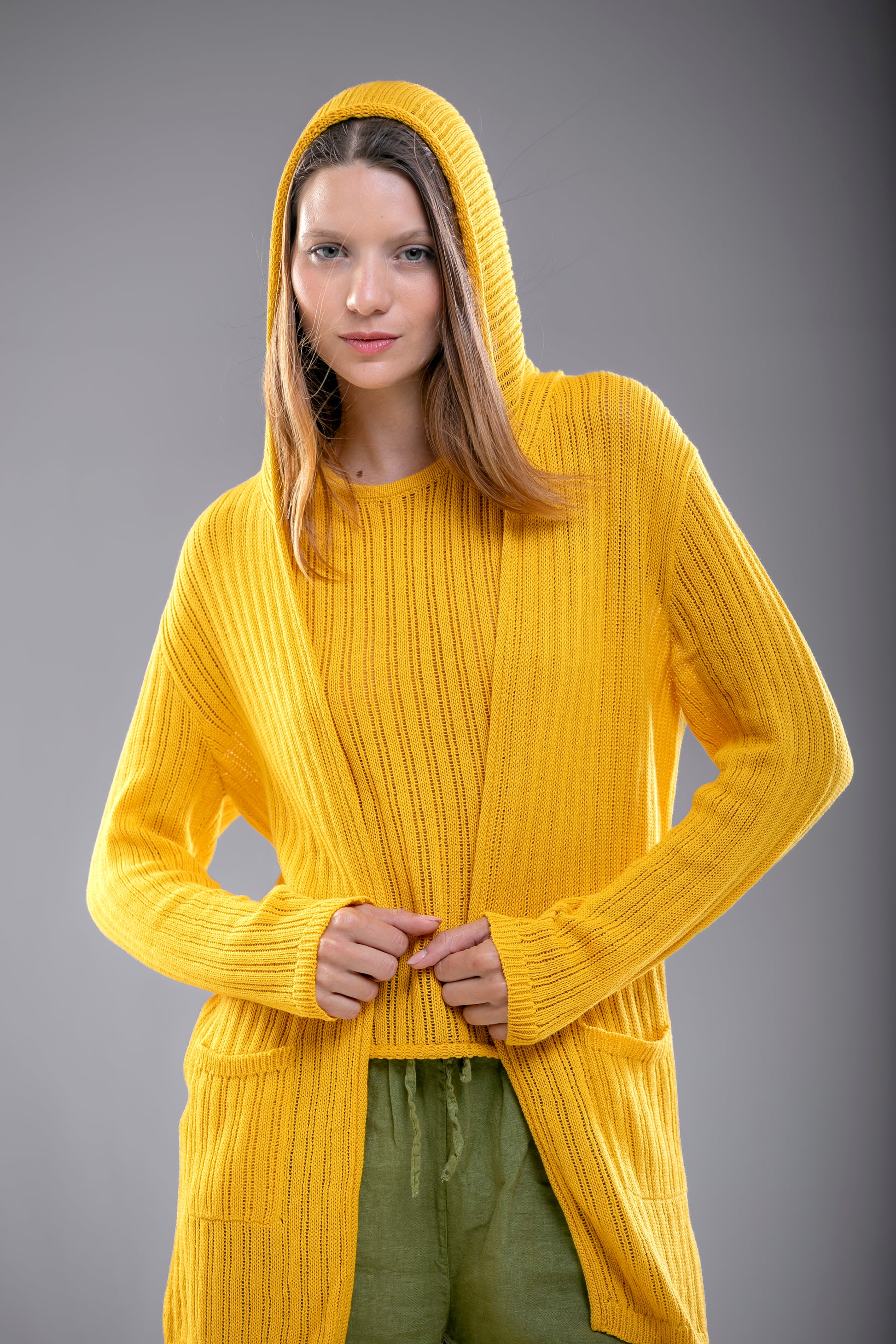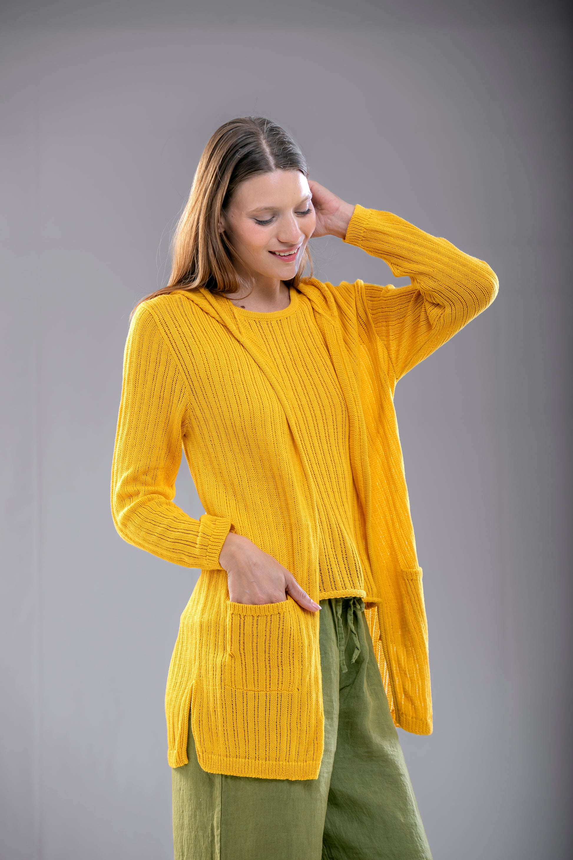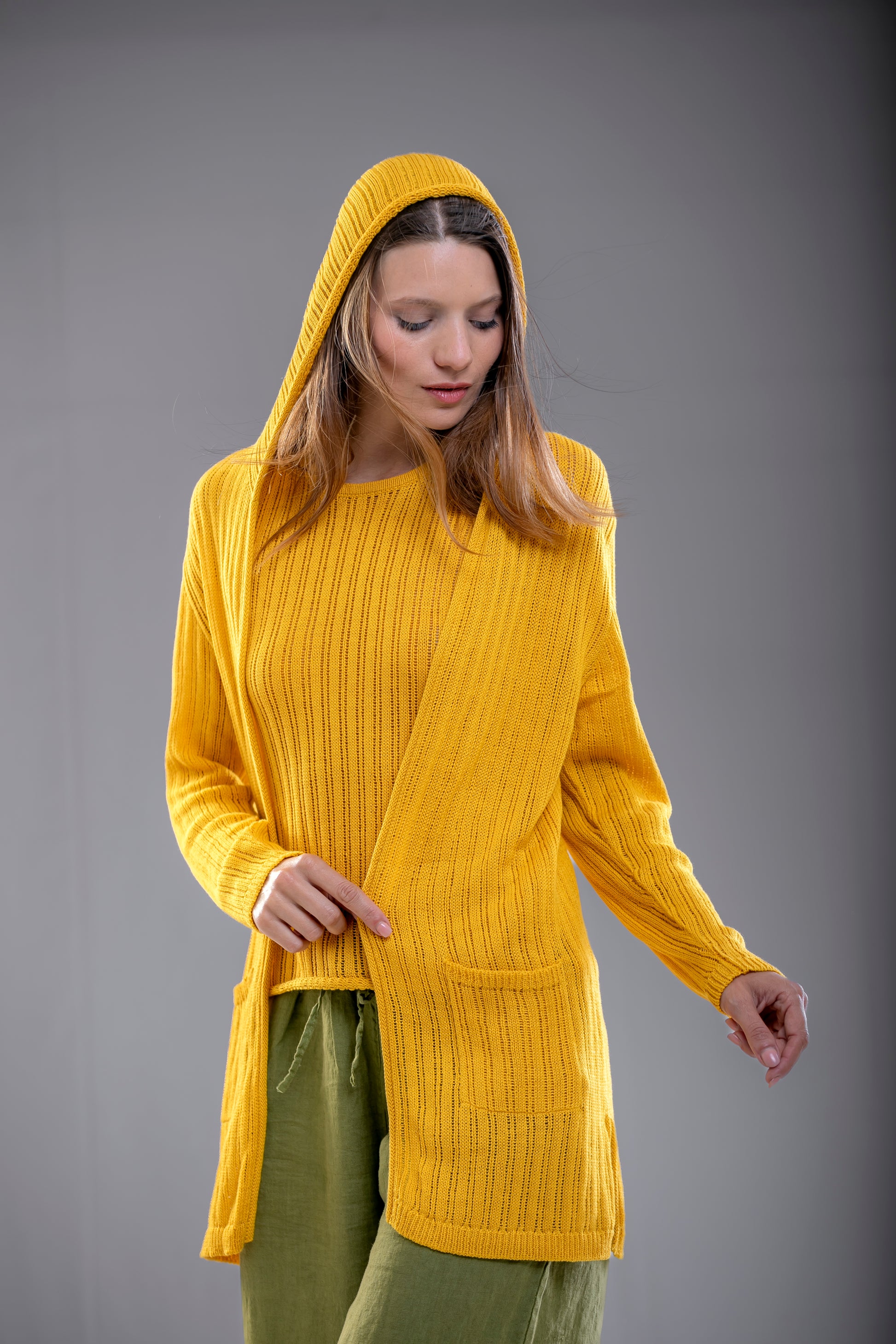 Tejida en 100% algodón orgánico peruano, combina un punto acanalado vertical que estiliza la silueta con un diseño funcional y versátil.