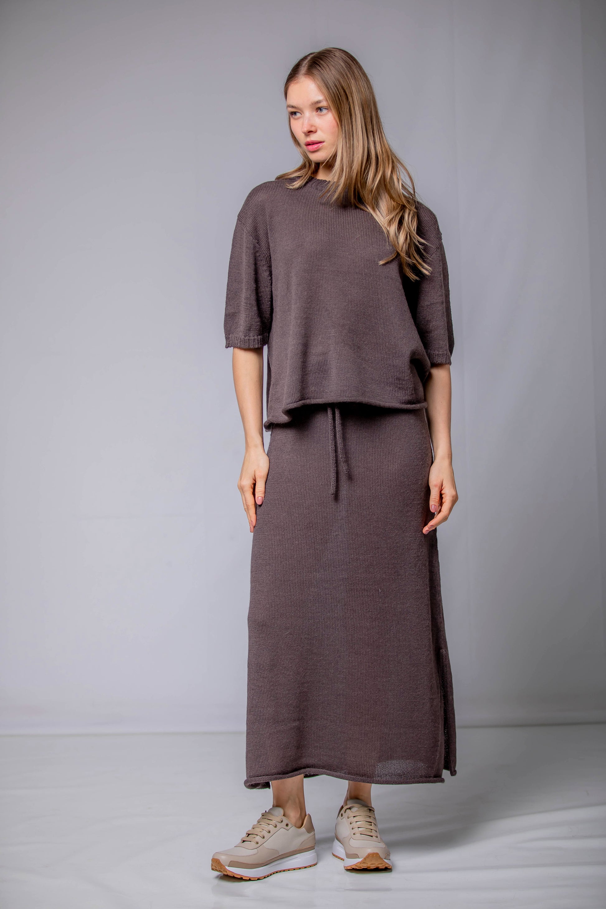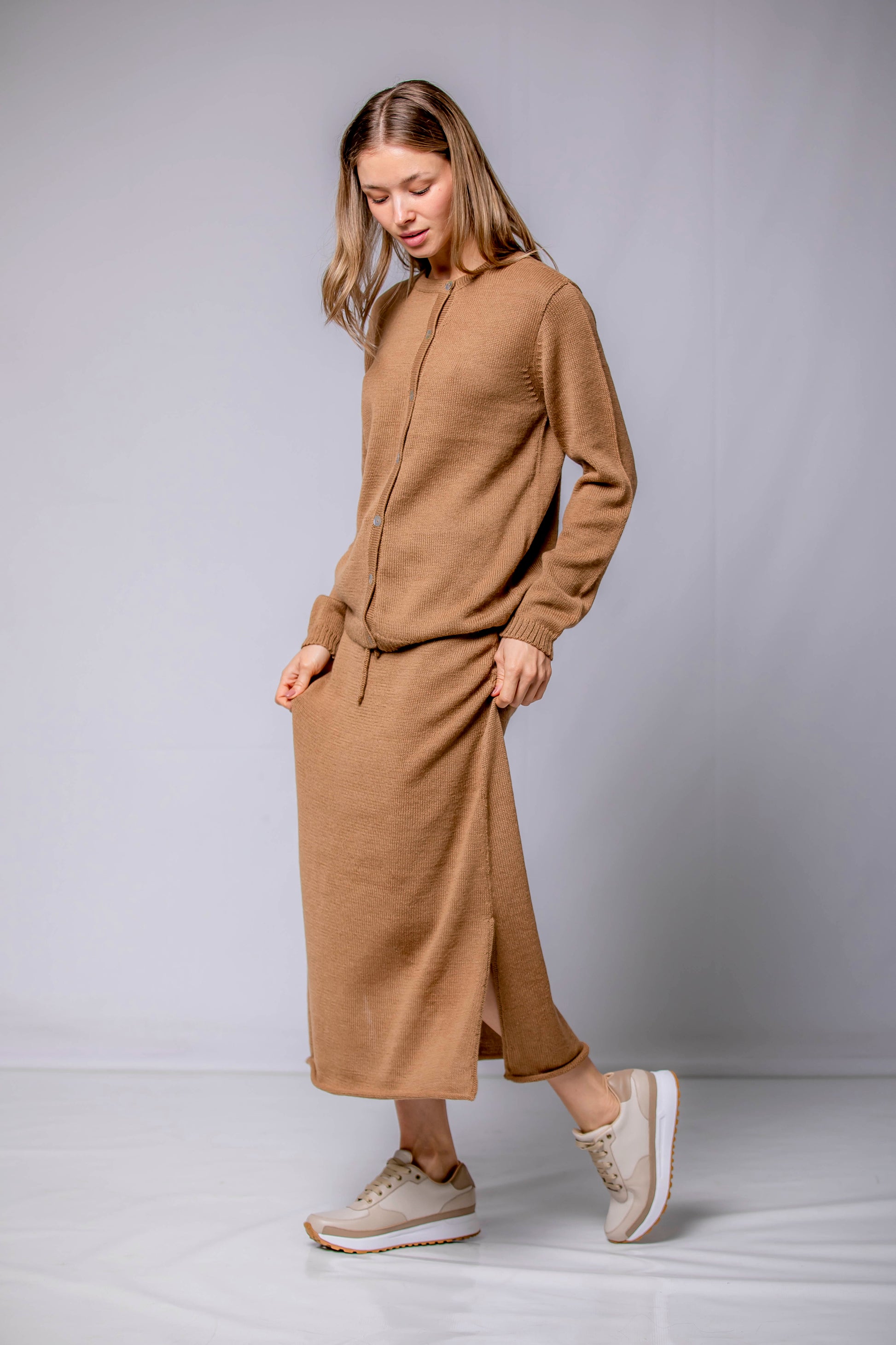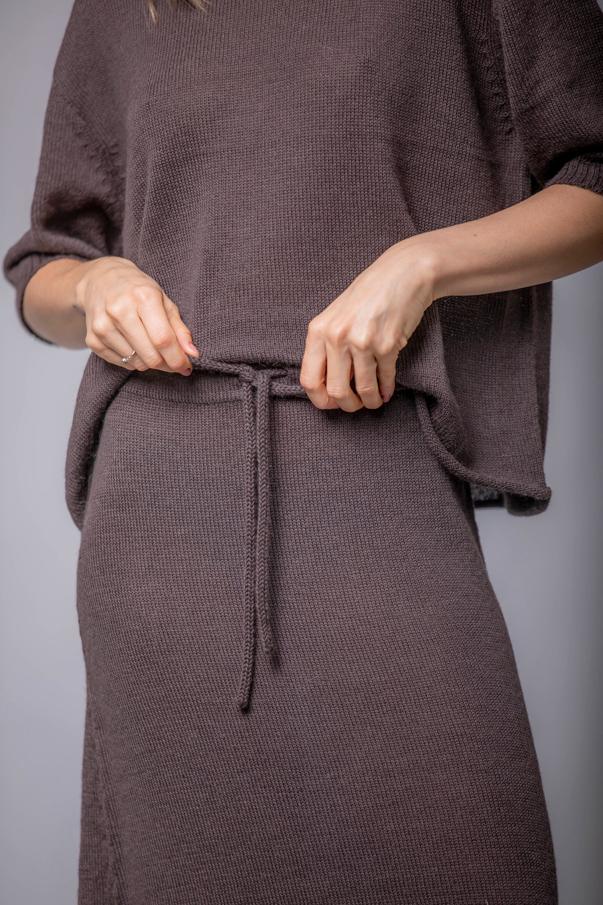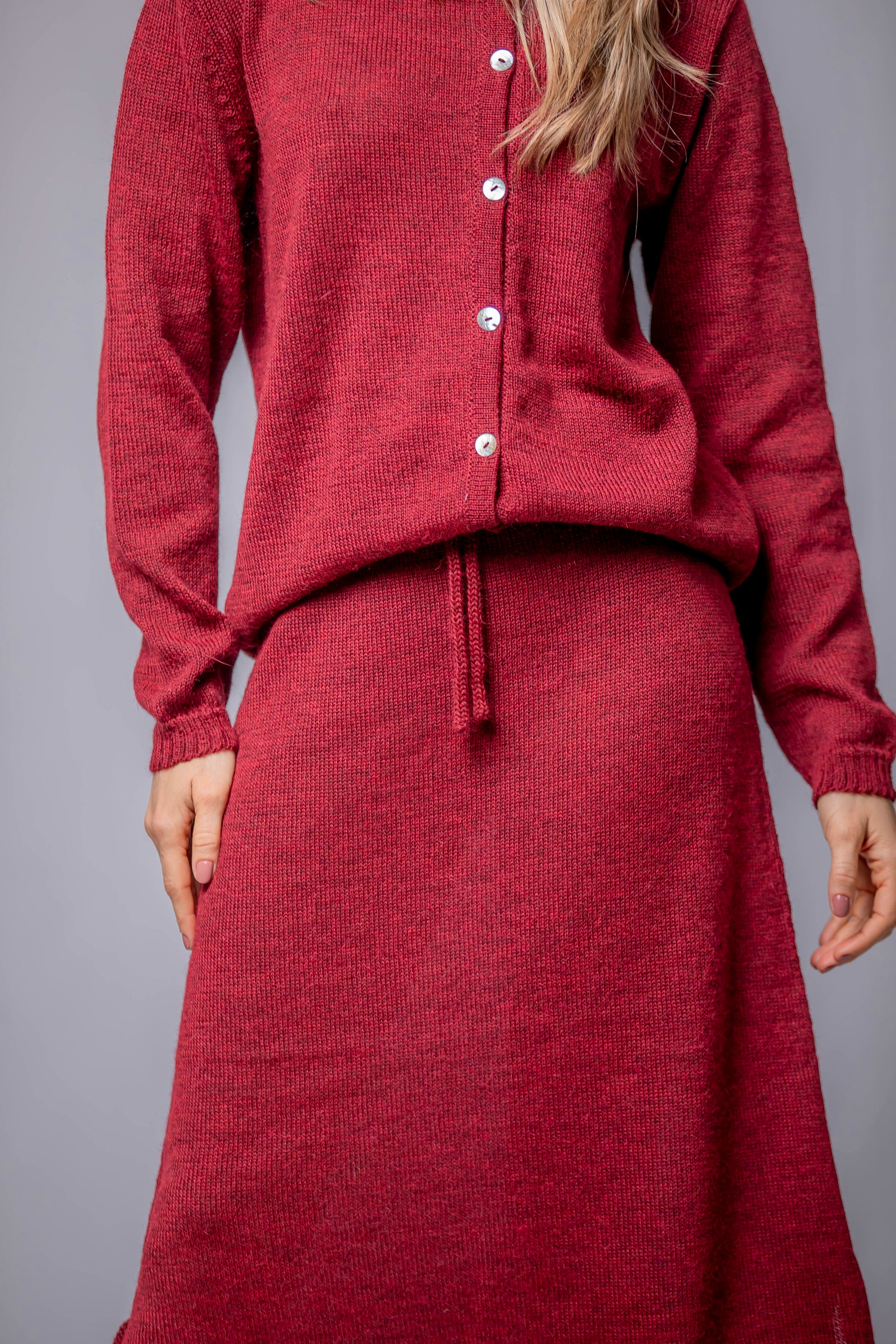 Una silueta fluida que acompaña el movimiento con naturalidad. La Falda Mira está confeccionada en 100% Baby Alpaca, lo que le aporta una caída ligera y una textura suave al tacto. El detalle del cordón tejido en la cintura permite ajustarla con delicadeza, sin apretar. Una pieza pensada para transitar el invierno con ligereza, disponible en cinco colores que evocan la calma, la tierra y el tiempo.