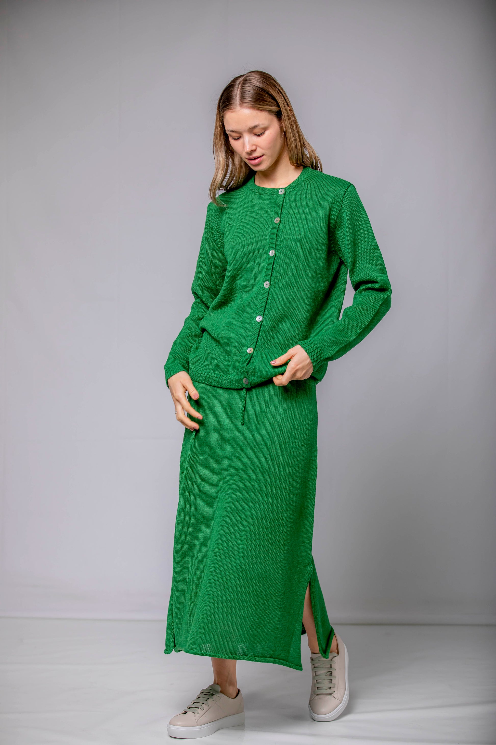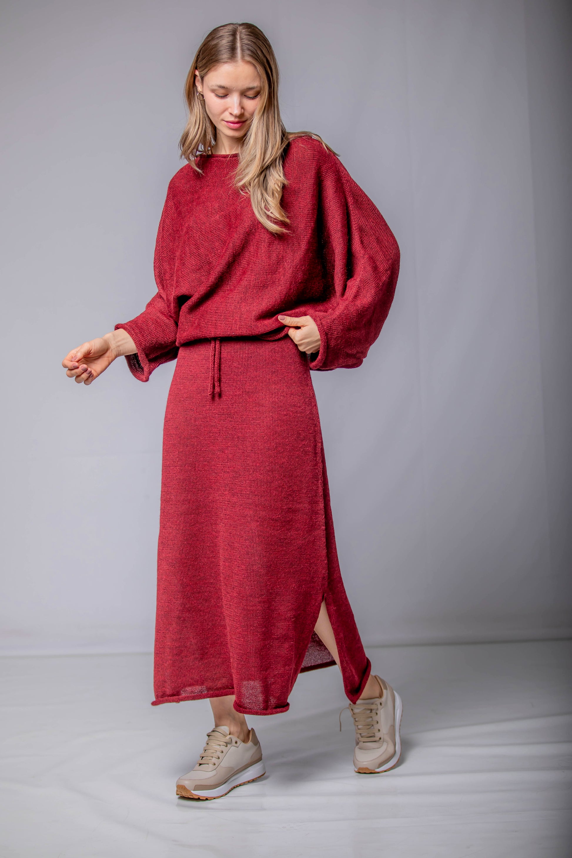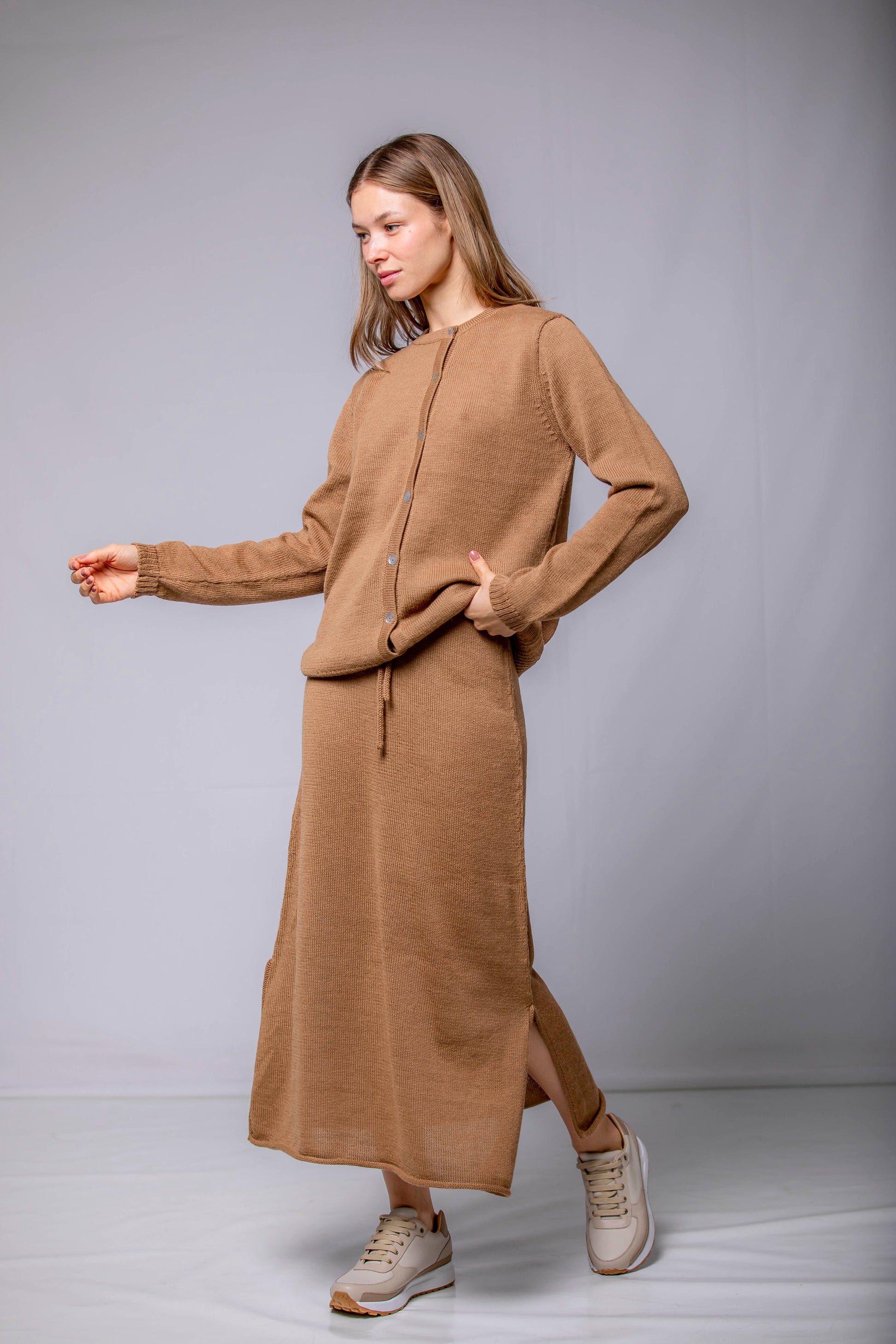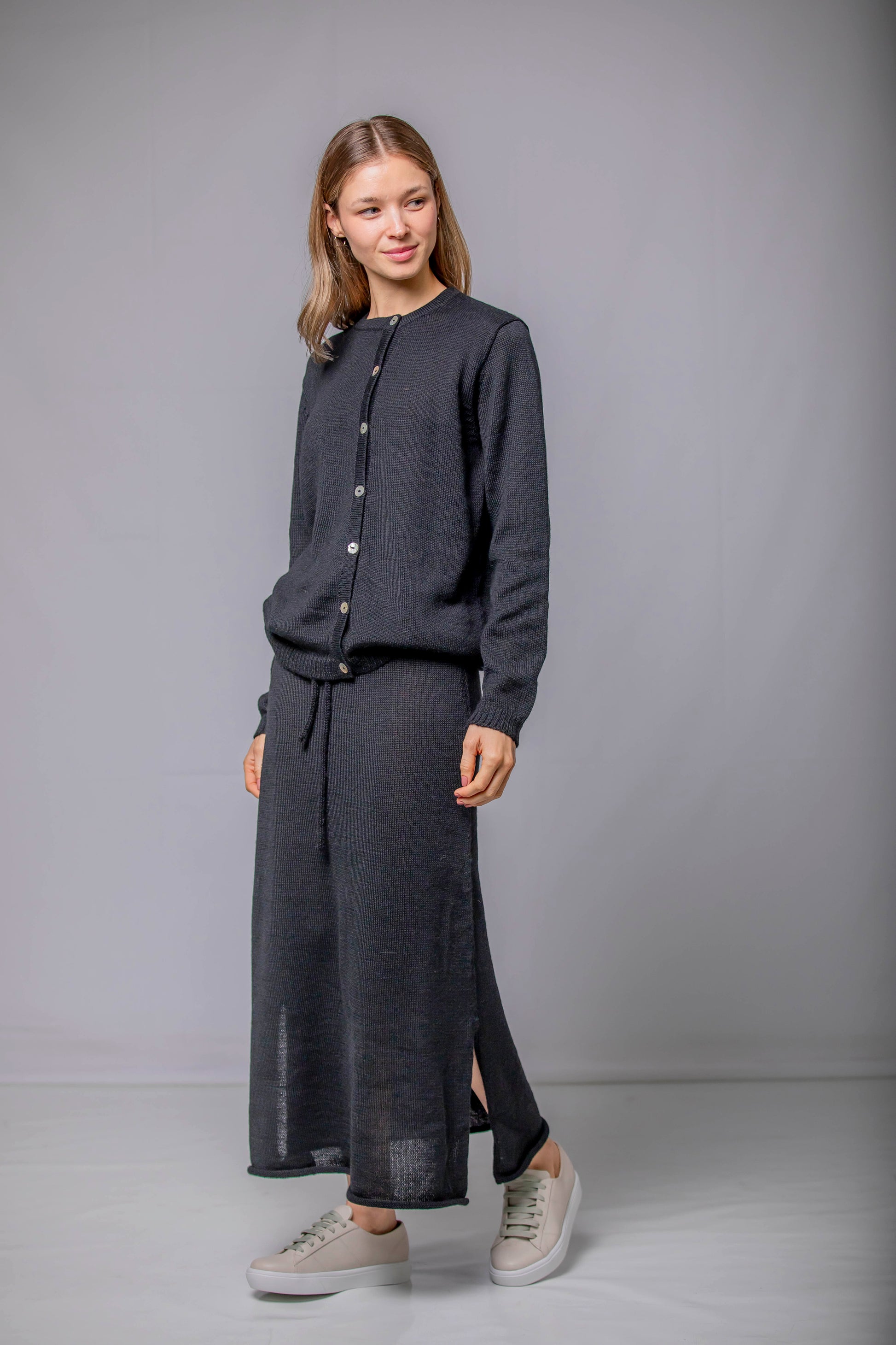 Una silueta fluida que acompaña el movimiento con naturalidad. La Falda Mira está confeccionada en 100% Baby Alpaca, lo que le aporta una caída ligera y una textura suave al tacto. El detalle del cordón tejido en la cintura permite ajustarla con delicadeza, sin apretar. Una pieza pensada para transitar el invierno con ligereza, disponible en cinco colores que evocan la calma, la tierra y el tiempo.