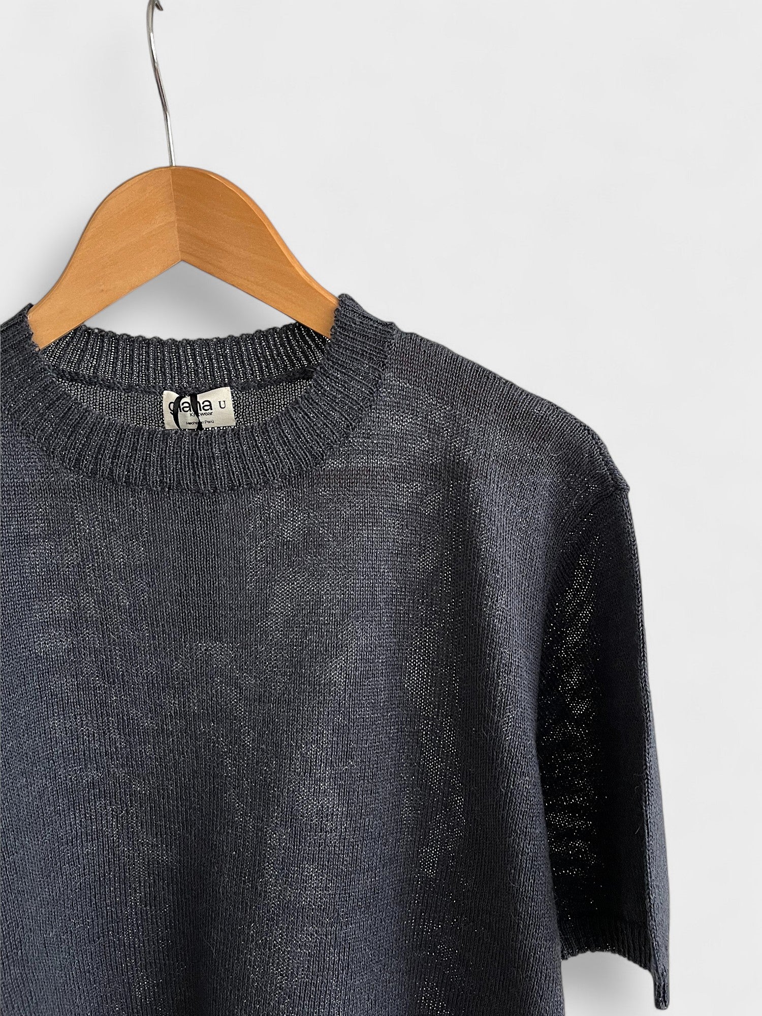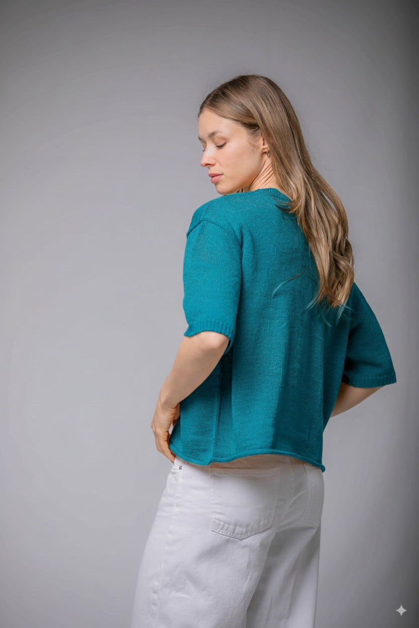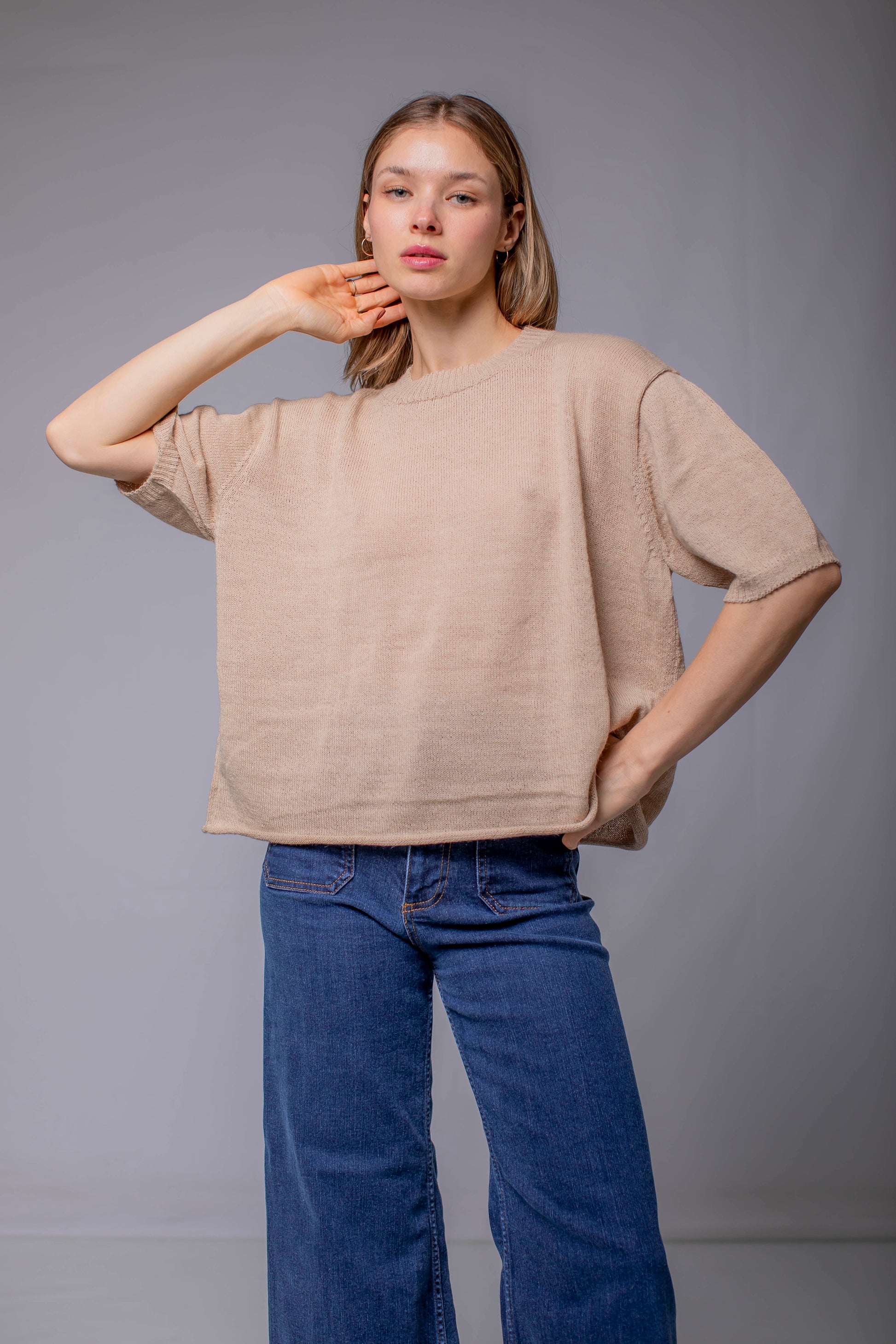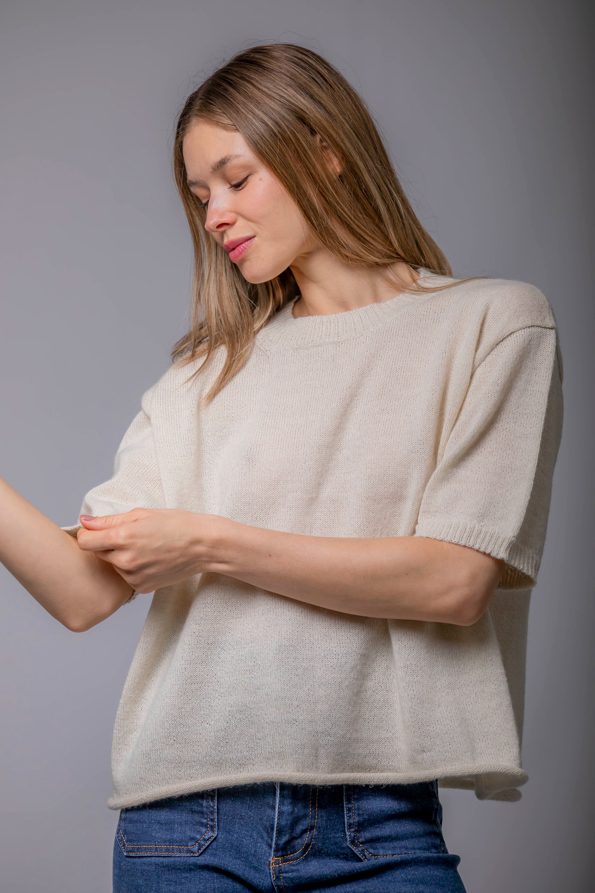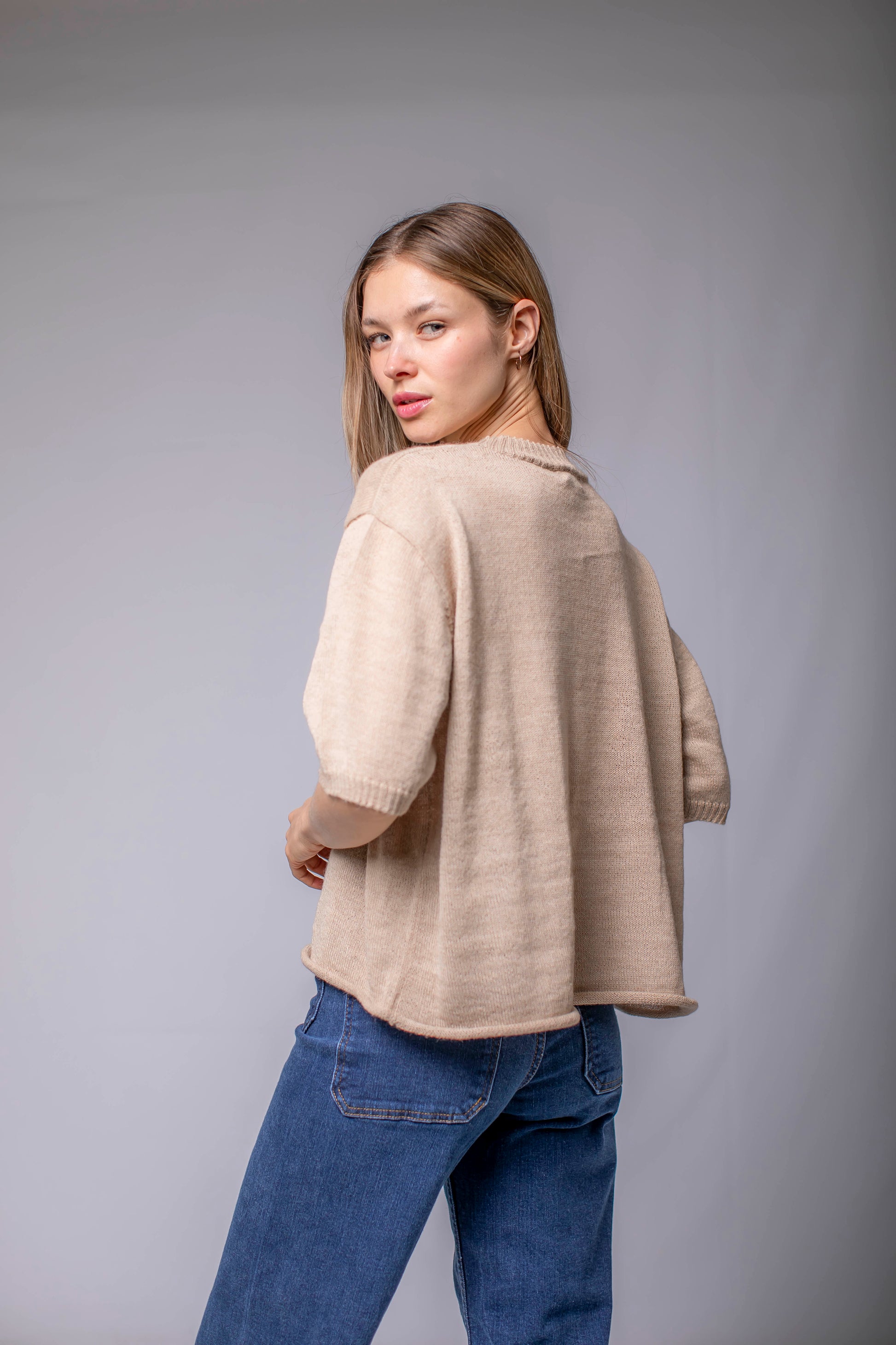 Tejida en 100% Baby Alpaca, envuelve con ligereza y suavidad en cada uso. Disponible en manga corta conserva una línea depurada que se eleva con su detalle más sutil: un acabado inferior que se enrolla de forma natural, como si la prenda respirara con quien la lleva.