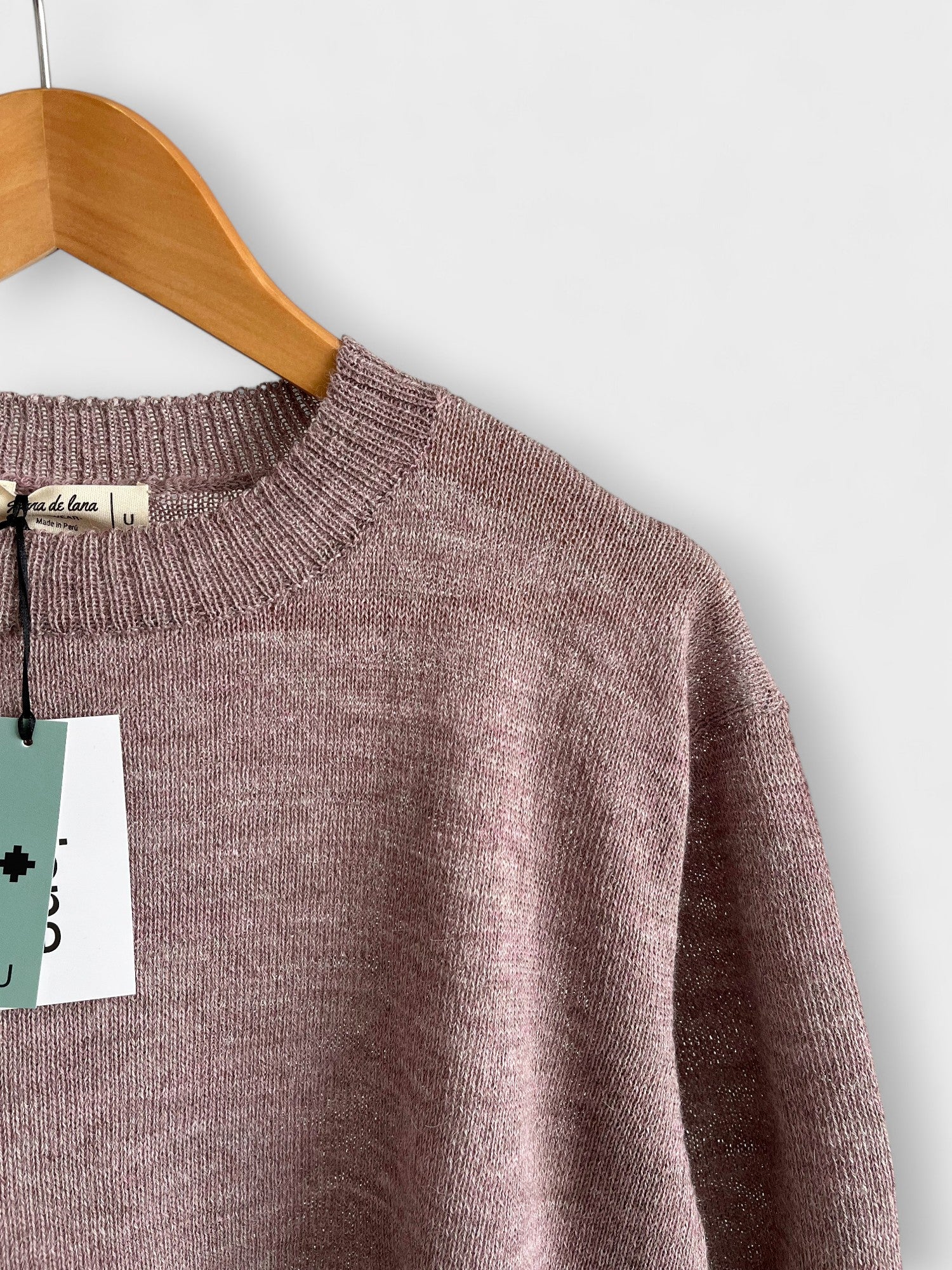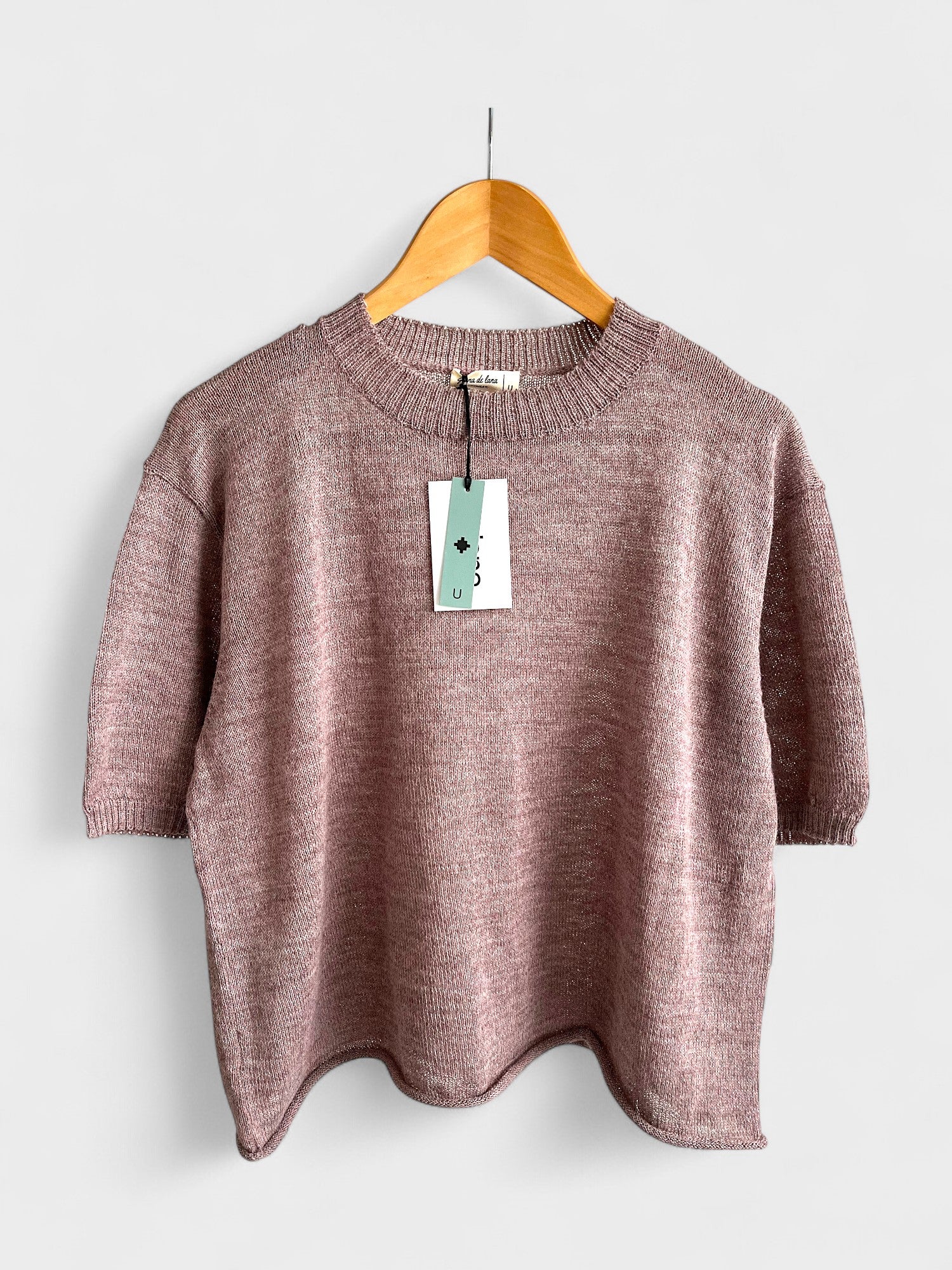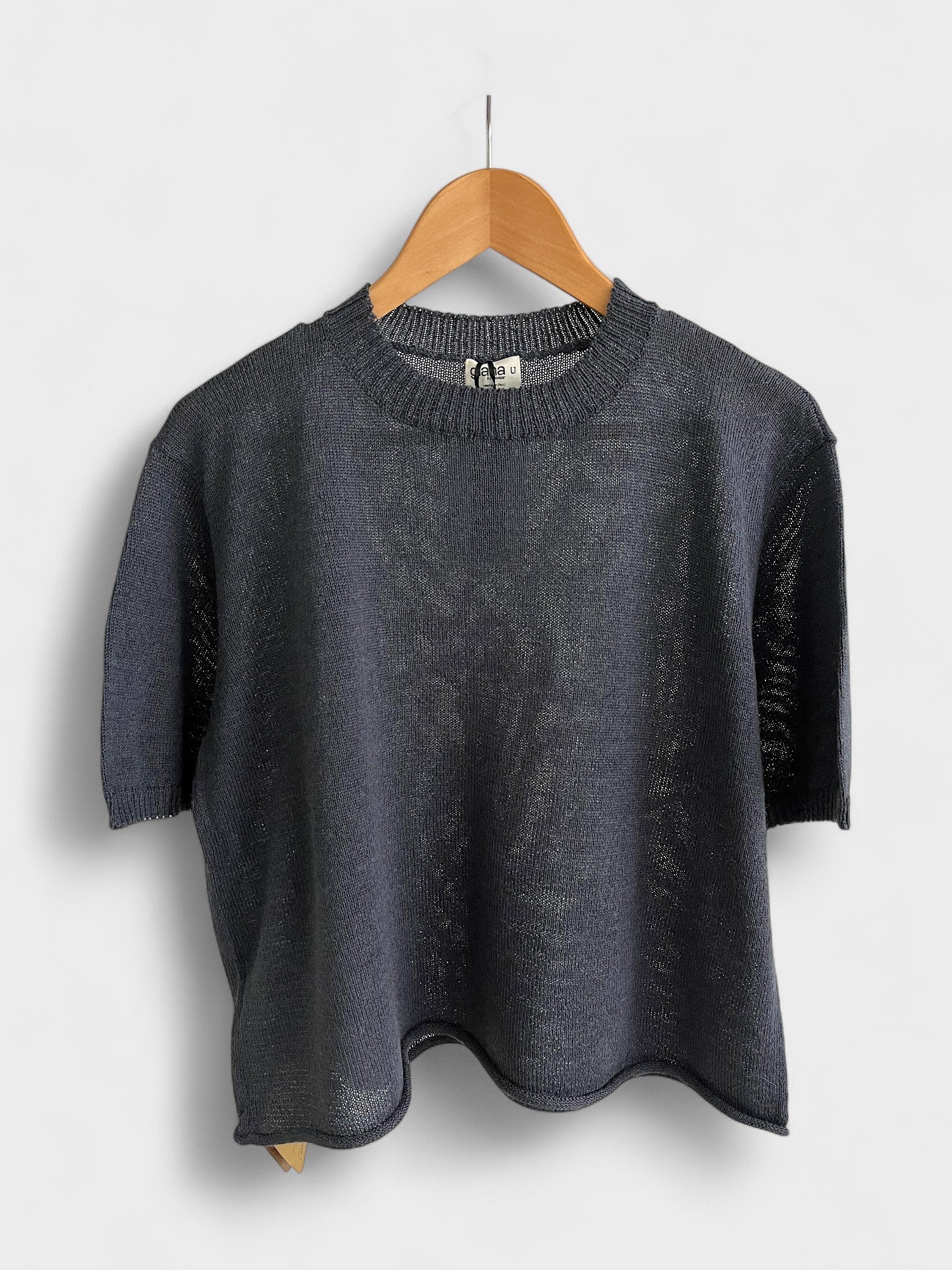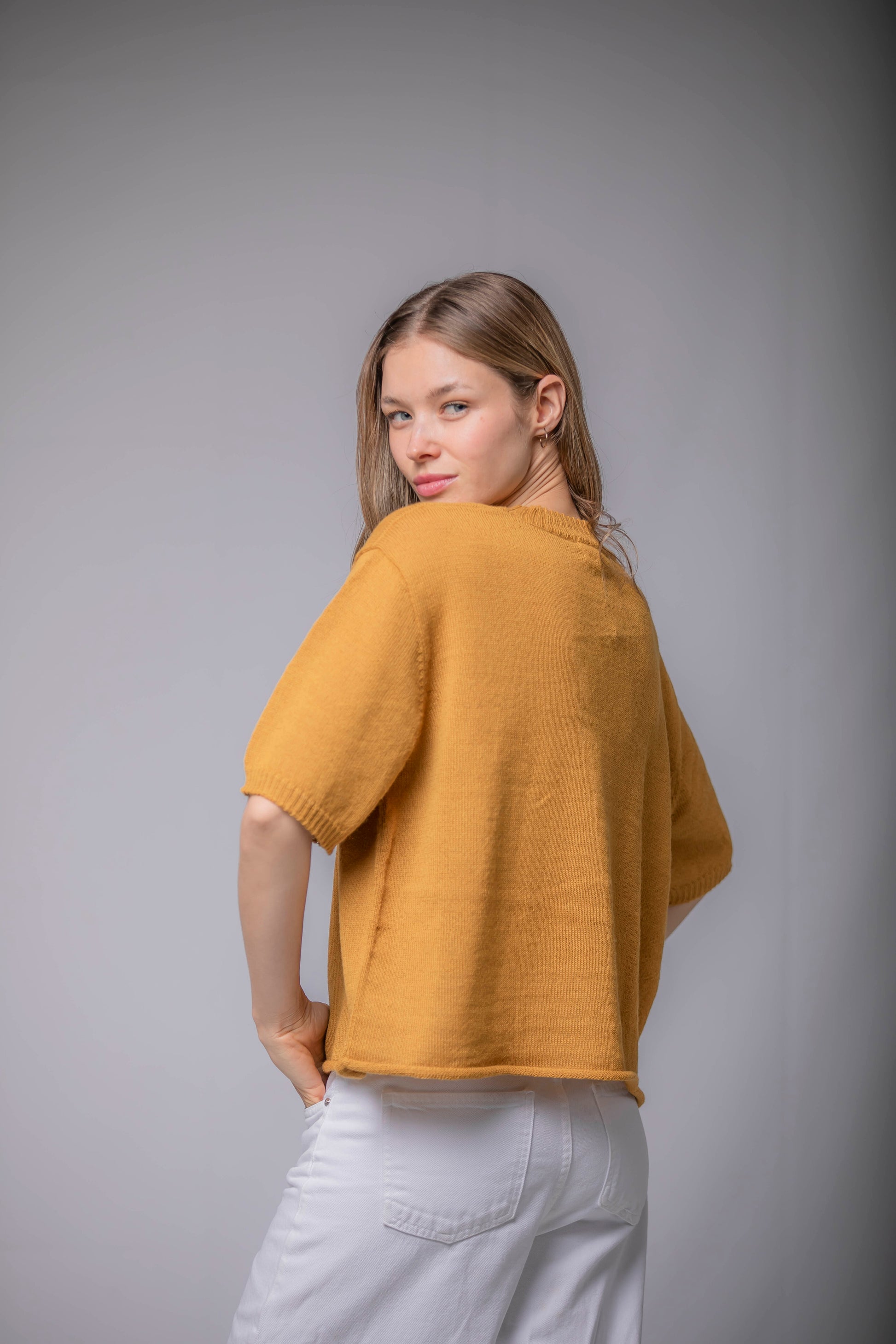 Tejida en 100% Baby Alpaca, envuelve con ligereza y suavidad en cada uso. Disponible en manga corta conserva una línea depurada que se eleva con su detalle más sutil: un acabado inferior que se enrolla de forma natural, como si la prenda respirara con quien la lleva.