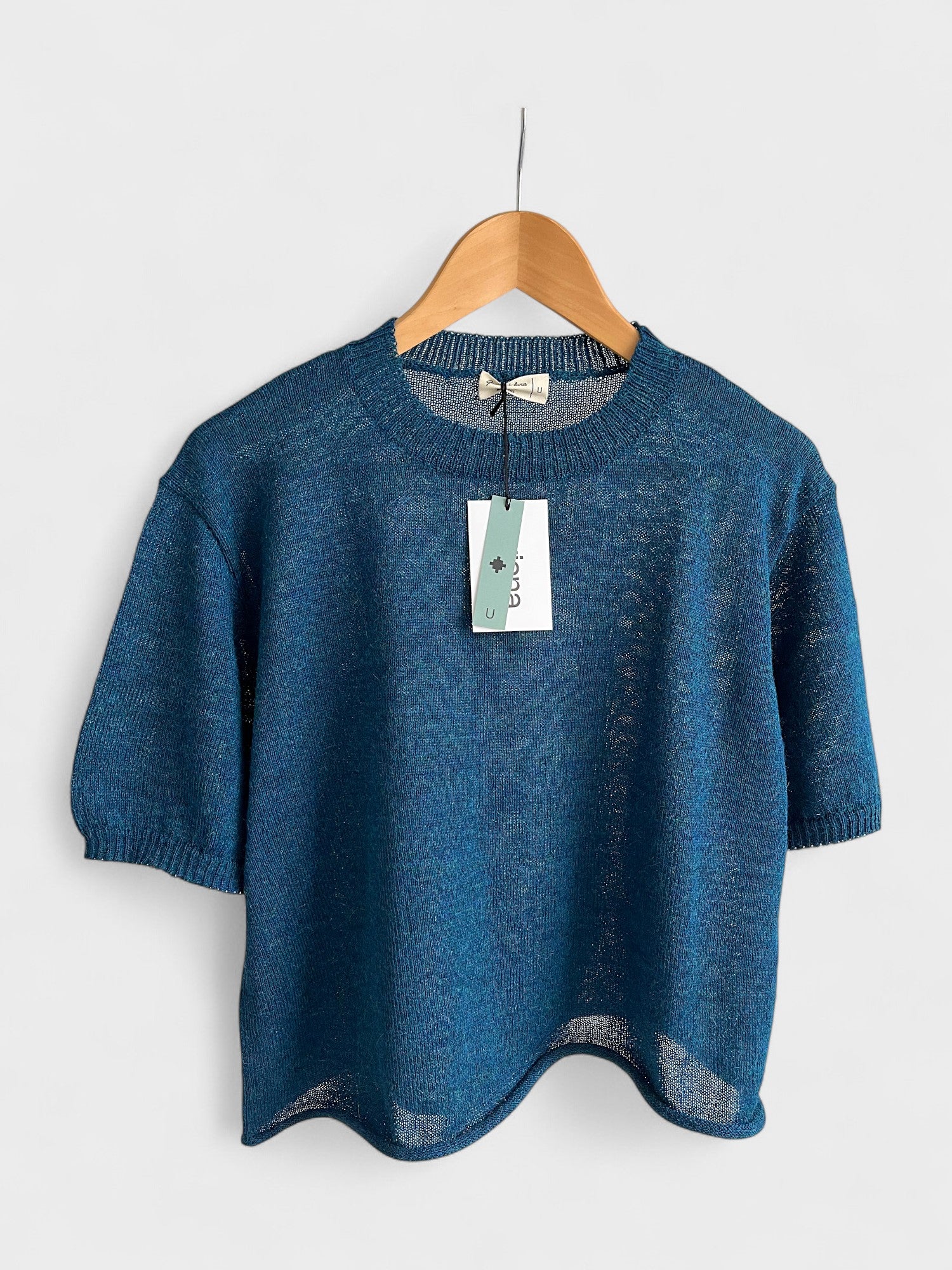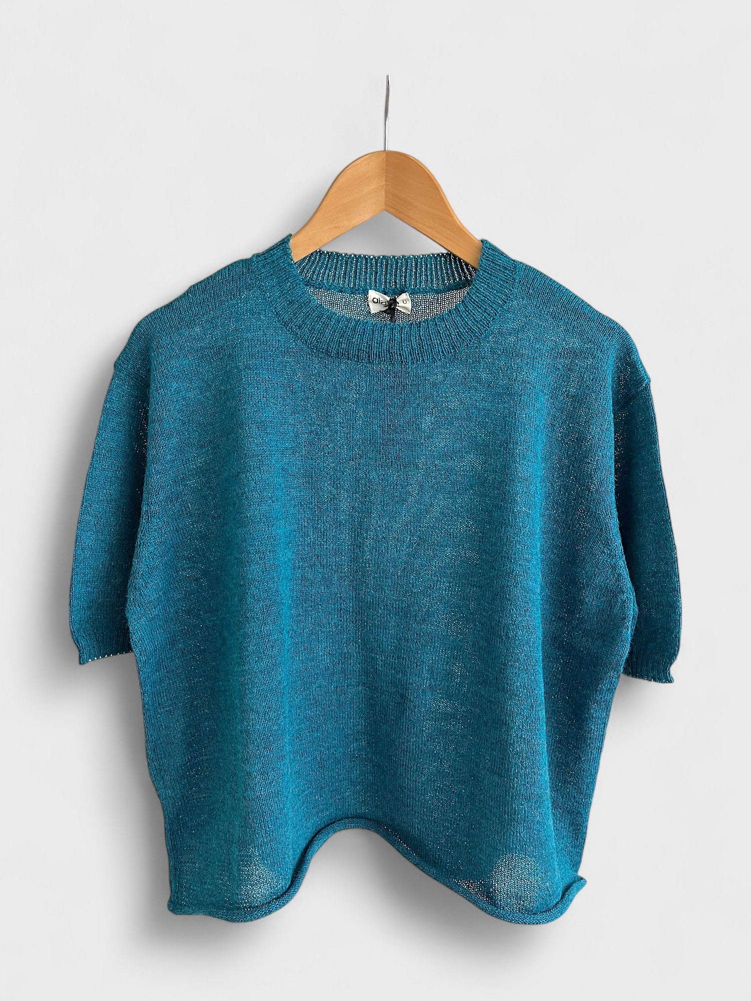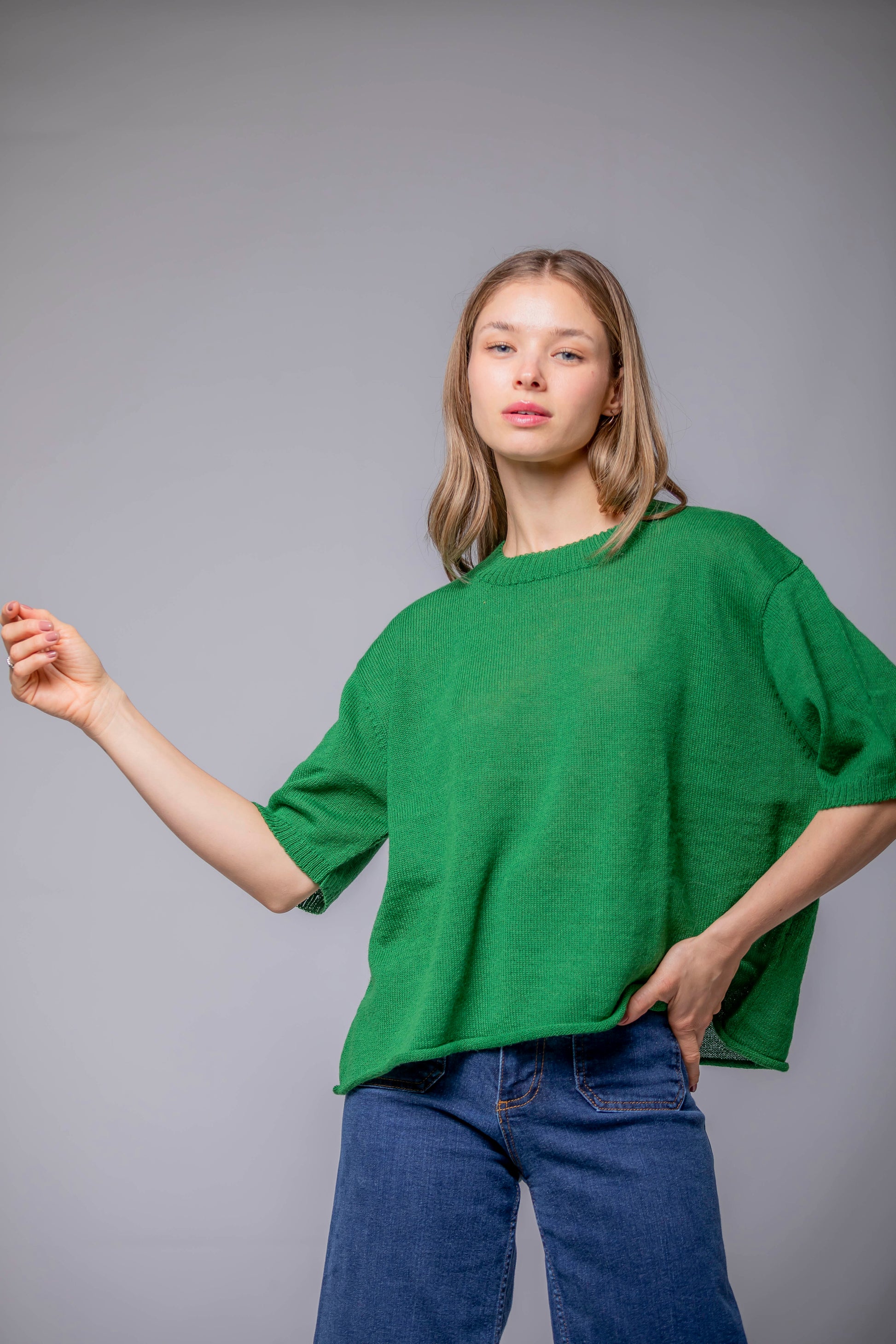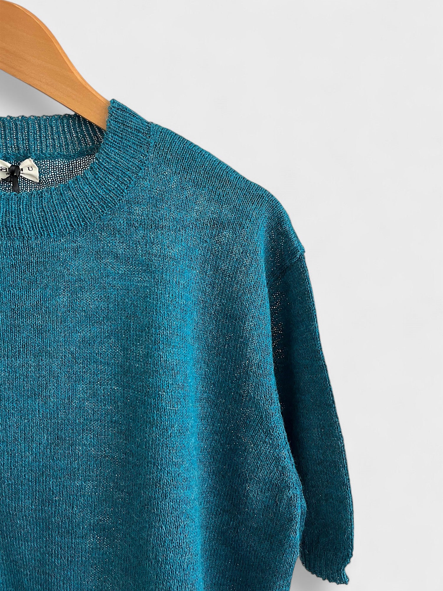 Tejida en 100% Baby Alpaca, envuelve con ligereza y suavidad en cada uso. Disponible en manga corta conserva una línea depurada que se eleva con su detalle más sutil: un acabado inferior que se enrolla de forma natural, como si la prenda respirara con quien la lleva.
