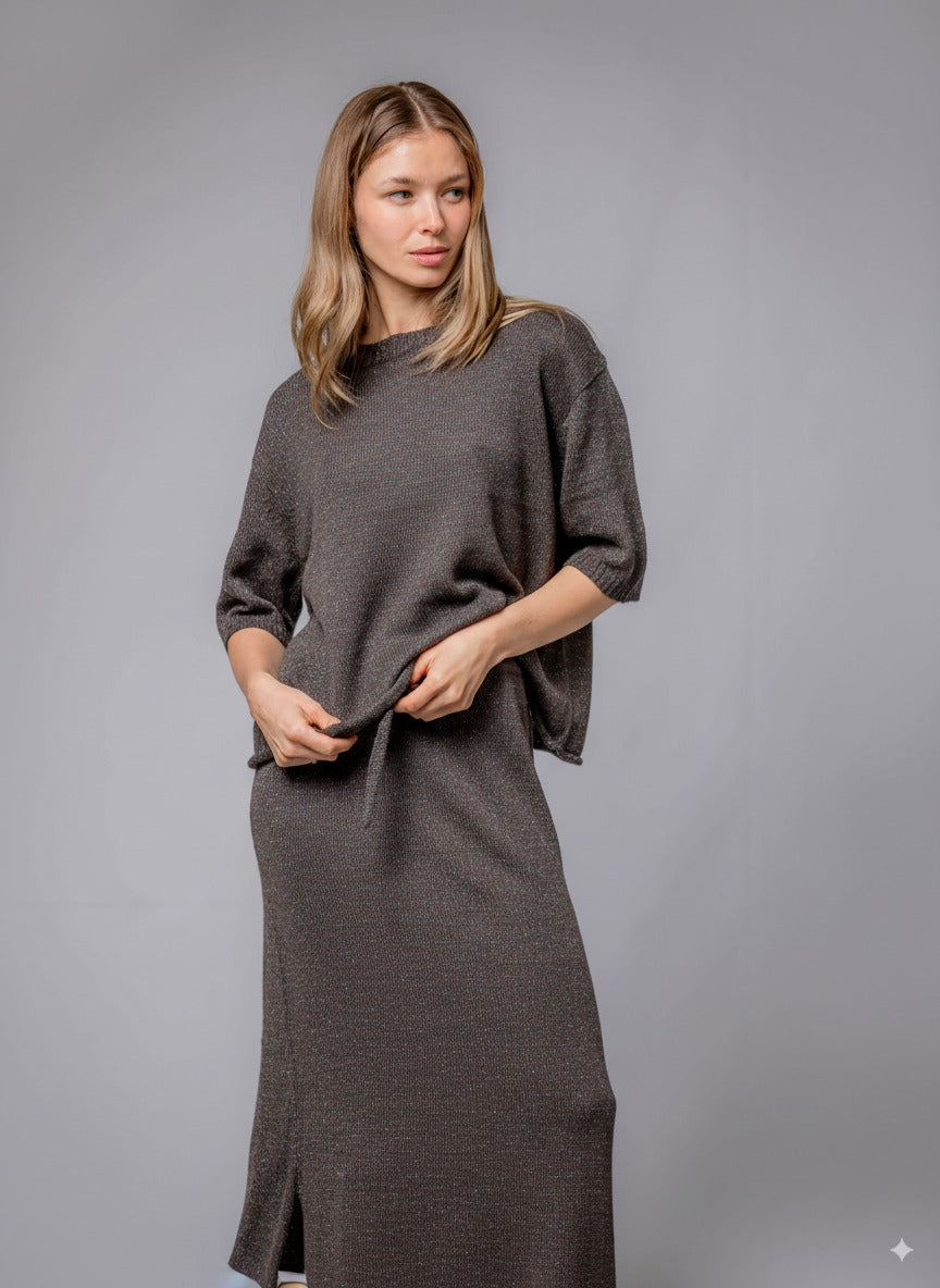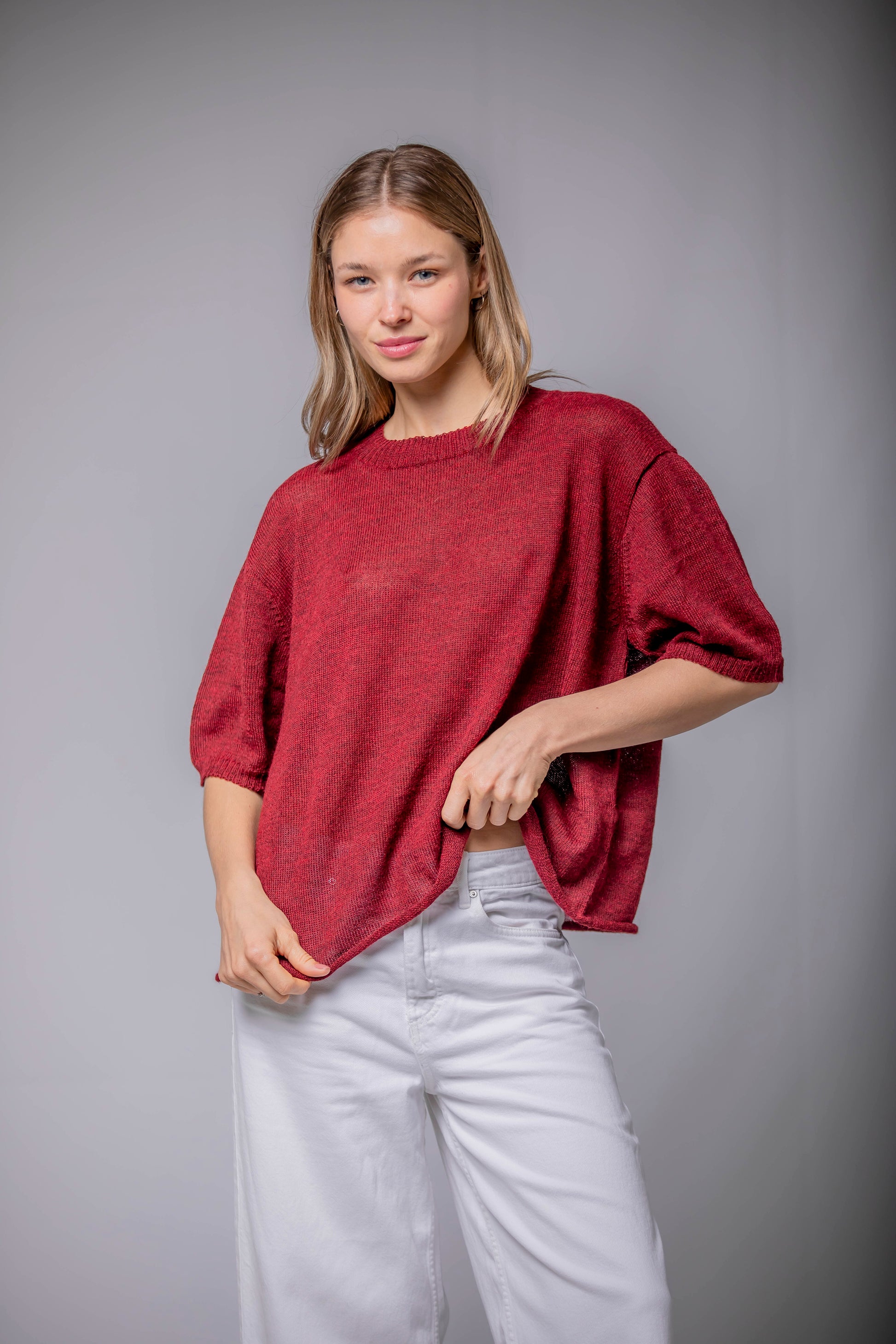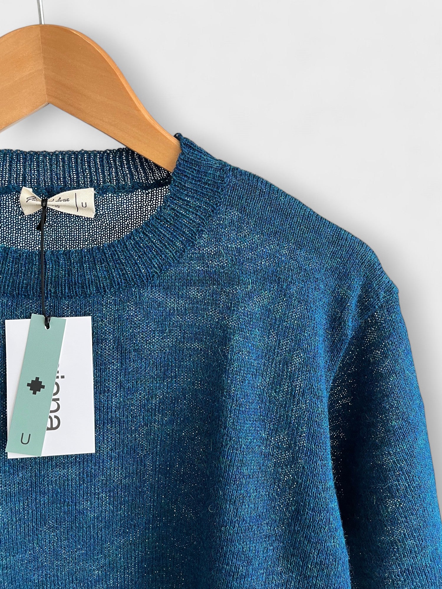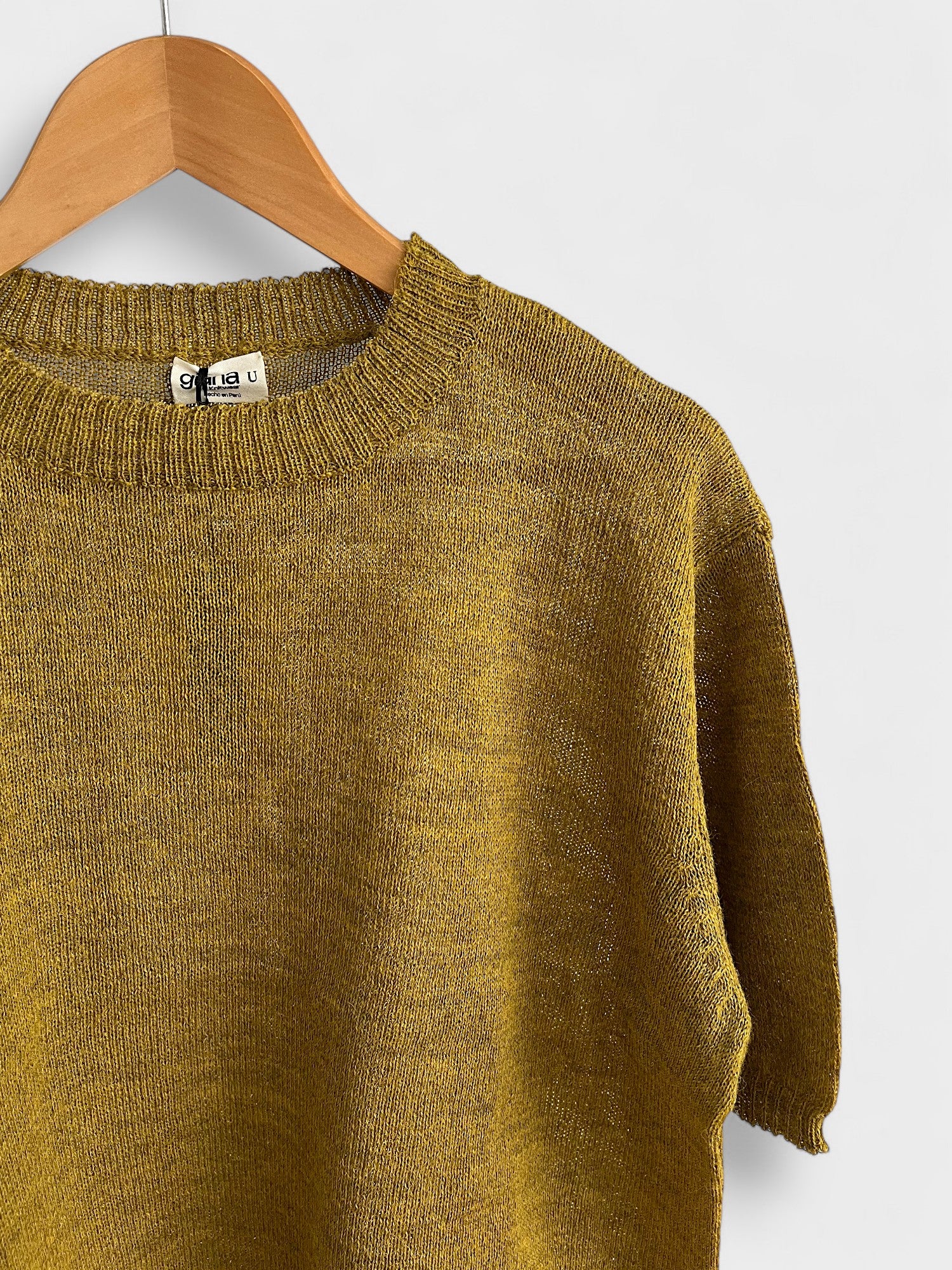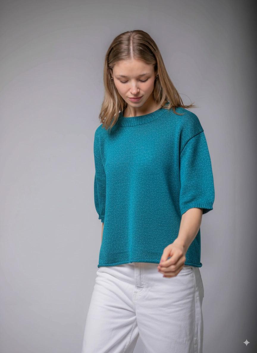 Tejida en 100% Baby Alpaca, envuelve con ligereza y suavidad en cada uso. Disponible en manga corta conserva una línea depurada que se eleva con su detalle más sutil: un acabado inferior que se enrolla de forma natural, como si la prenda respirara con quien la lleva.
