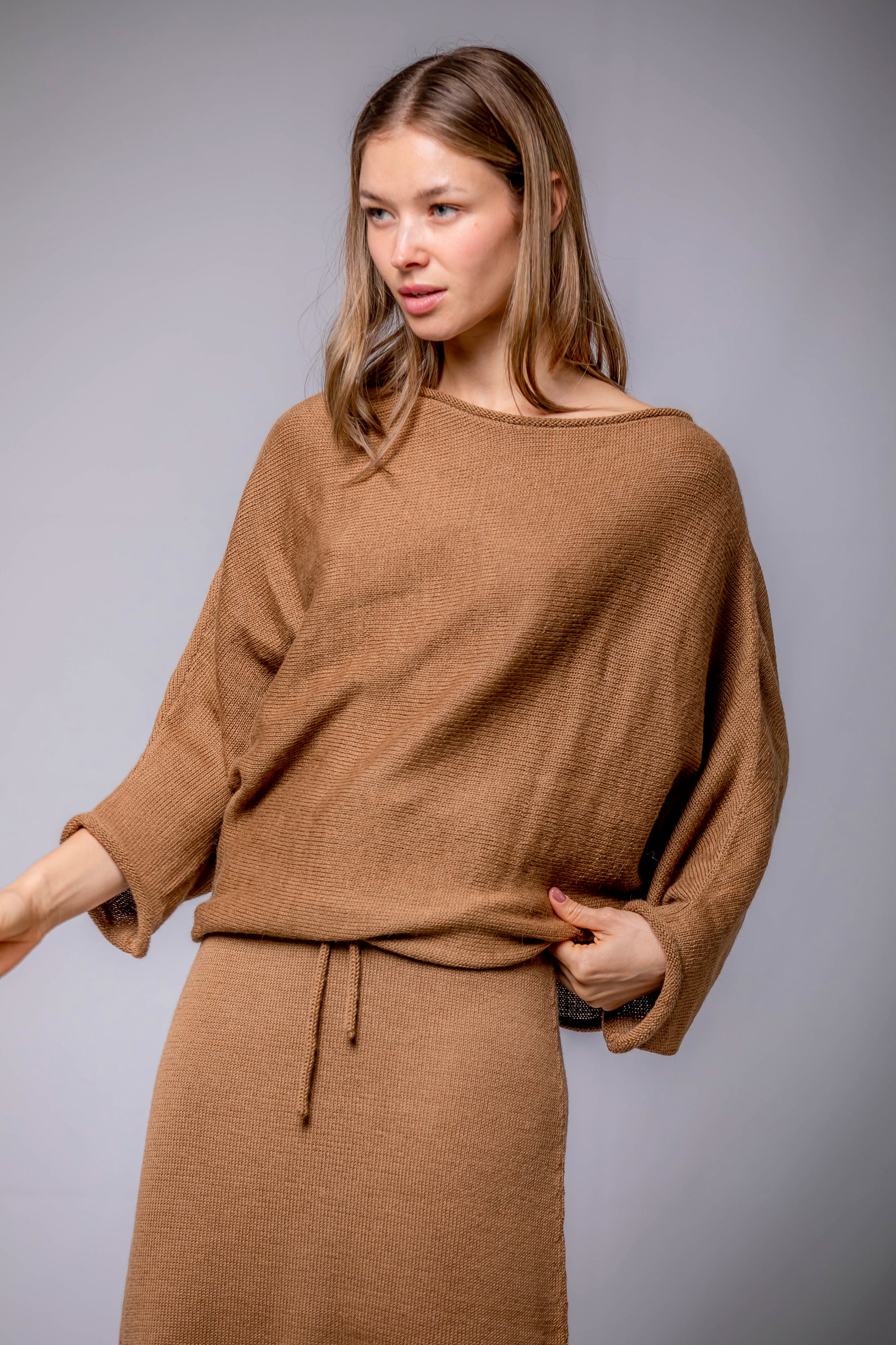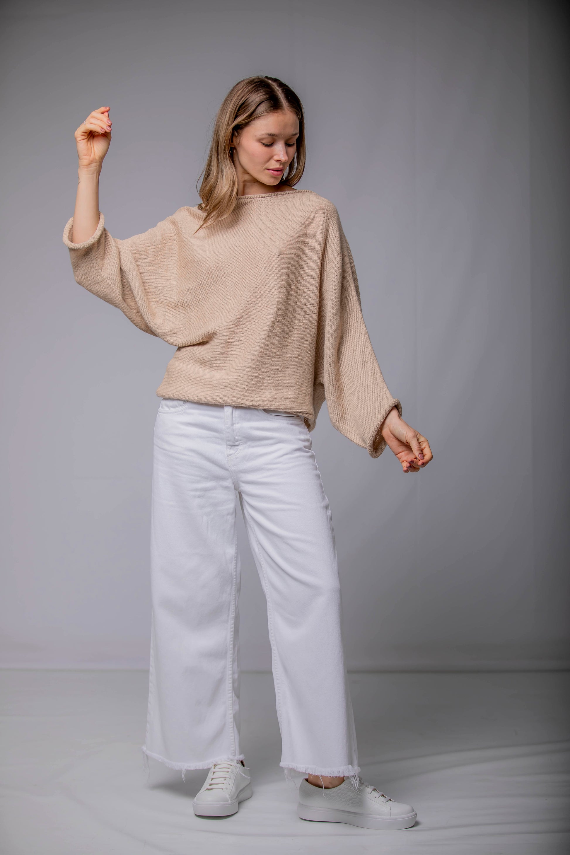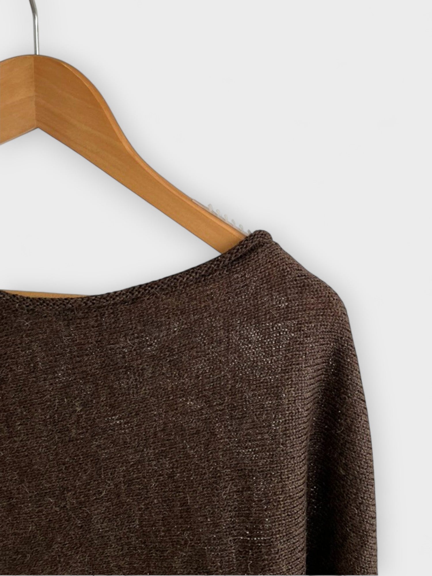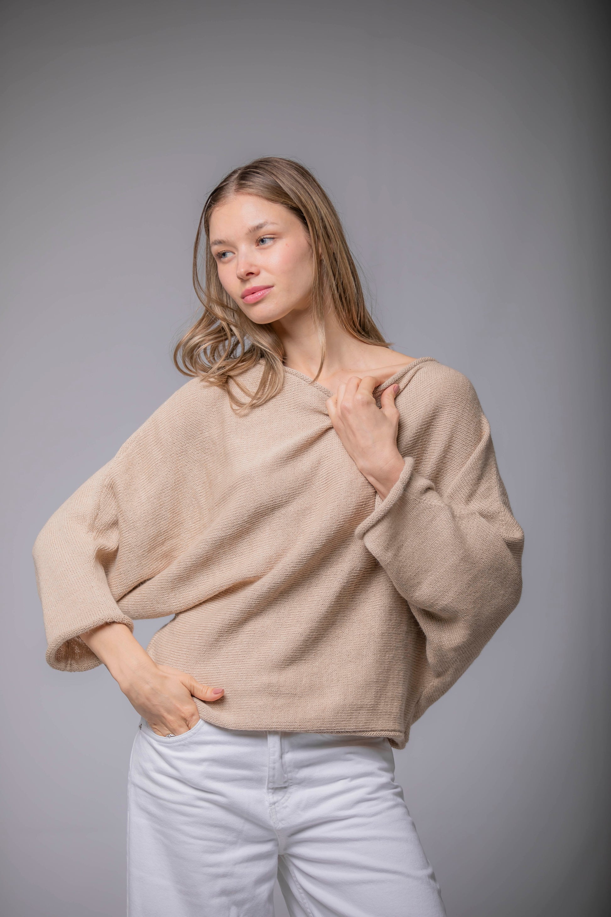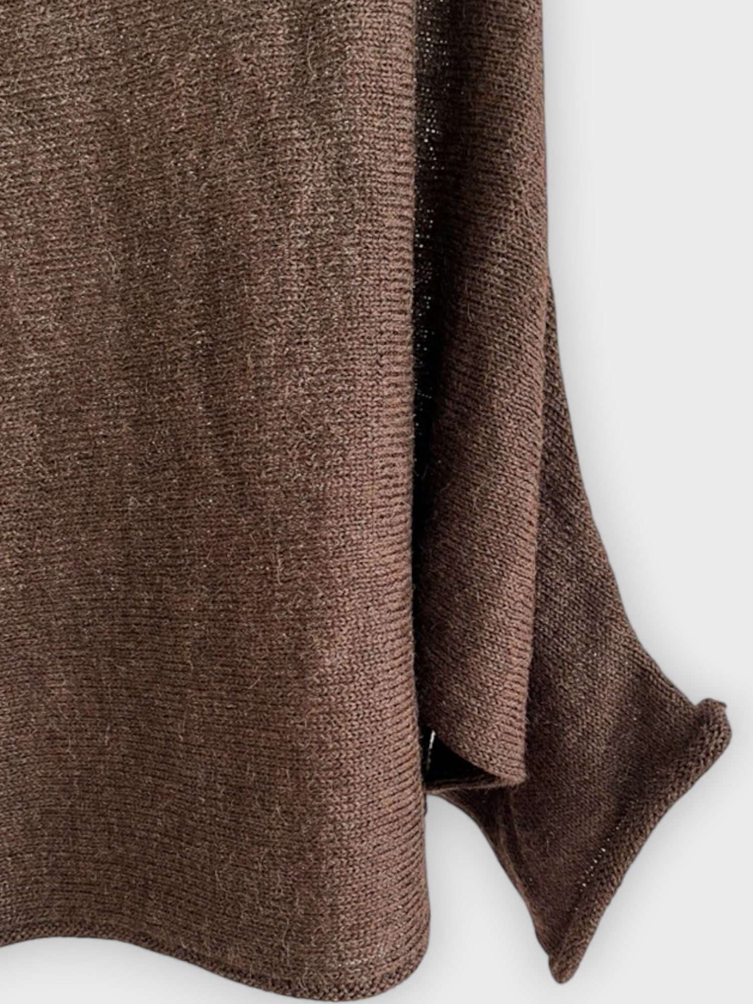 Confeccionada en 100% Baby Alpaca, Nova reinterpreta la silueta clásica con una asimetría sutil y encantadora. Una manga ligeramente más alta que la otra, el cuello abierto con caída lateral y detalles fruncidos en las mangas realzan su carácter singular.