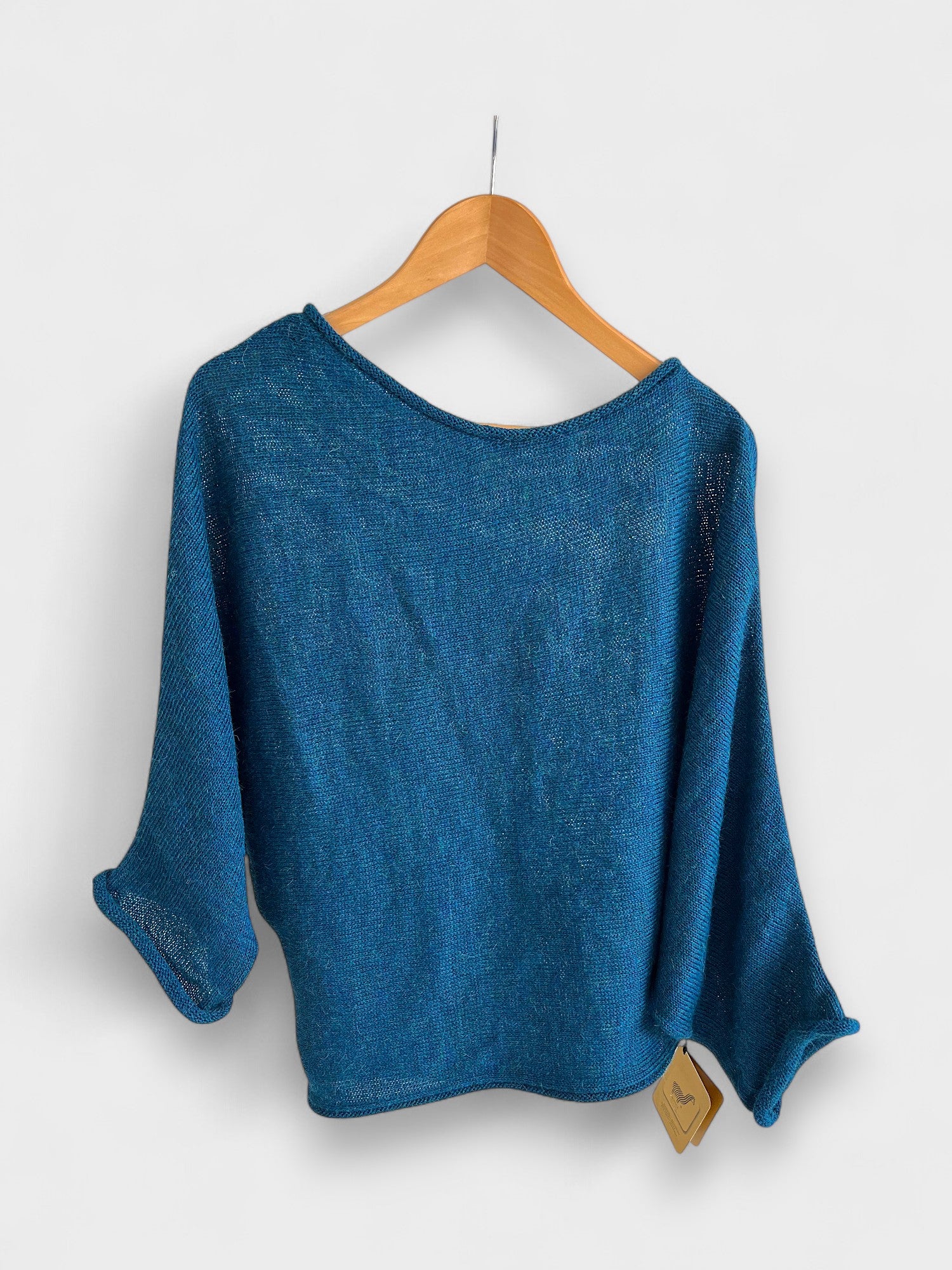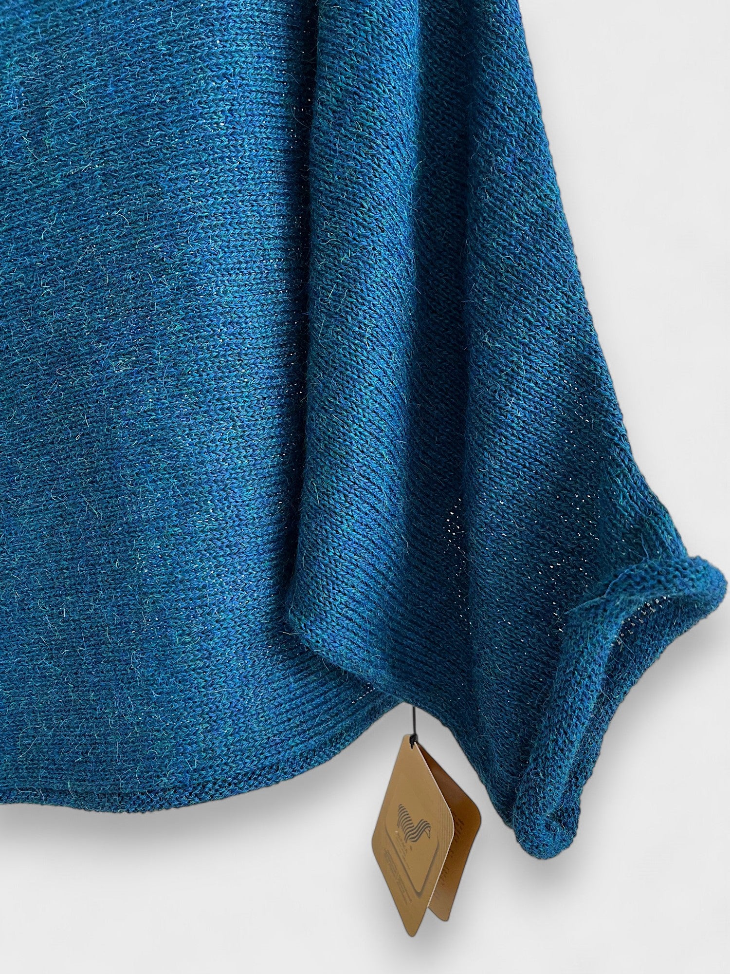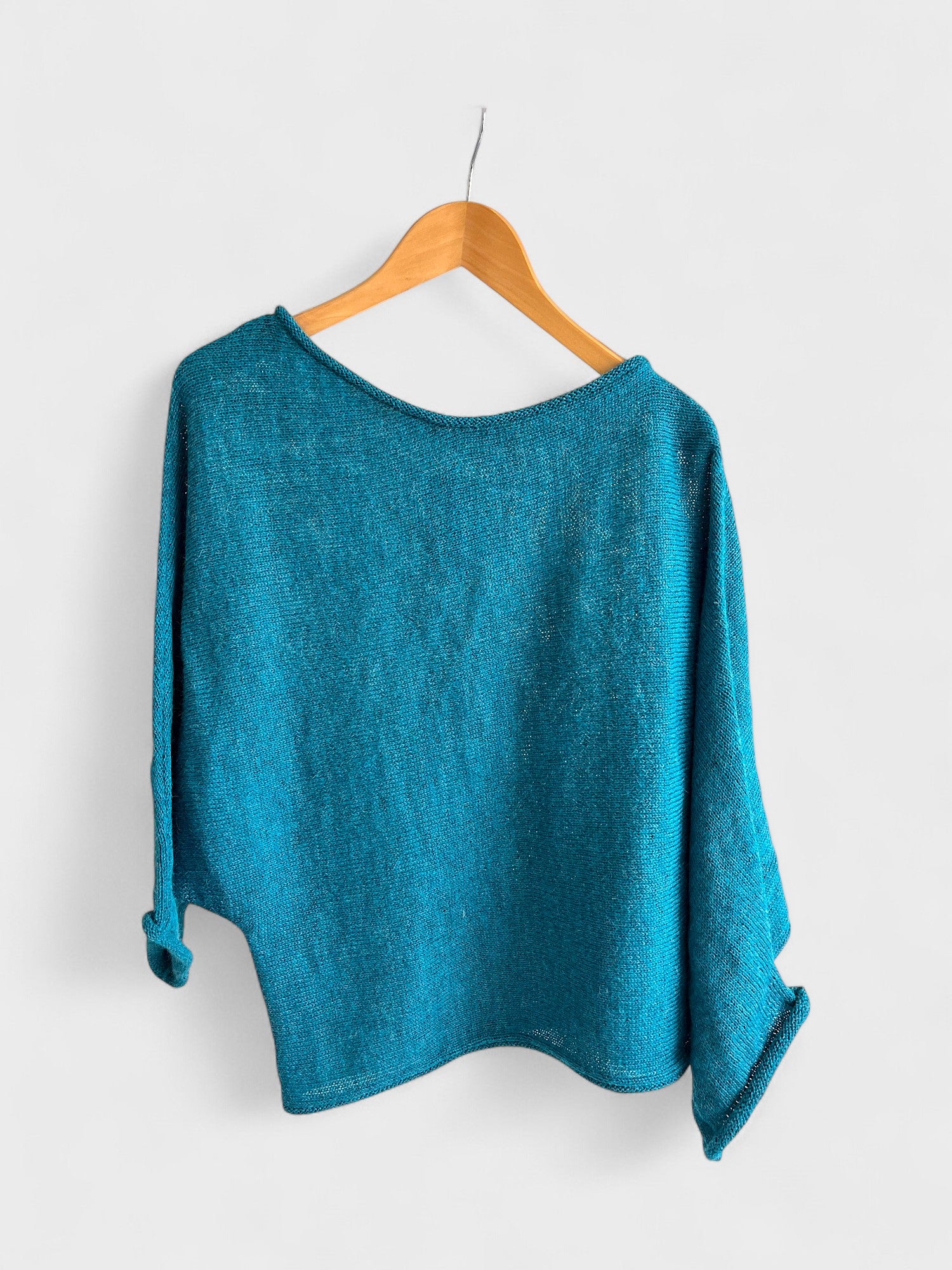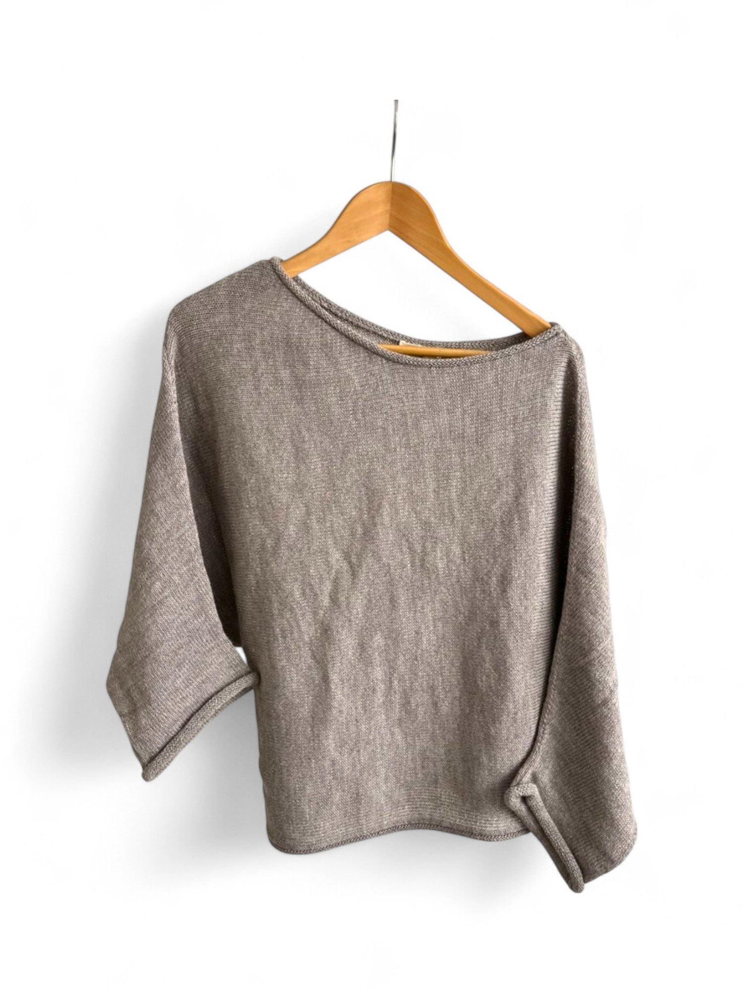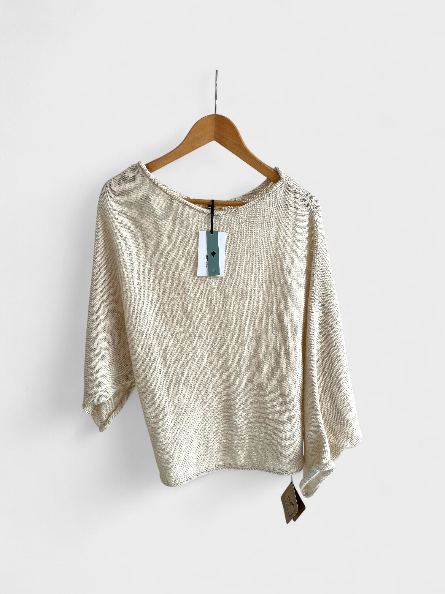 Confeccionada en 100% Baby Alpaca, Nova reinterpreta la silueta clásica con una asimetría sutil y encantadora. Una manga ligeramente más alta que la otra, el cuello abierto con caída lateral y detalles fruncidos en las mangas realzan su carácter singular.
