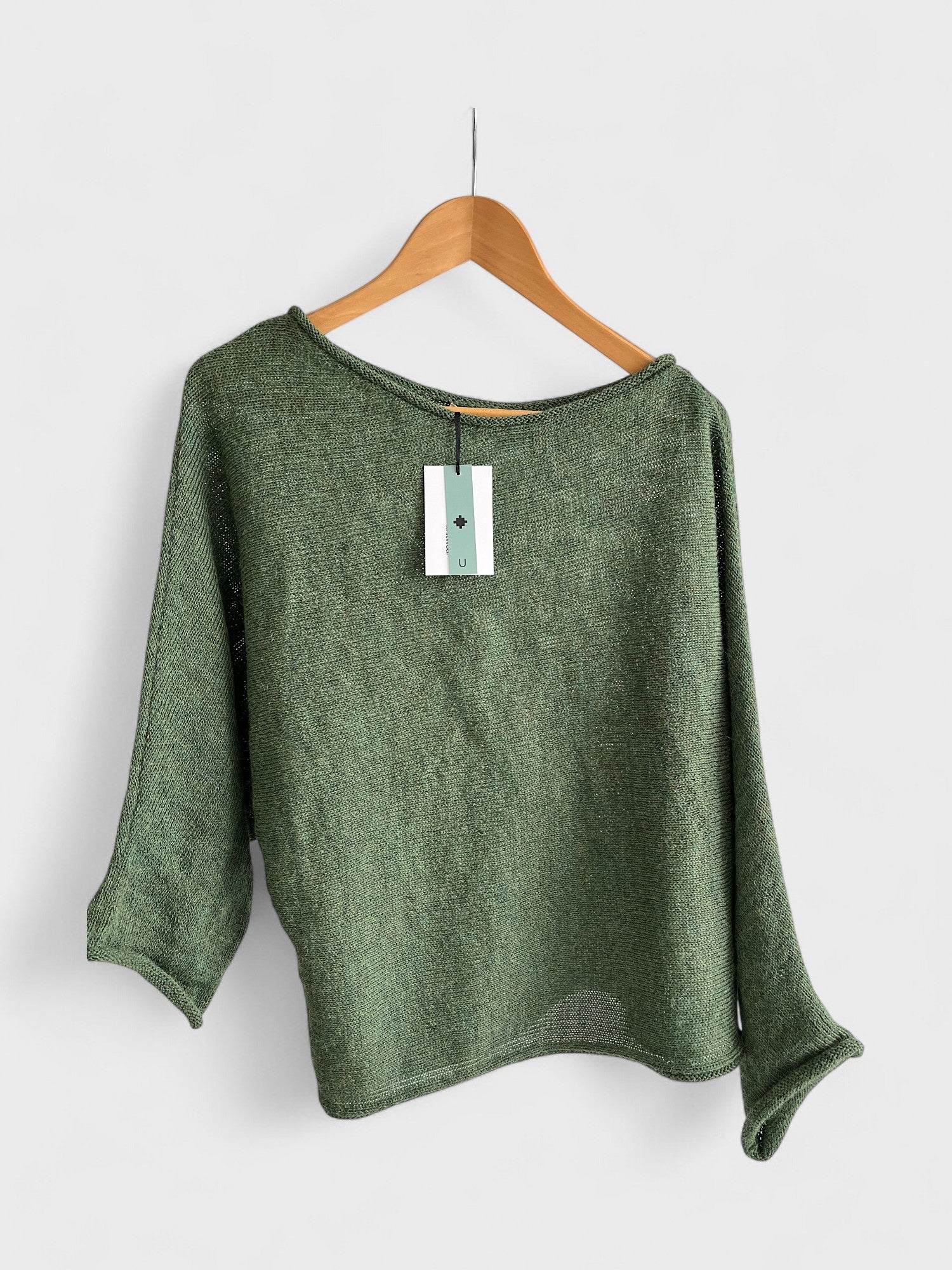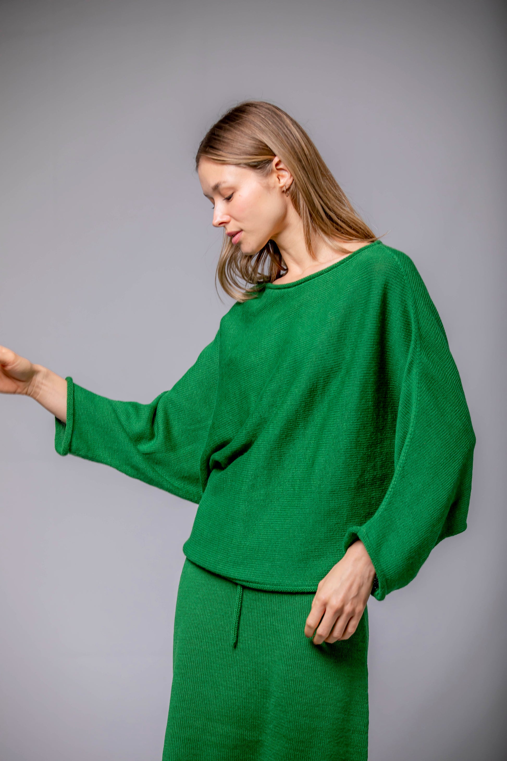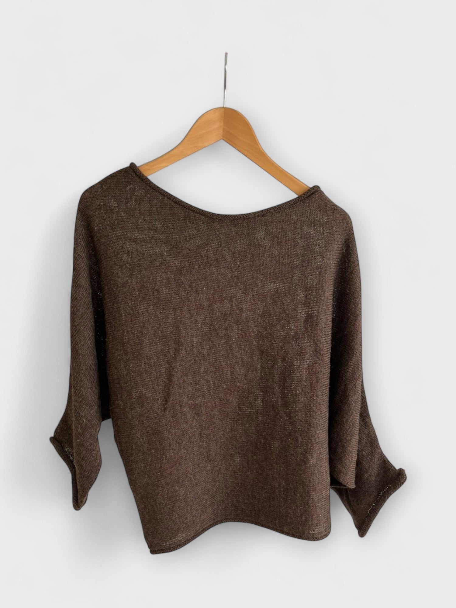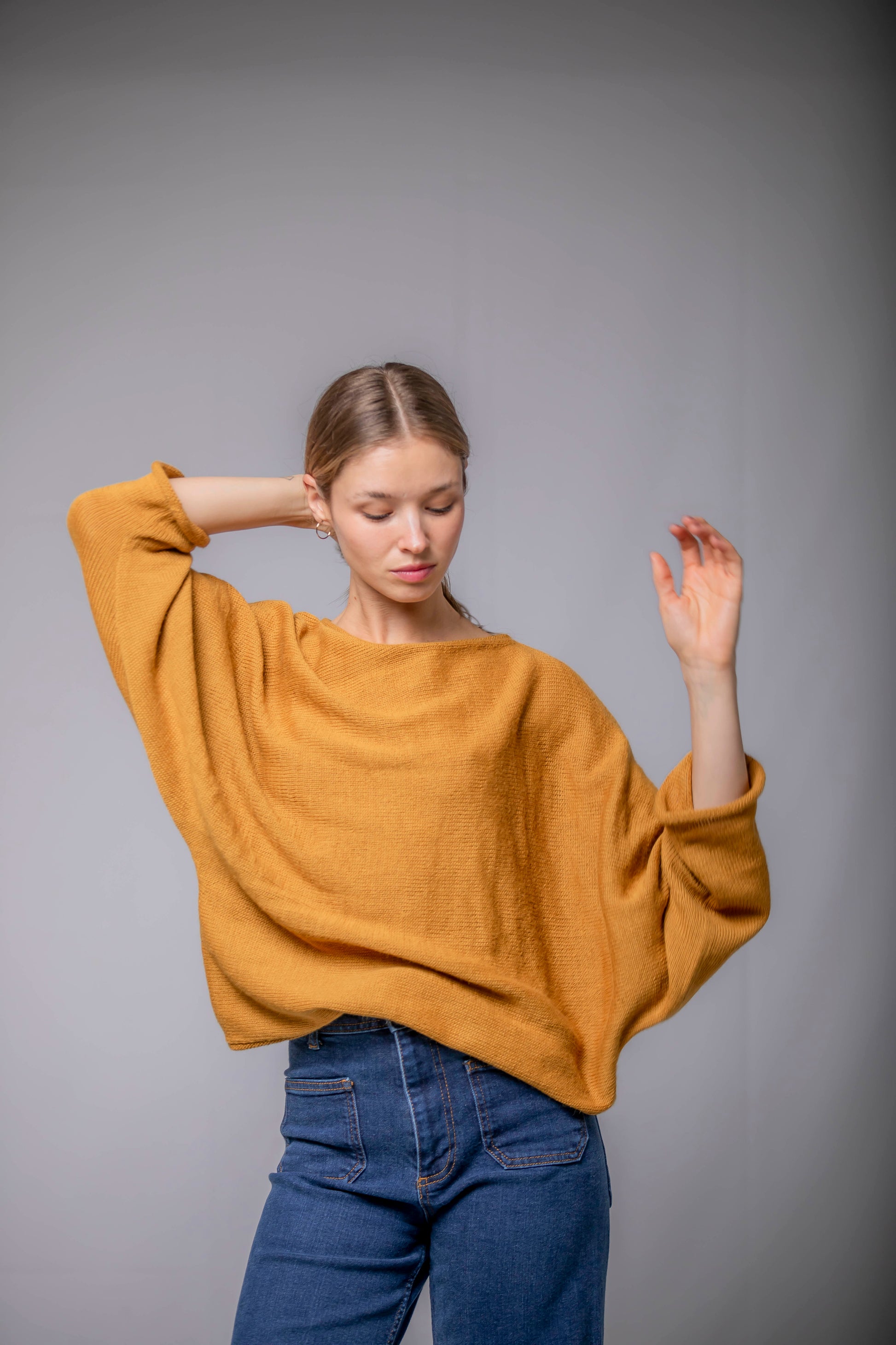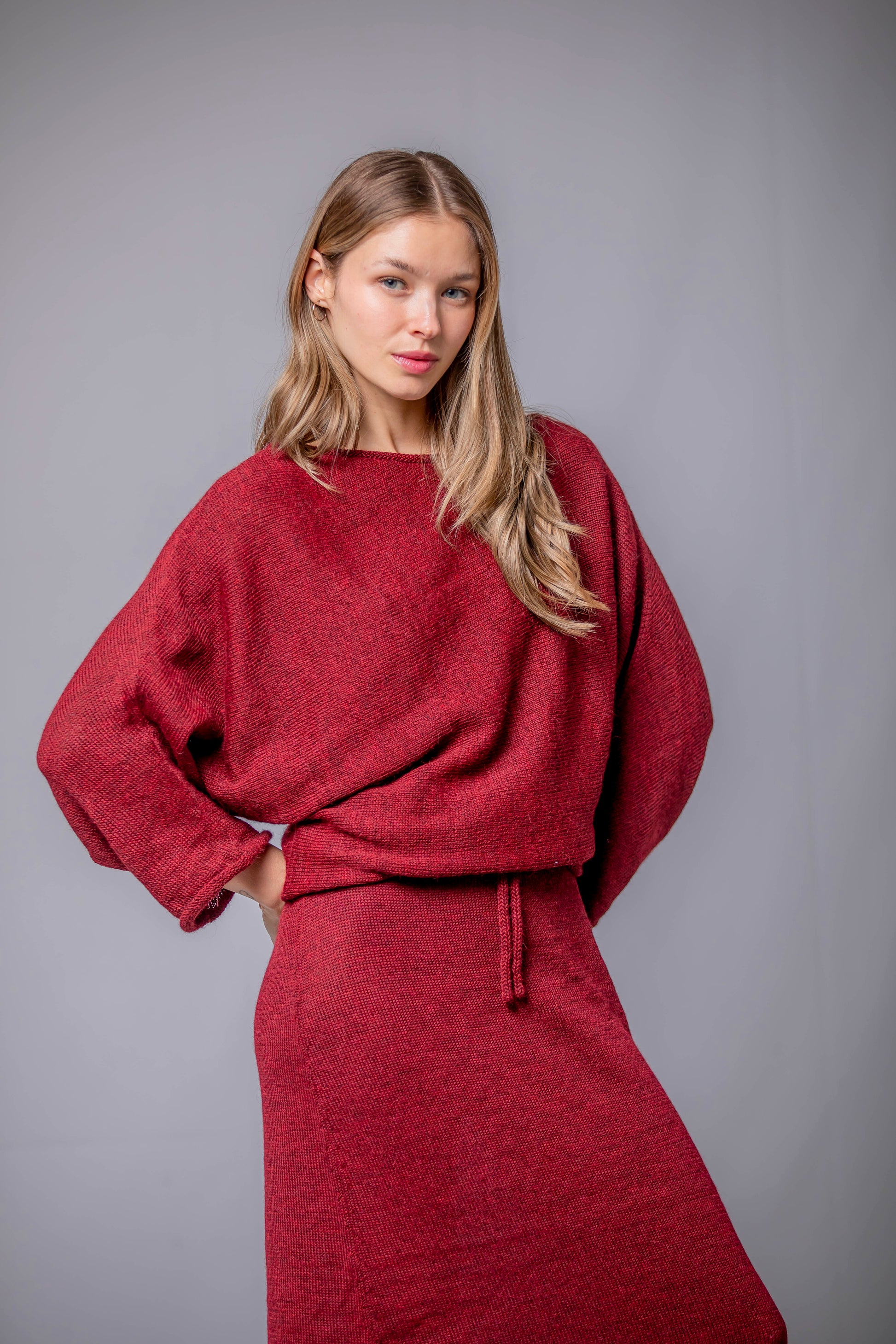 Confeccionada en 100% Baby Alpaca, Nova reinterpreta la silueta clásica con una asimetría sutil y encantadora. Una manga ligeramente más alta que la otra, el cuello abierto con caída lateral y detalles fruncidos en las mangas realzan su carácter singular.