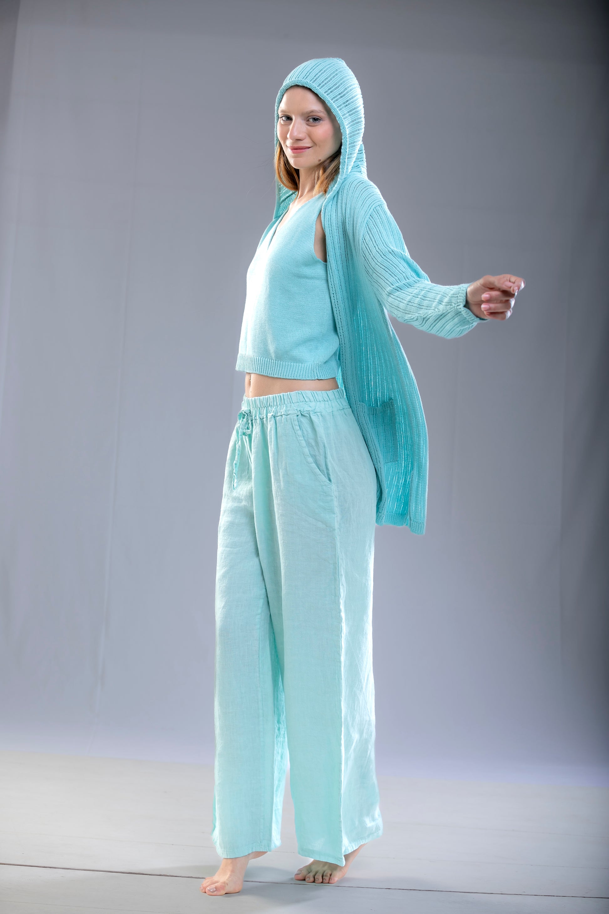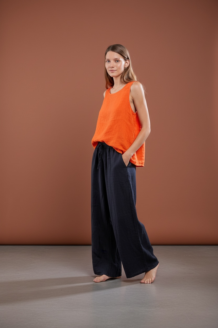 De caída fluida y movimiento ligero, este pantalón en 100% lino redefine la comodidad con una silueta amplia y natural.
