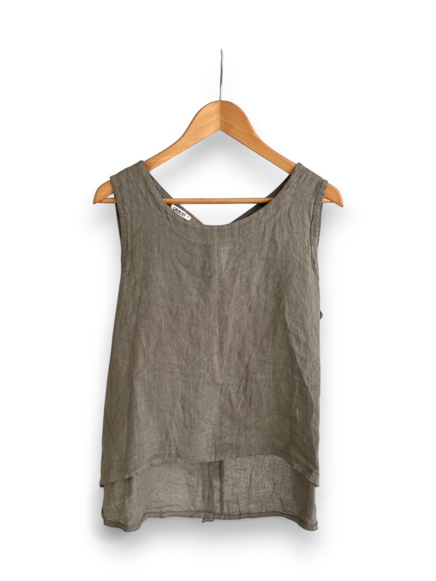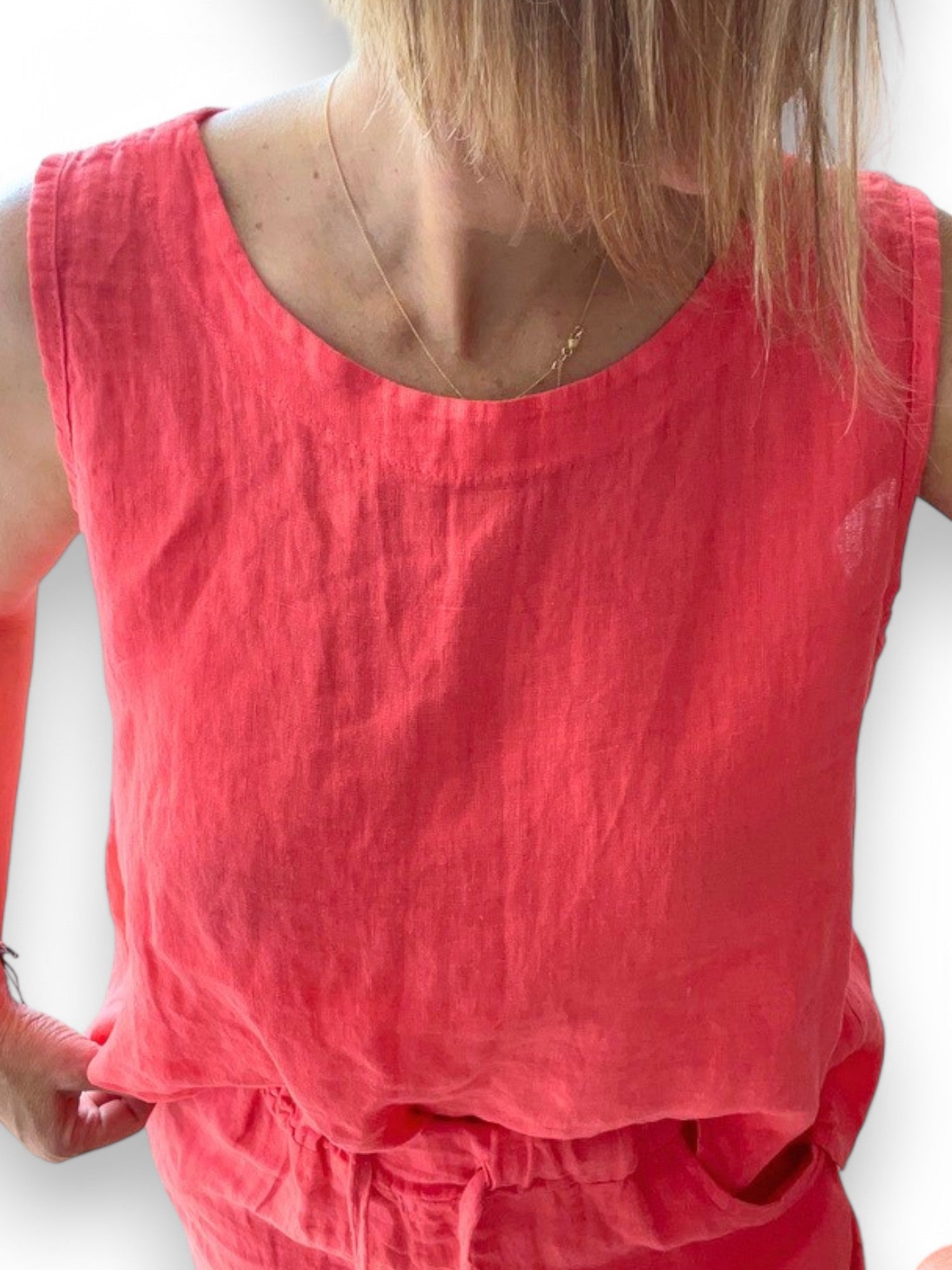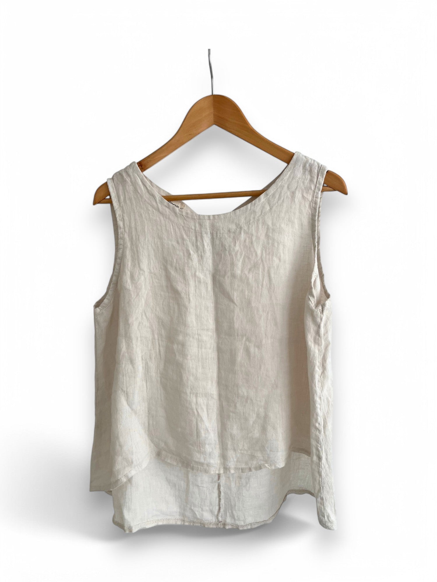 Ligero y lleno de matices, este top de lino confeccionado en Italia ha sido elegido por Giana Complementos por su equilibrio entre frescura, simplicidad y detalle. Su diseño más corto por delante y ligeramente más largo por detrás crea una silueta fluida y favorecedora, perfecta para combinar con prendas de talle alto o superponer con naturalidad.