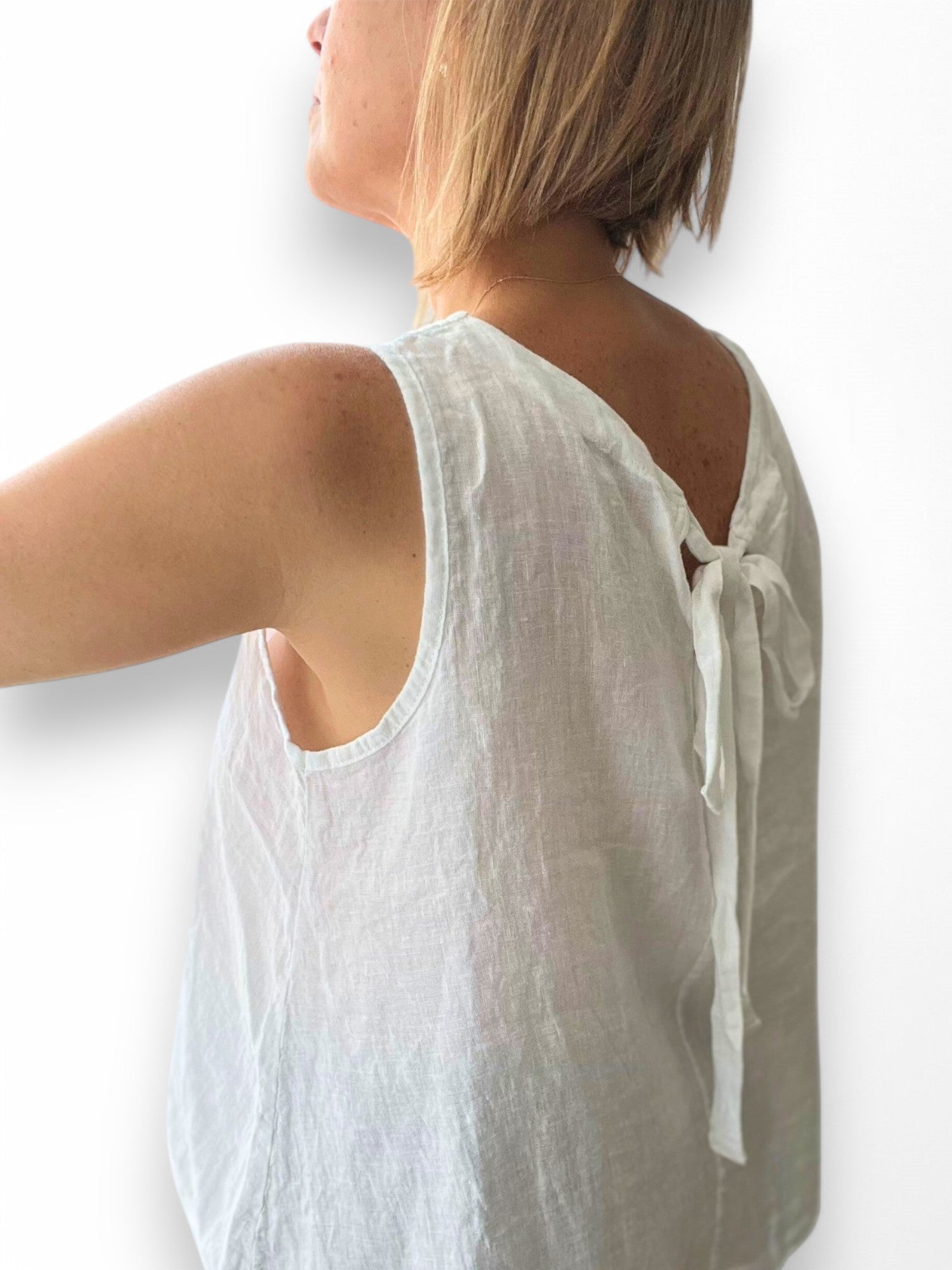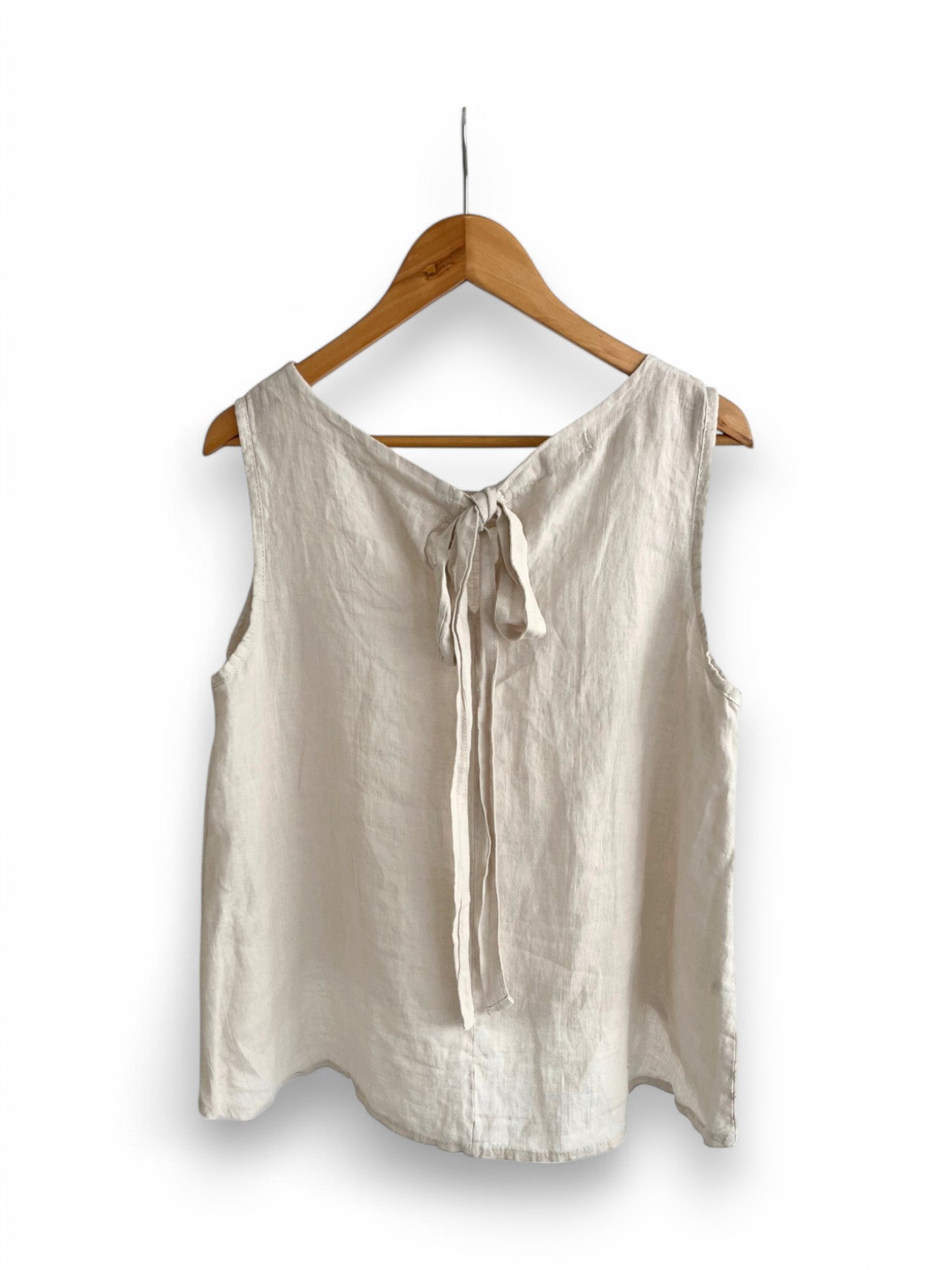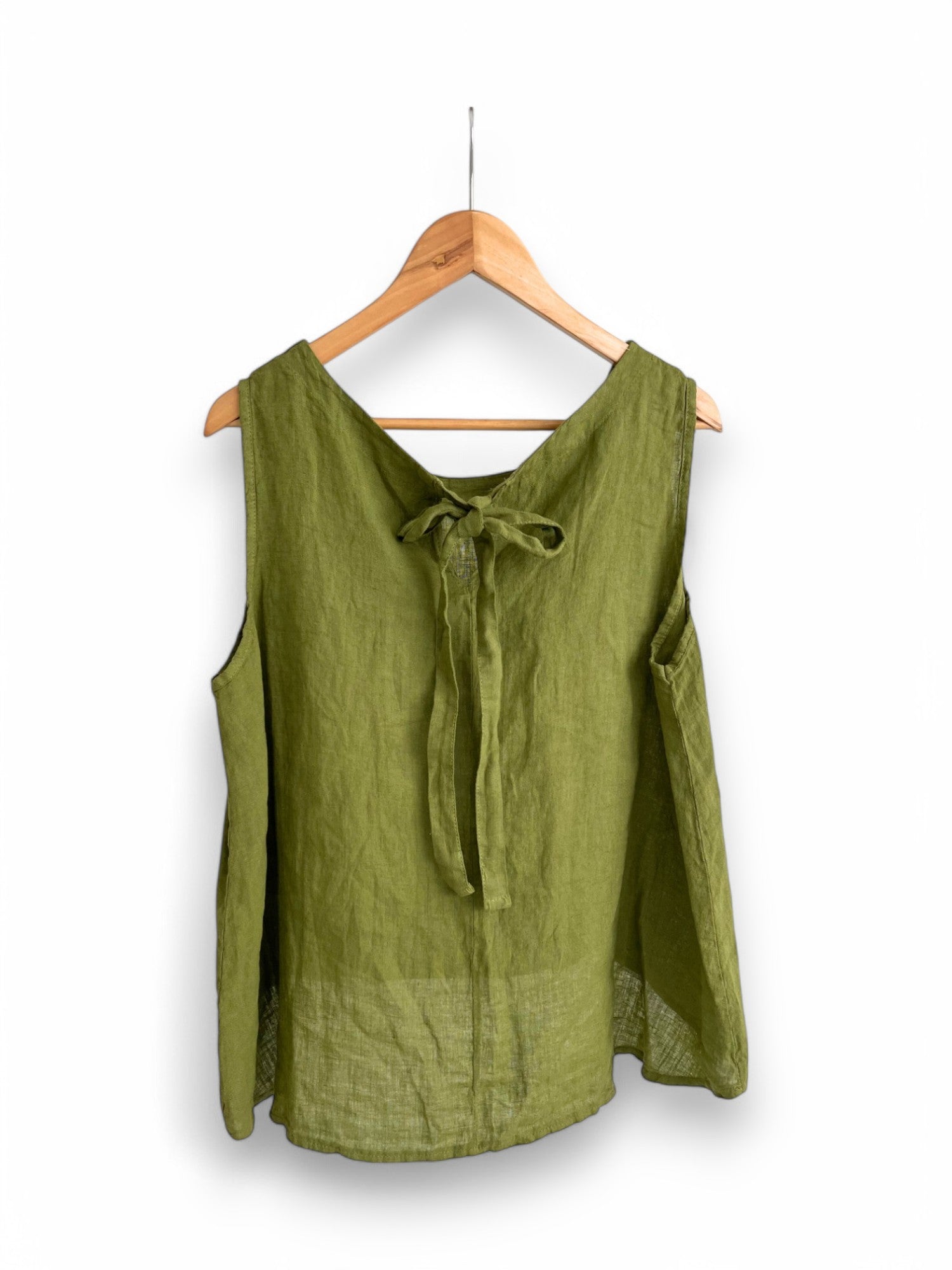 La espalda se convierte en protagonista gracias al lazo ajustable, que no solo aporta un toque delicado y femenino, sino que permite adaptar el ajuste con comodidad. El lino natural ofrece una textura fresca y aireada que respira con el cuerpo y se mueve con ligereza.