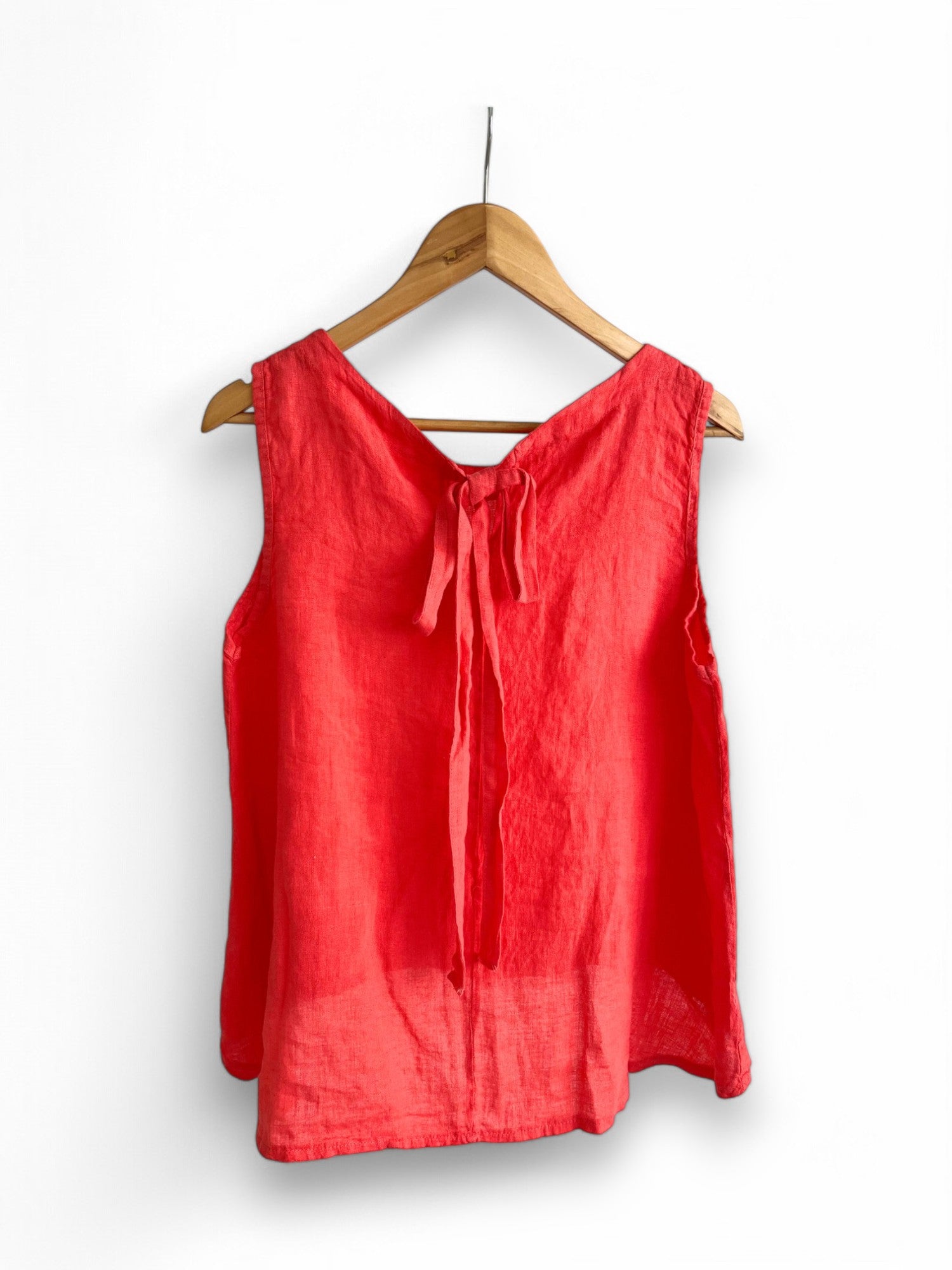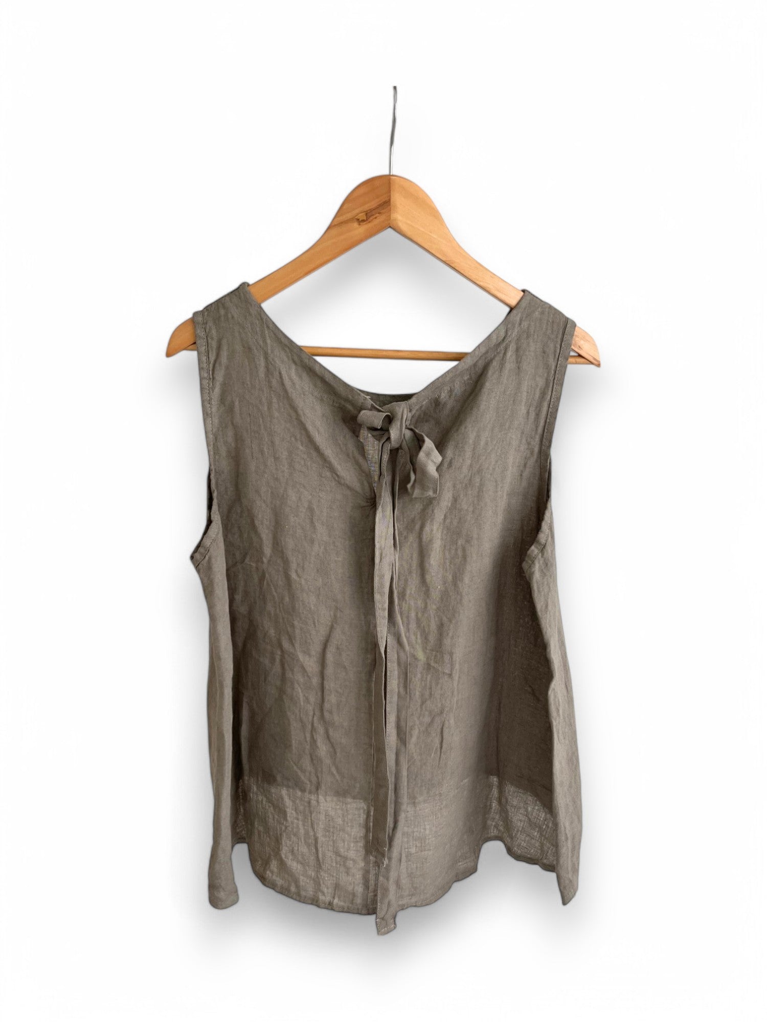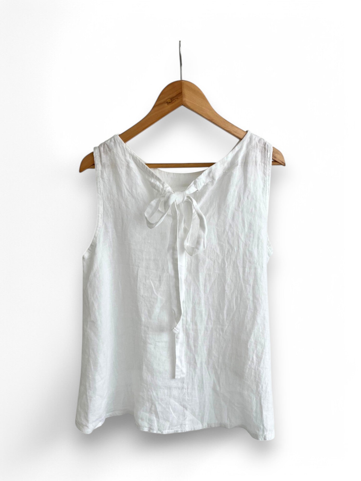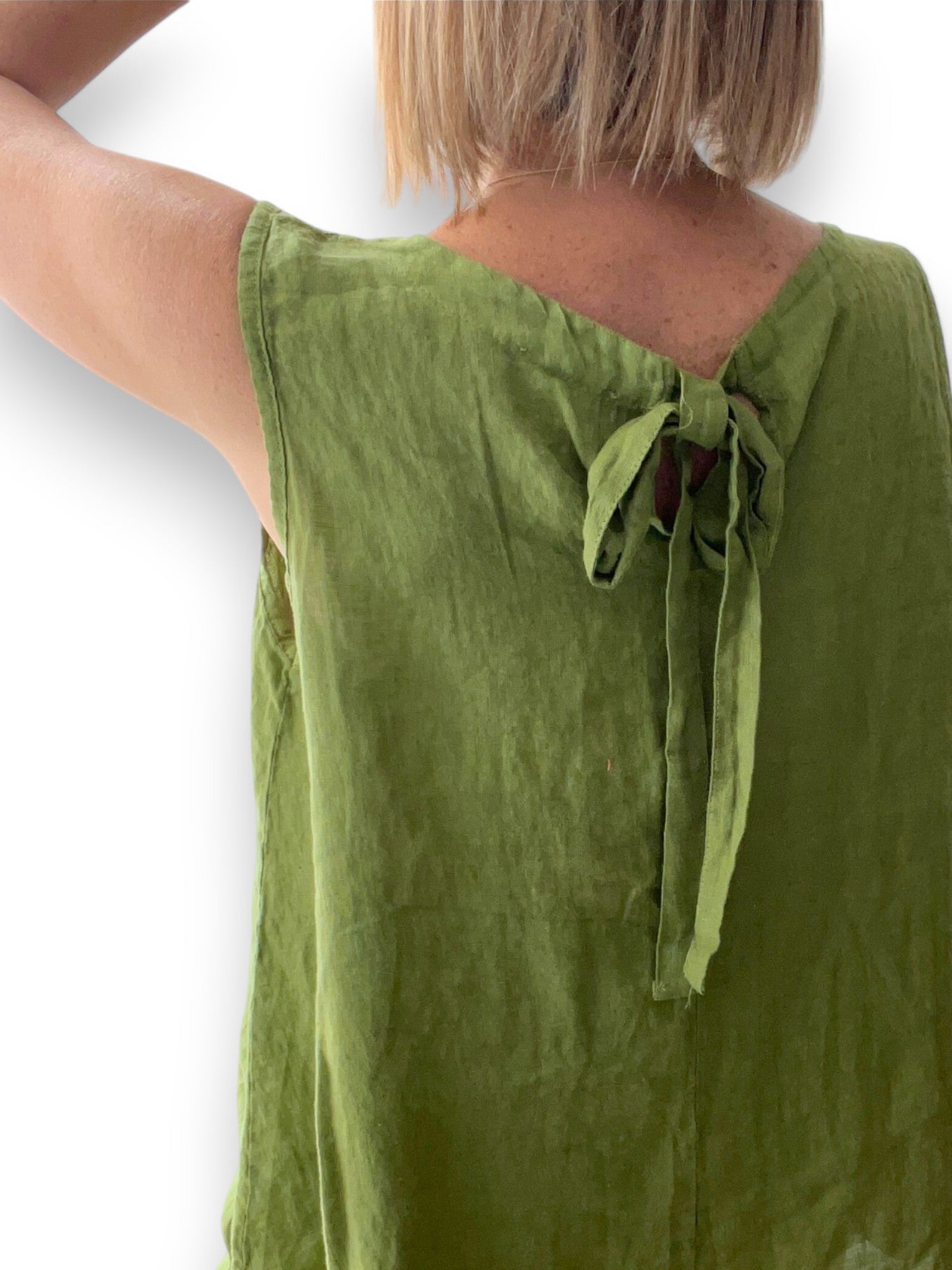La espalda se convierte en protagonista gracias al lazo ajustable, que no solo aporta un toque delicado y femenino, sino que permite adaptar el ajuste con comodidad. El lino natural ofrece una textura fresca y aireada que respira con el cuerpo y se mueve con ligereza.