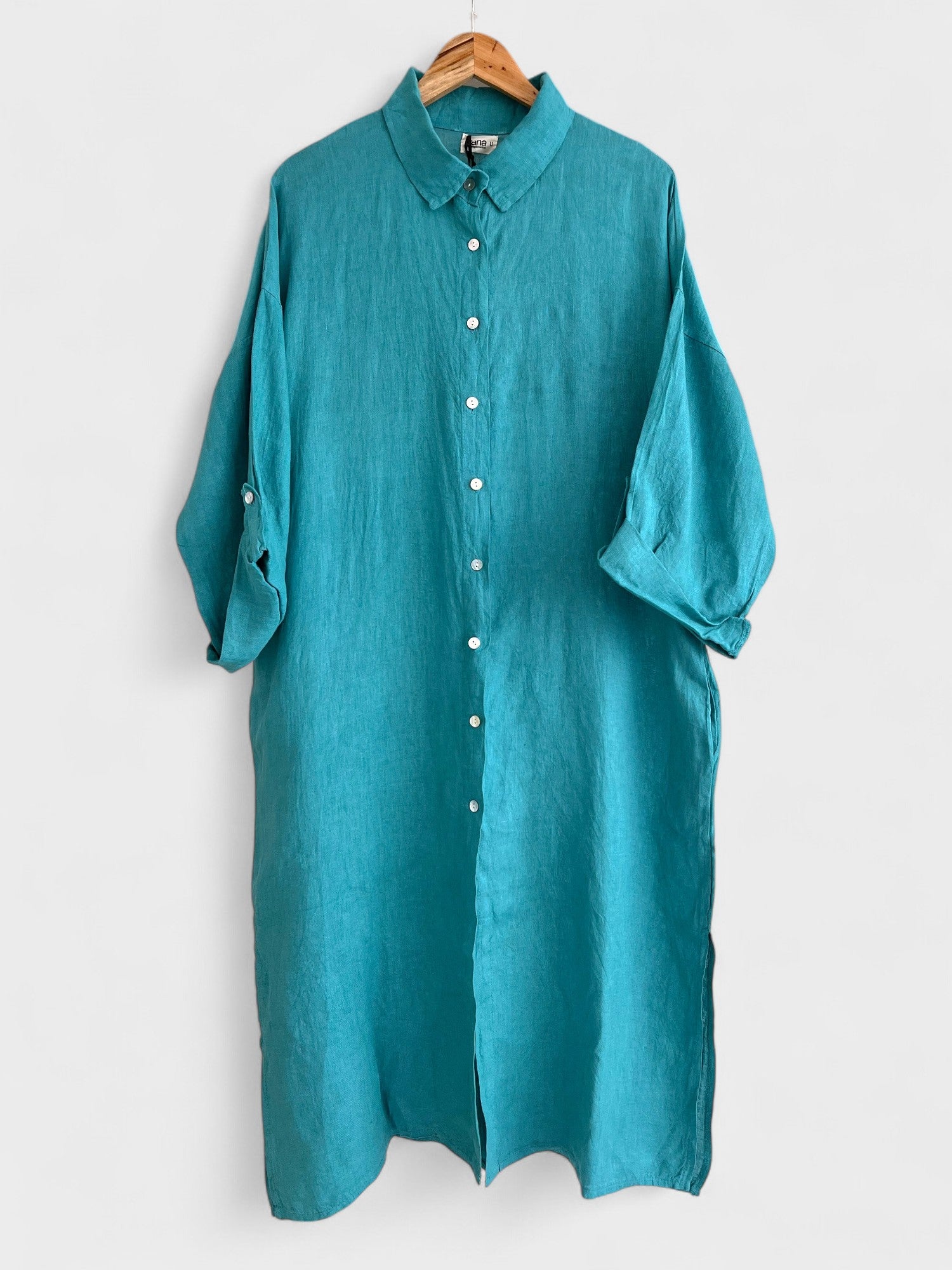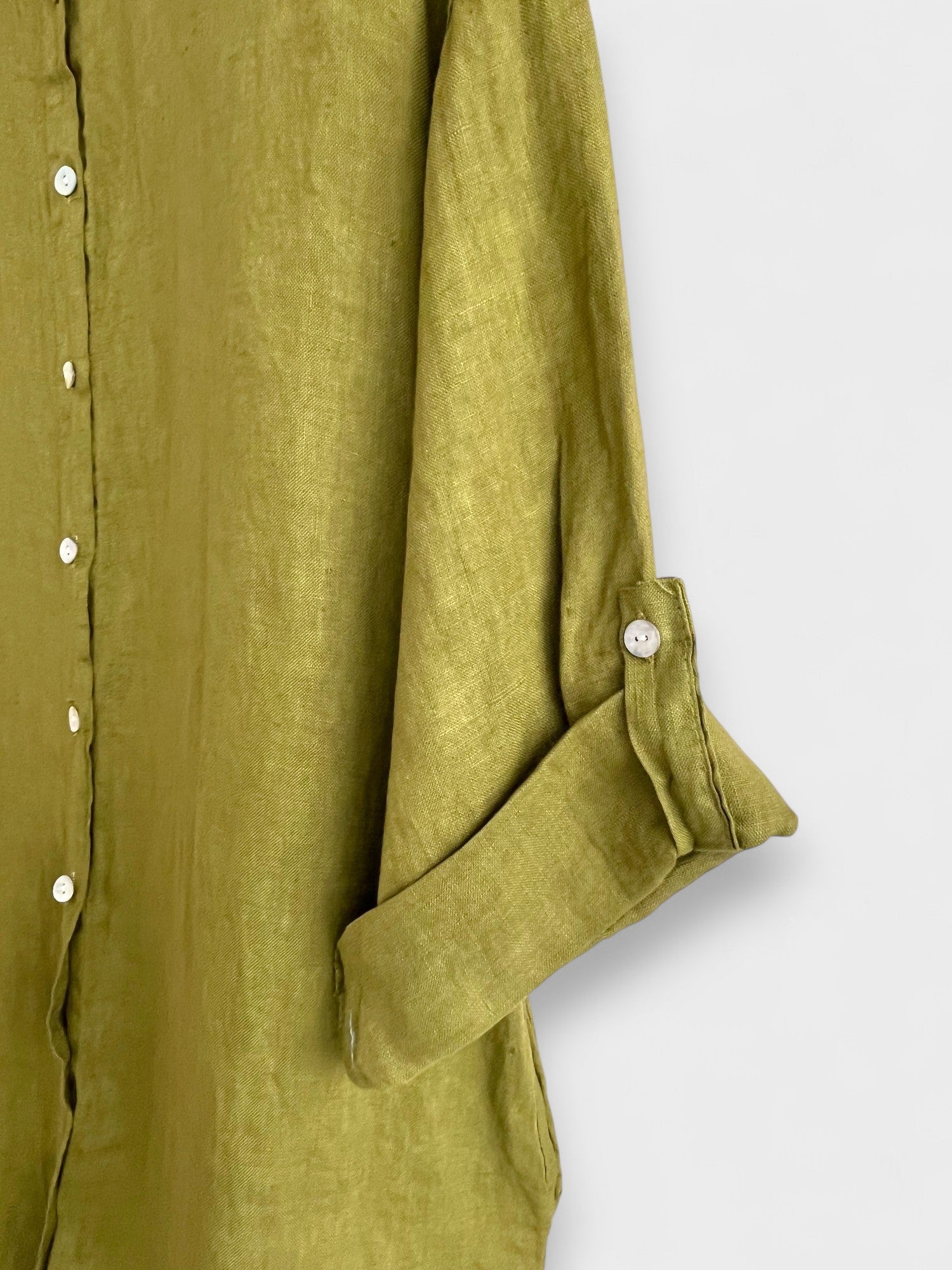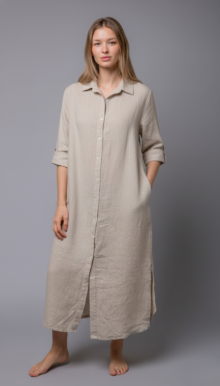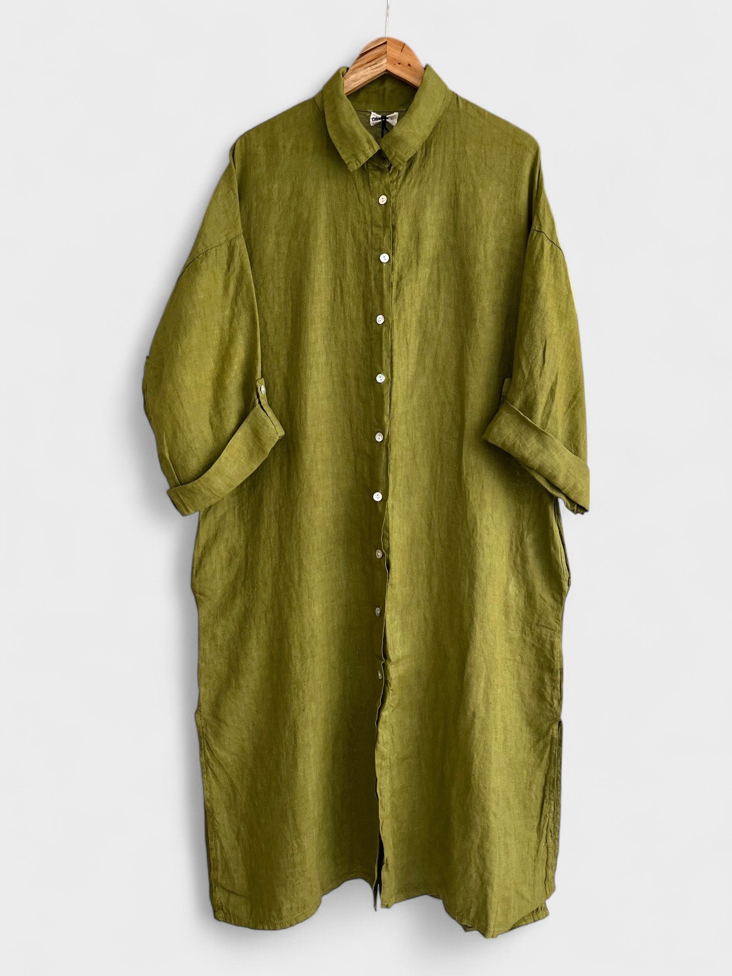 Confeccionado en lino italiano y fabricado en Italia, este vestido camisero presenta una silueta oversize que cae con suavidad y movimiento. Su estructura amplia brinda comodidad sin perder la elegancia.