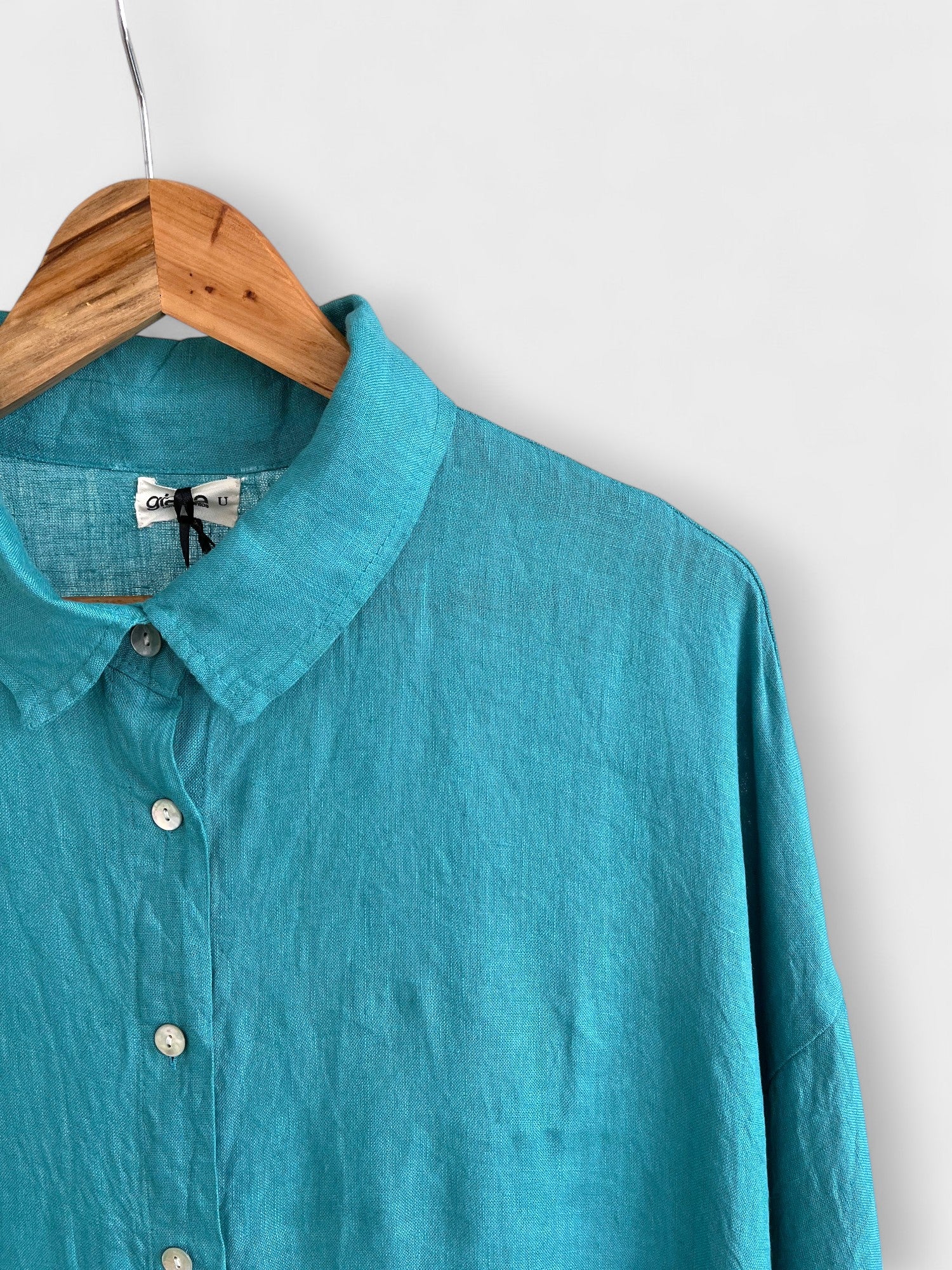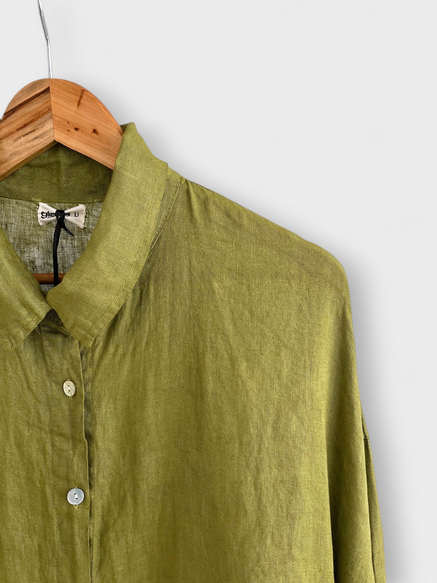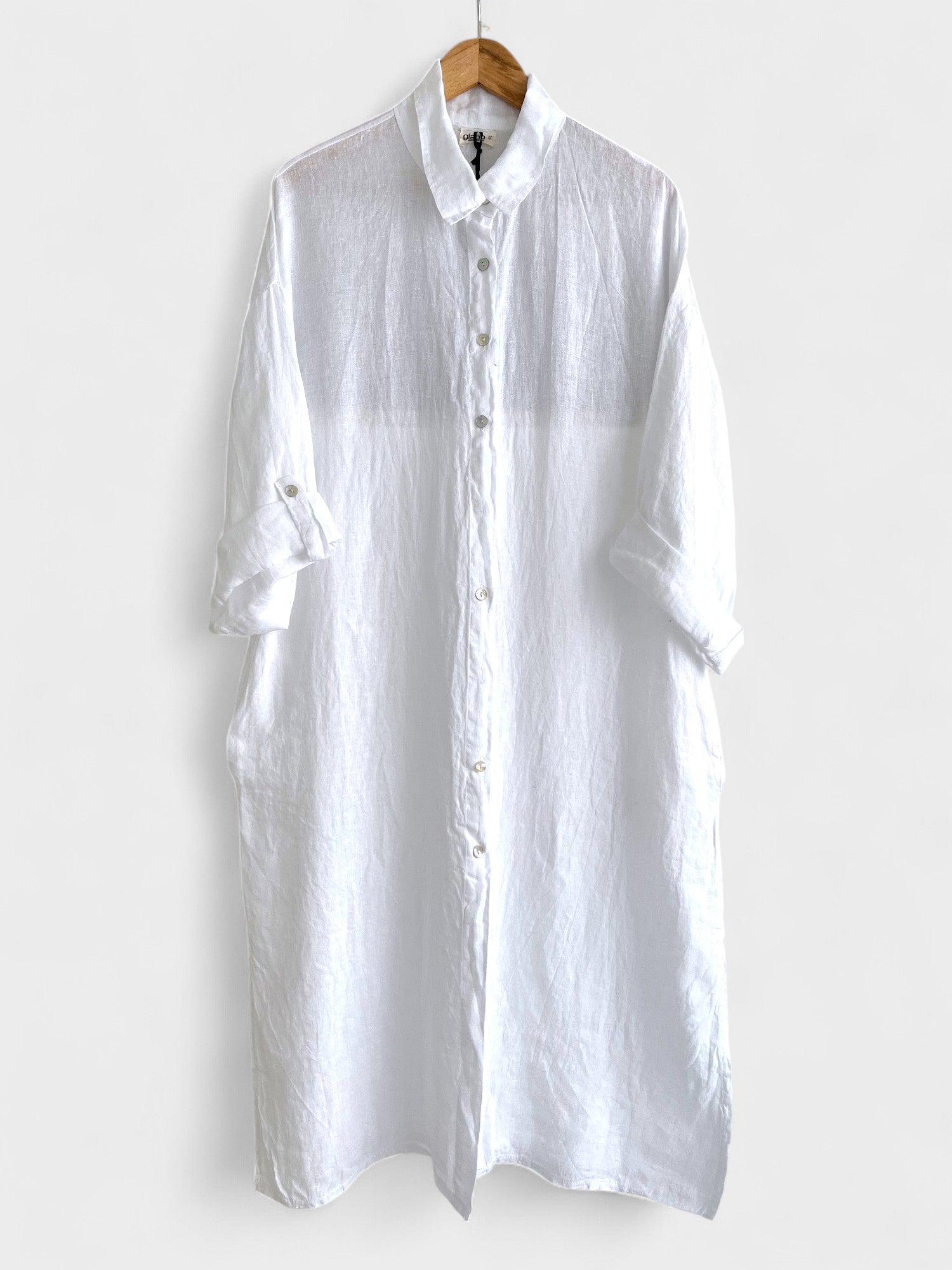 Confeccionado en lino italiano y fabricado en Italia, este vestido camisero presenta una silueta oversize que cae con suavidad y movimiento. Su estructura amplia brinda comodidad sin perder la elegancia.