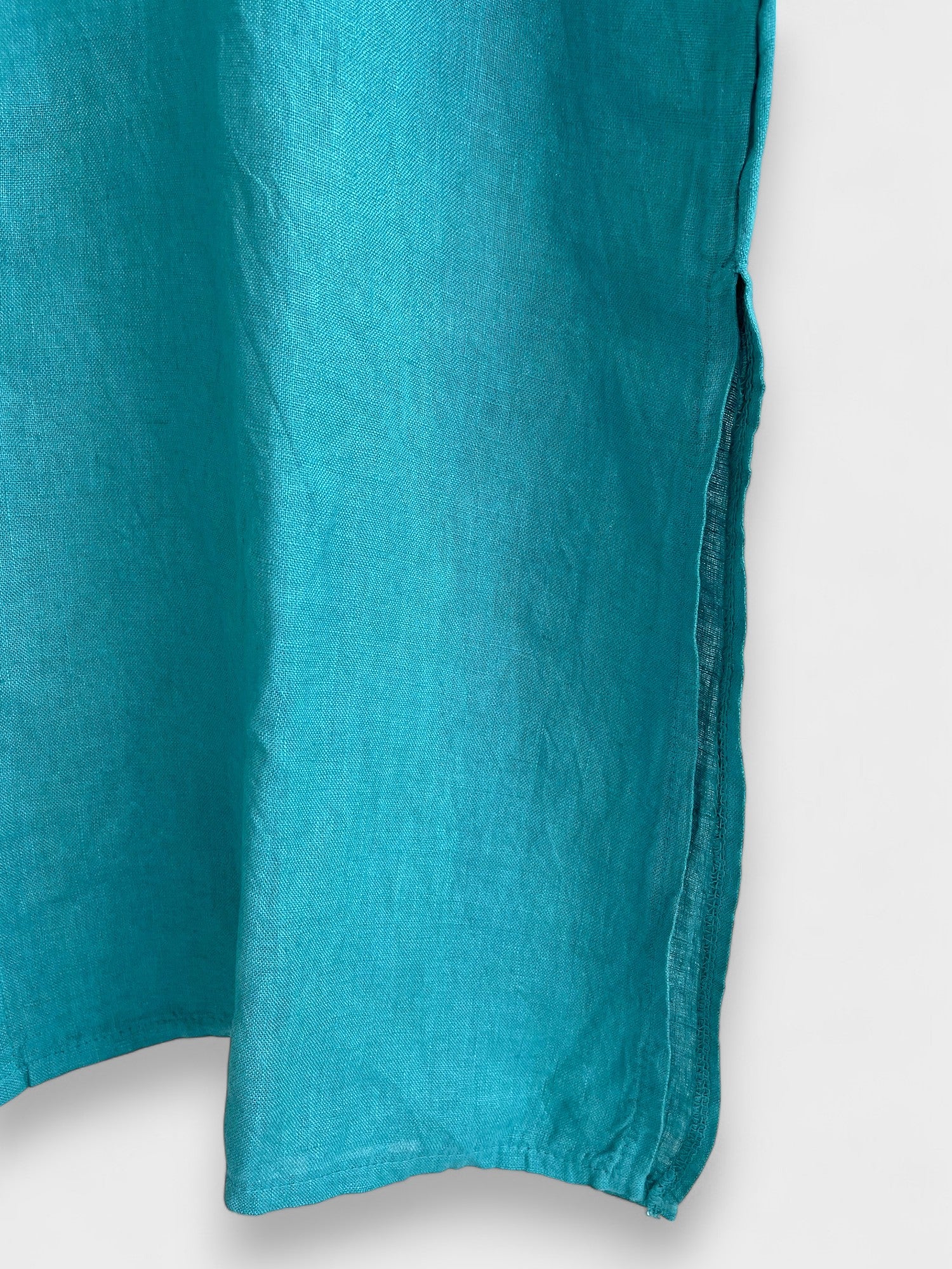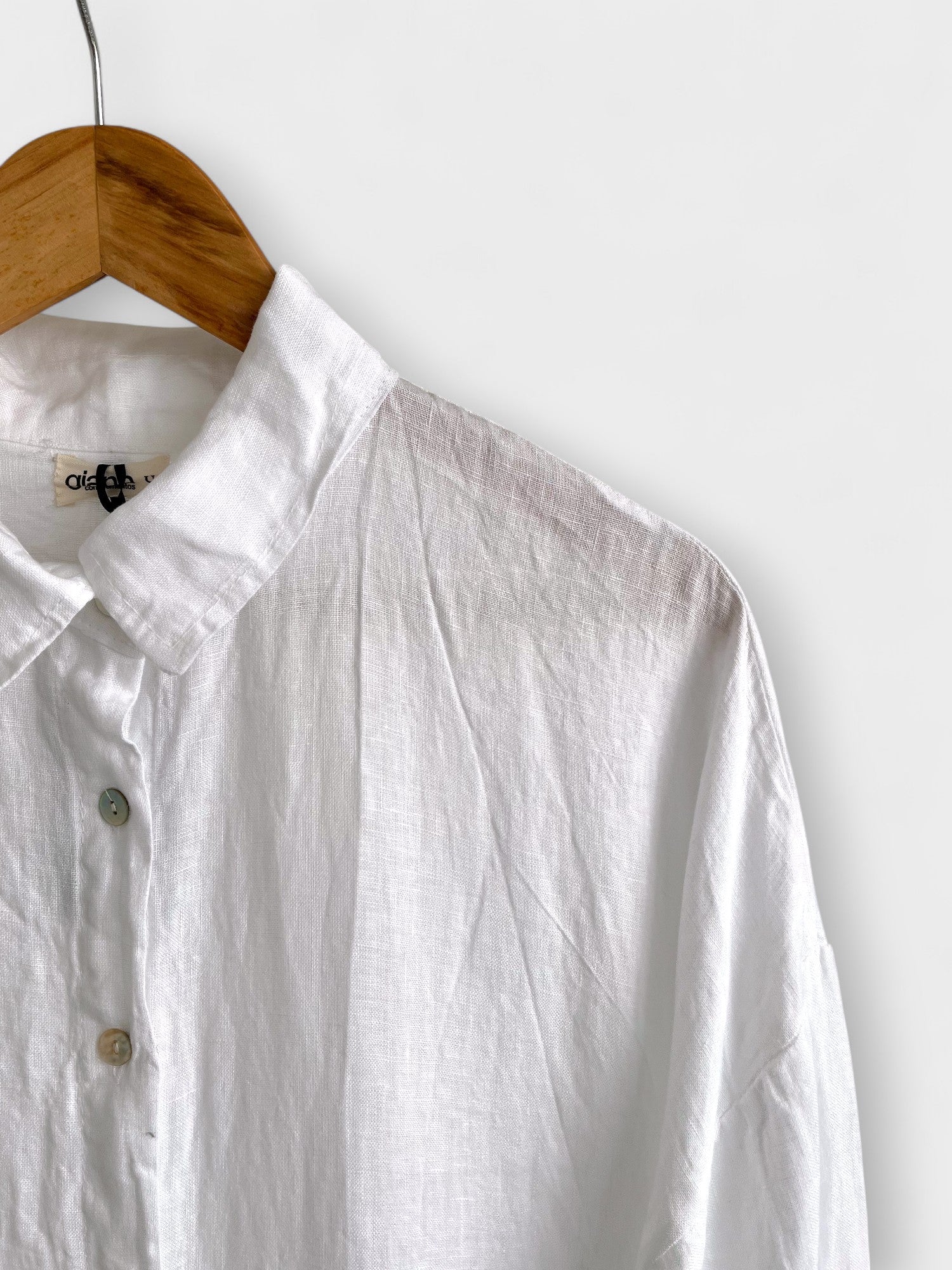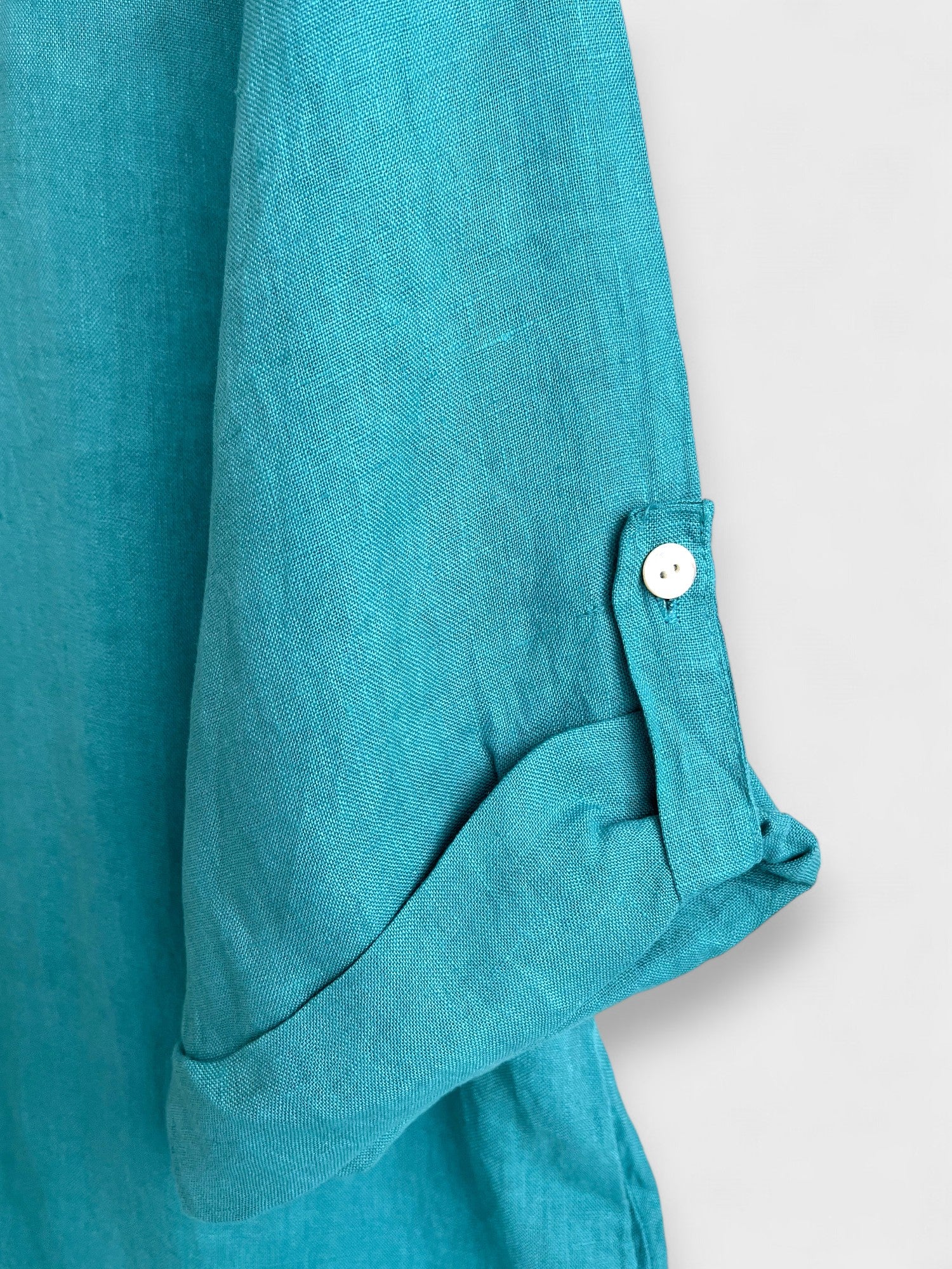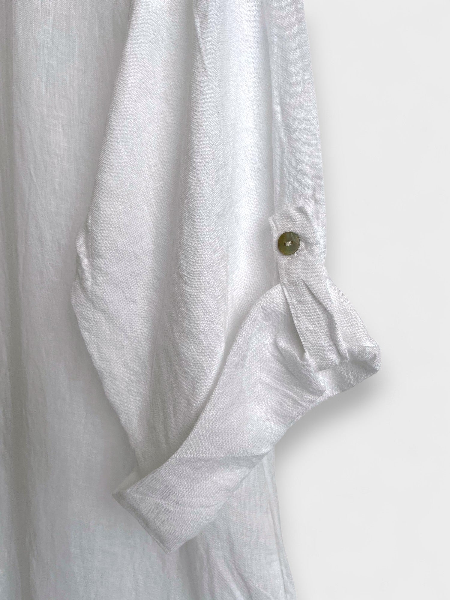 Confeccionado en lino italiano y fabricado en Italia, este vestido camisero presenta una silueta oversize que cae con suavidad y movimiento. Su estructura amplia brinda comodidad sin perder la elegancia.